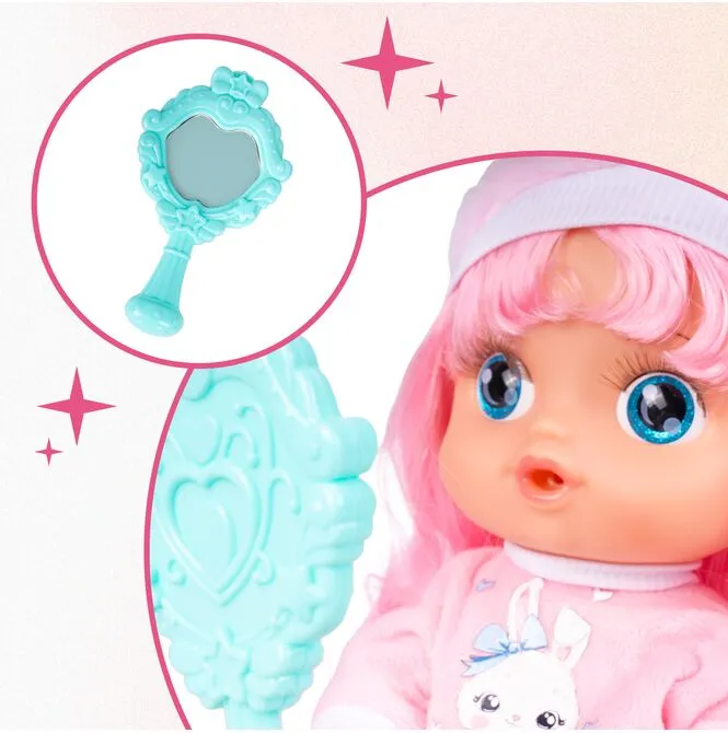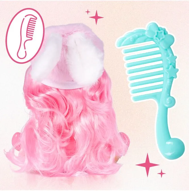 Długie, różowe włosy aż proszą się o stylizacje. W komplecie znajdziesz grzebyk i lusterko – mała stylistka stworzy loki, przedziałki i upięcia.