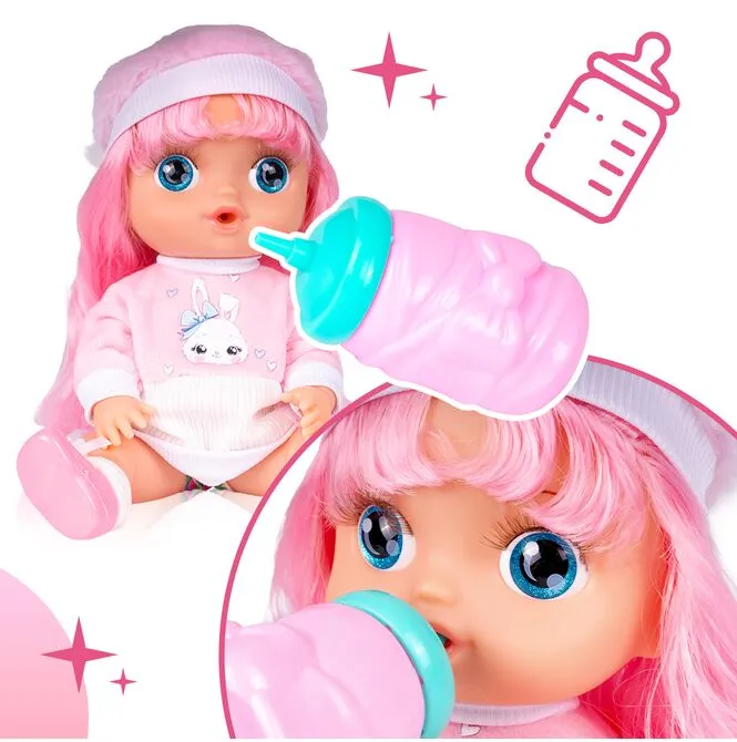 Napełnij dołączoną butelkę (np. wodą – tylko do zabawy) i odegraj scenkę karmienia. To bezpieczna, prosta czynność, która pomaga naśladować opiekę nad dzidziusiem bez funkcji siusiu.