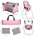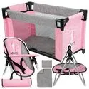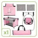 - Funkcje: łóżeczko turystyczne + dwustronna pościel; krzesełko do karmienia; huśtawka