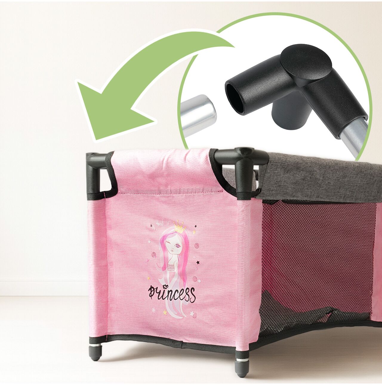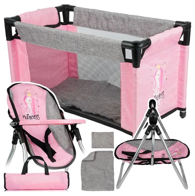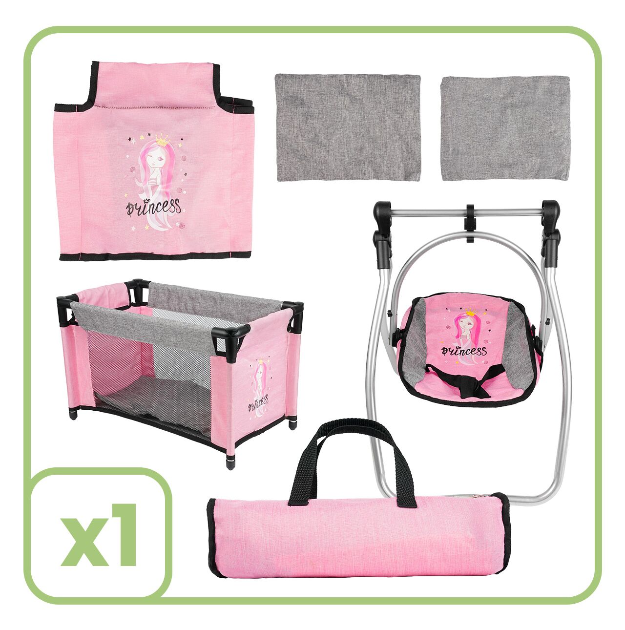 Łóżeczko z zestawu Princess PinkGrey stanowi atrakcyjną ozdobę dziecięcego pokoiku. Może służyć także jako kojec dla lalek lub schowek na zabawki i pluszaki, a moduł 2w1 (krzesełko do karmienia/huśtawka) dodaje nowe scenariusze zabawy. Pasuje do większości popularnych lalek do 46cm.
