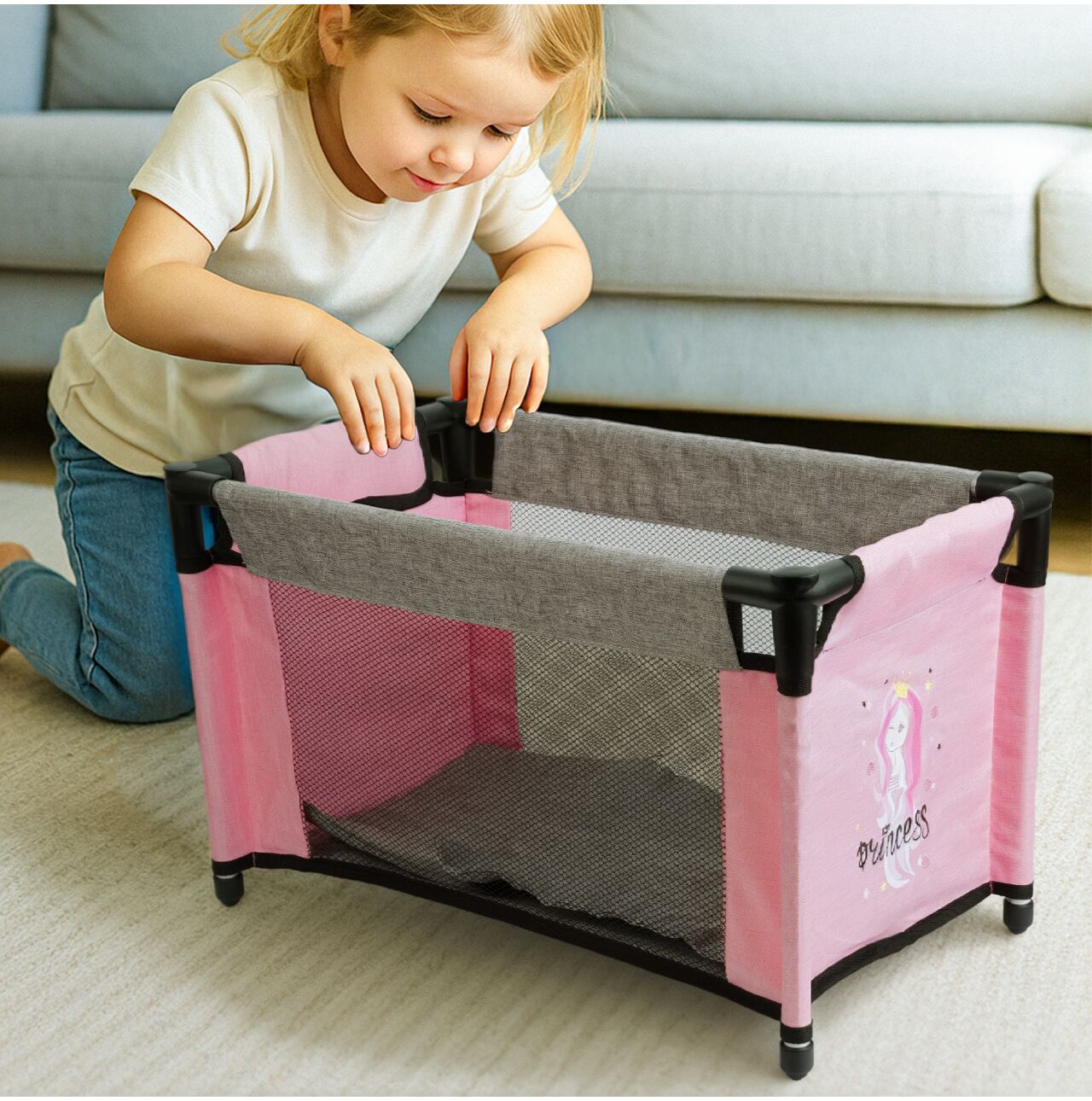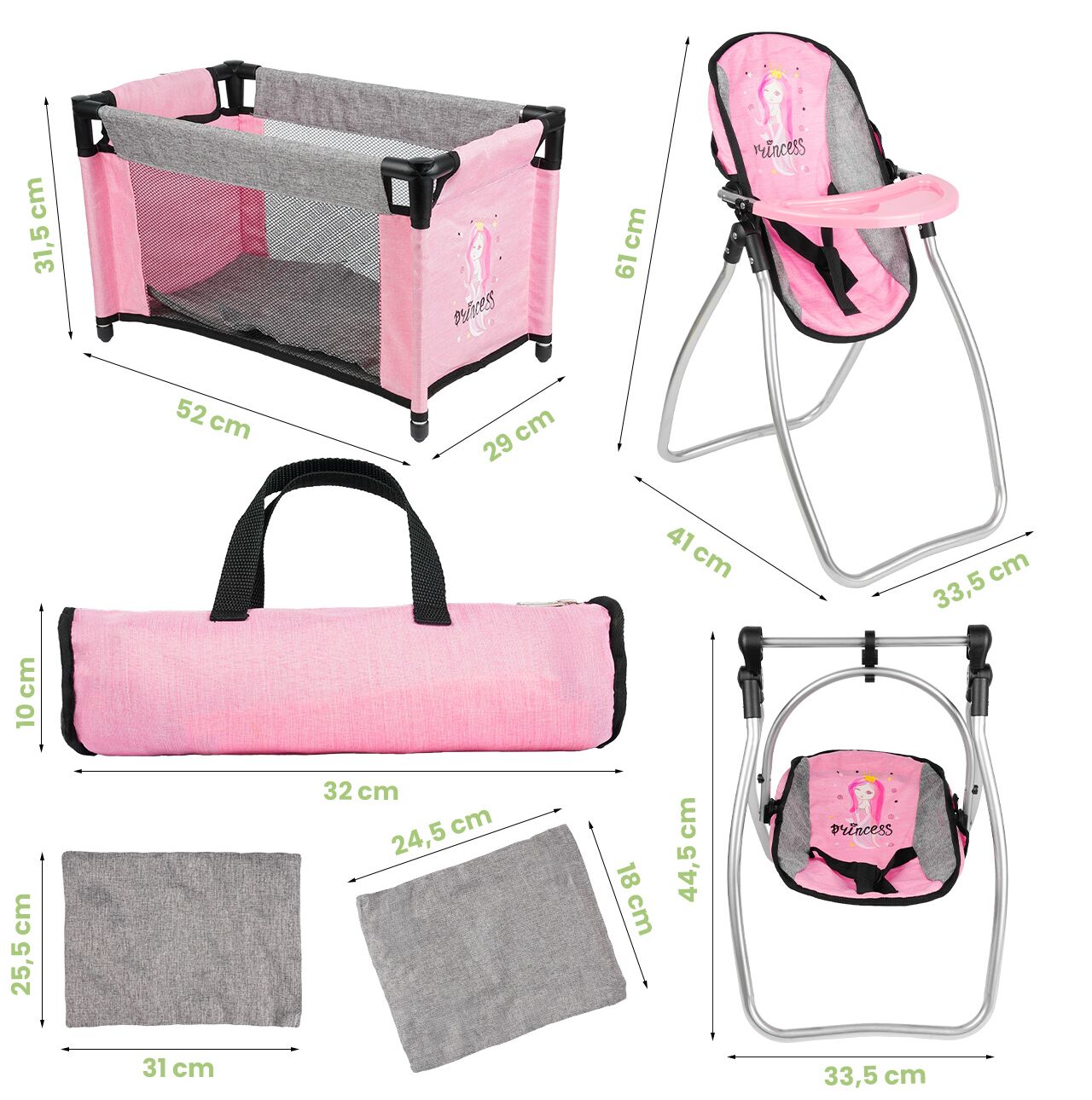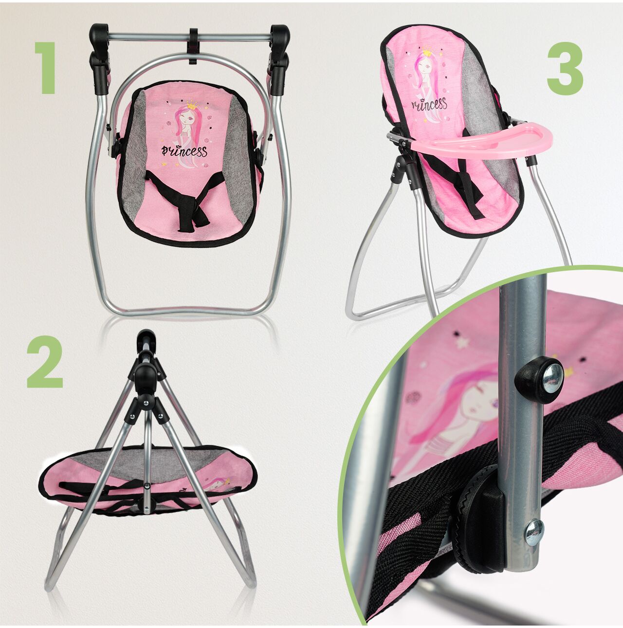 Łóżeczko z zestawu Princess PinkGrey stanowi atrakcyjną ozdobę dziecięcego pokoiku. Może służyć także jako kojec dla lalek lub schowek na zabawki i pluszaki, a moduł 2w1 (krzesełko do karmienia/huśtawka) dodaje nowe scenariusze zabawy. Pasuje do większości popularnych lalek do 46cm.