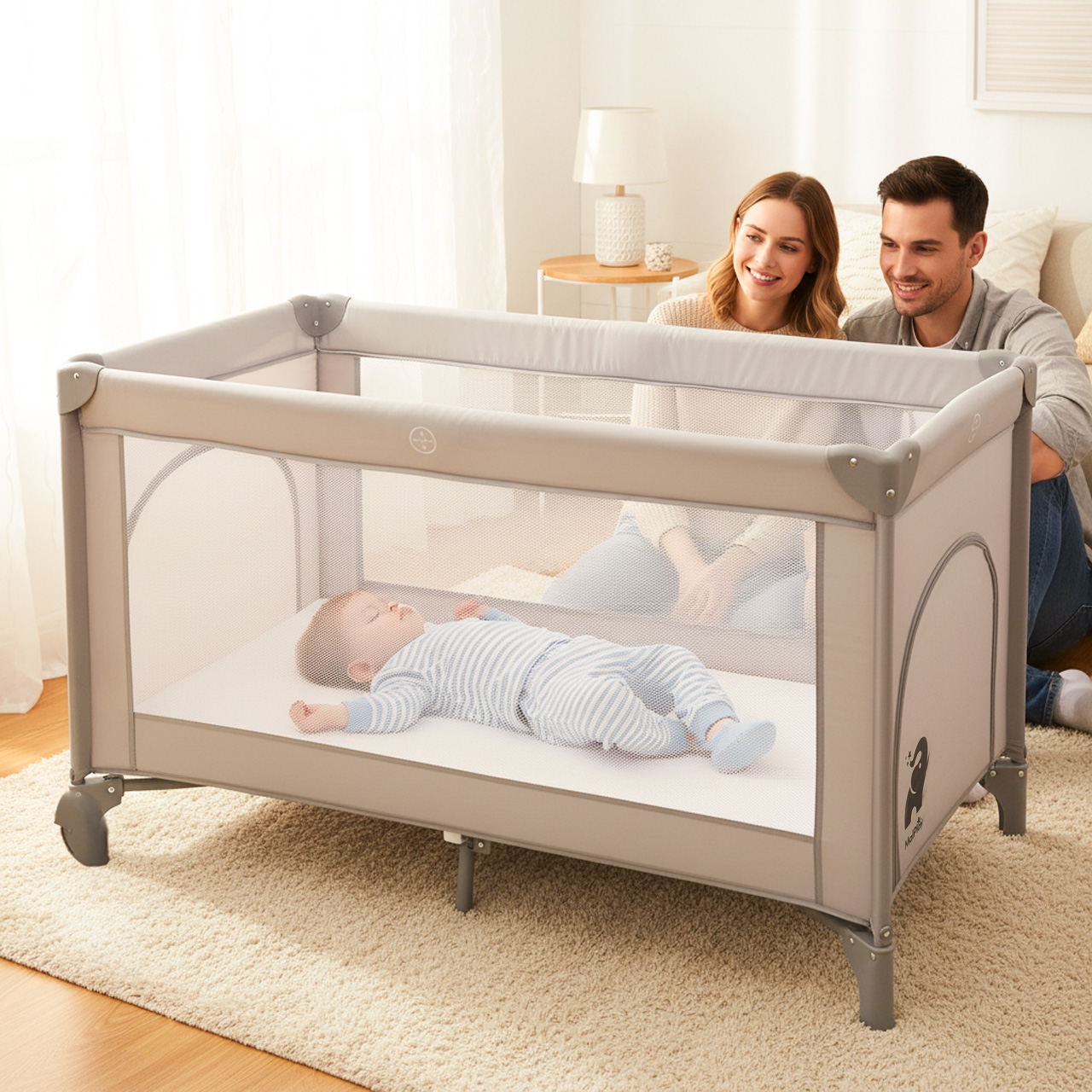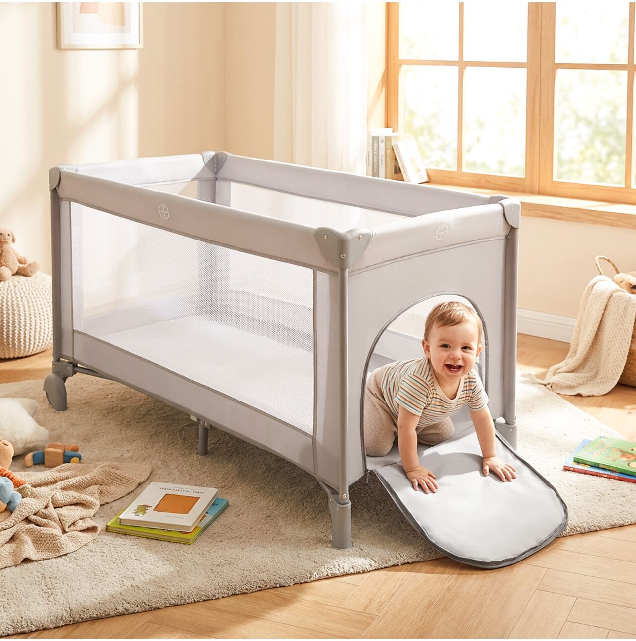 LUNO to nie tylko łóżeczko, ale także przenośny kojec. W ciągu dnia może pełnić funkcję bezpiecznego miejsca do zabawy – miękka podłoga, zamknięta przestrzeń i przewiewne ścianki sprawiają, że dziecko może bawić się komfortowo, a Ty masz chwilę spokoju.