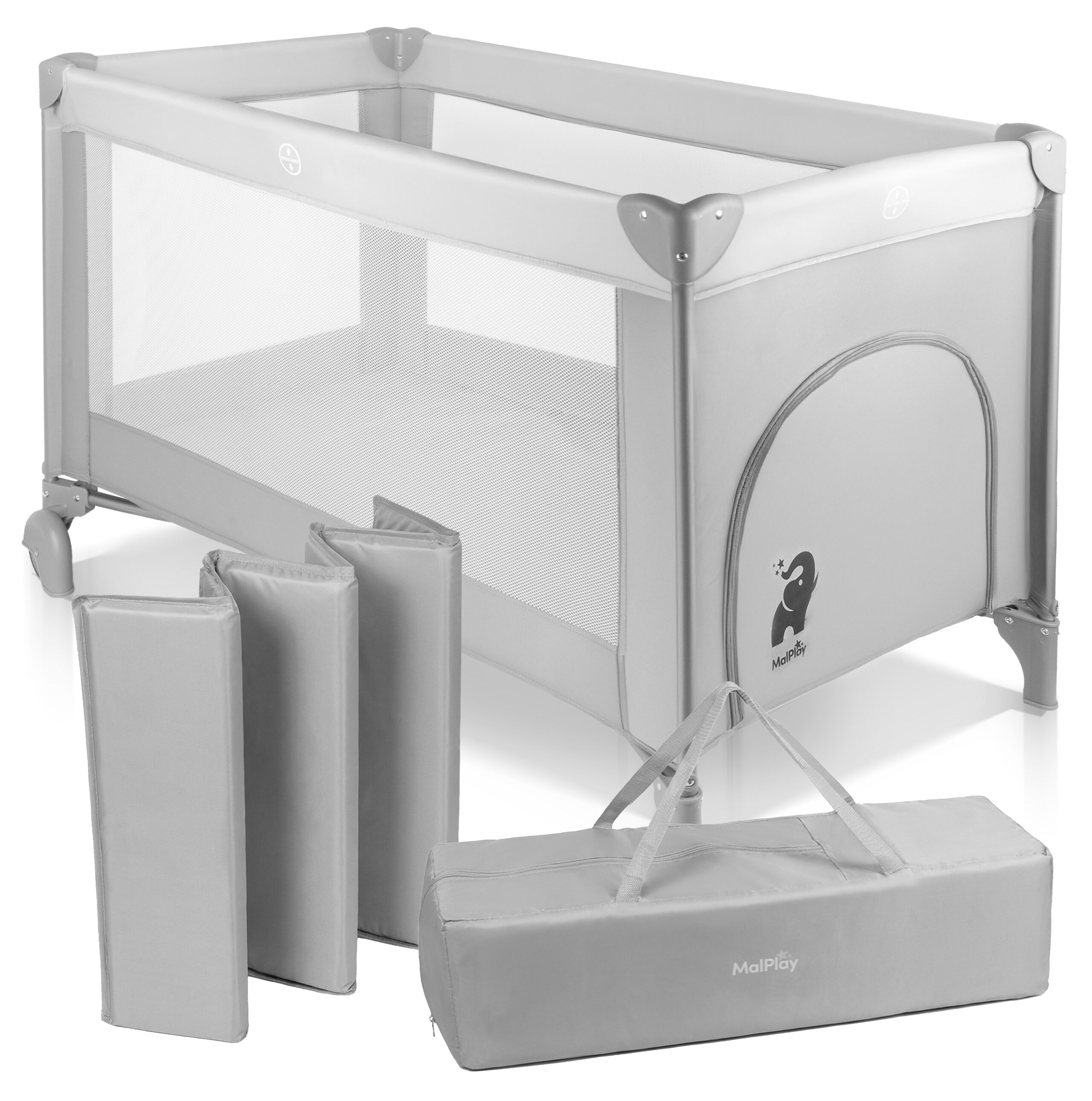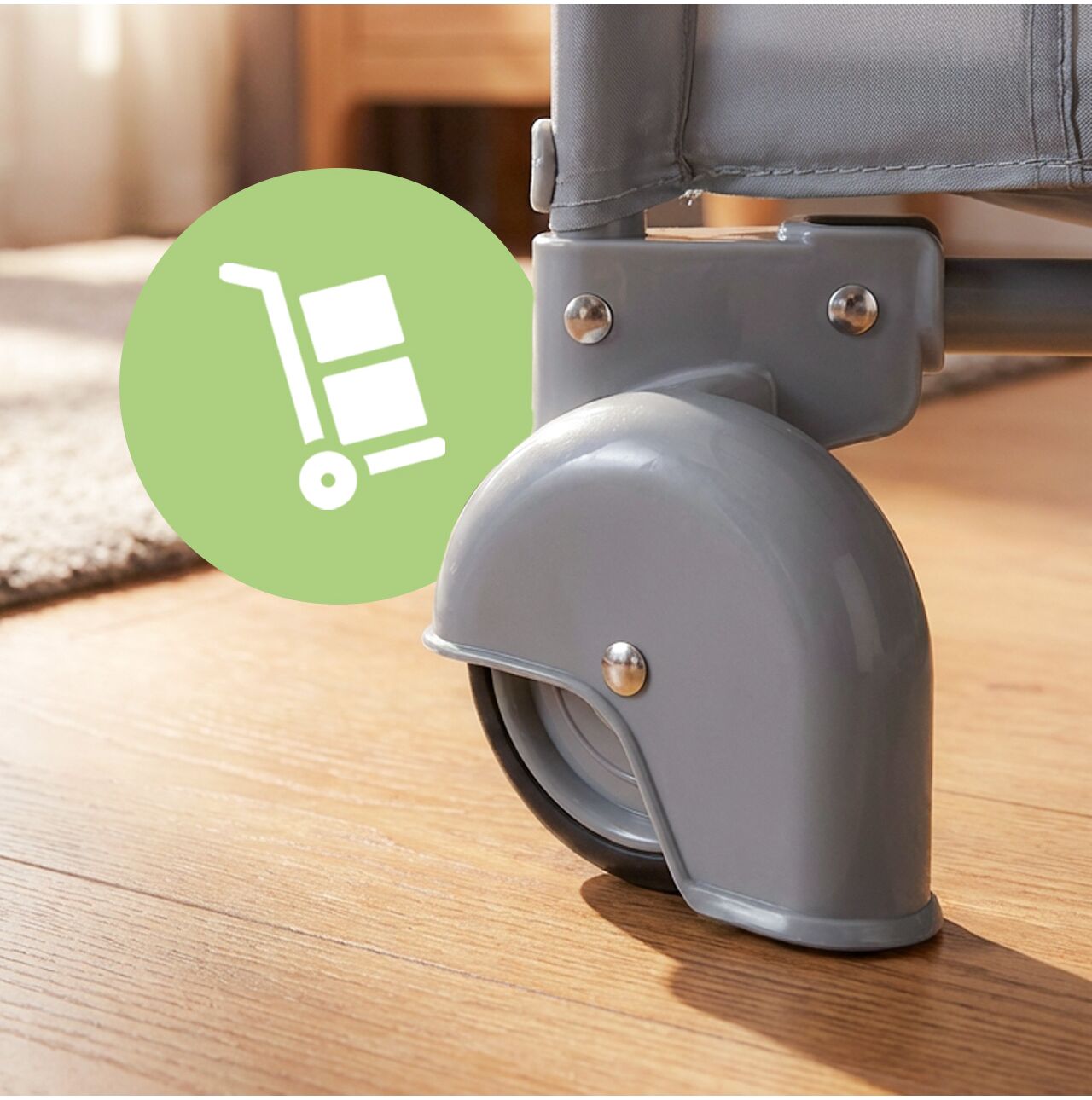 - 2 kółka transportowe, które pozwalają na łatwe przesuwanie łóżeczka po mieszkaniu lub zabraniu go na wyjazd