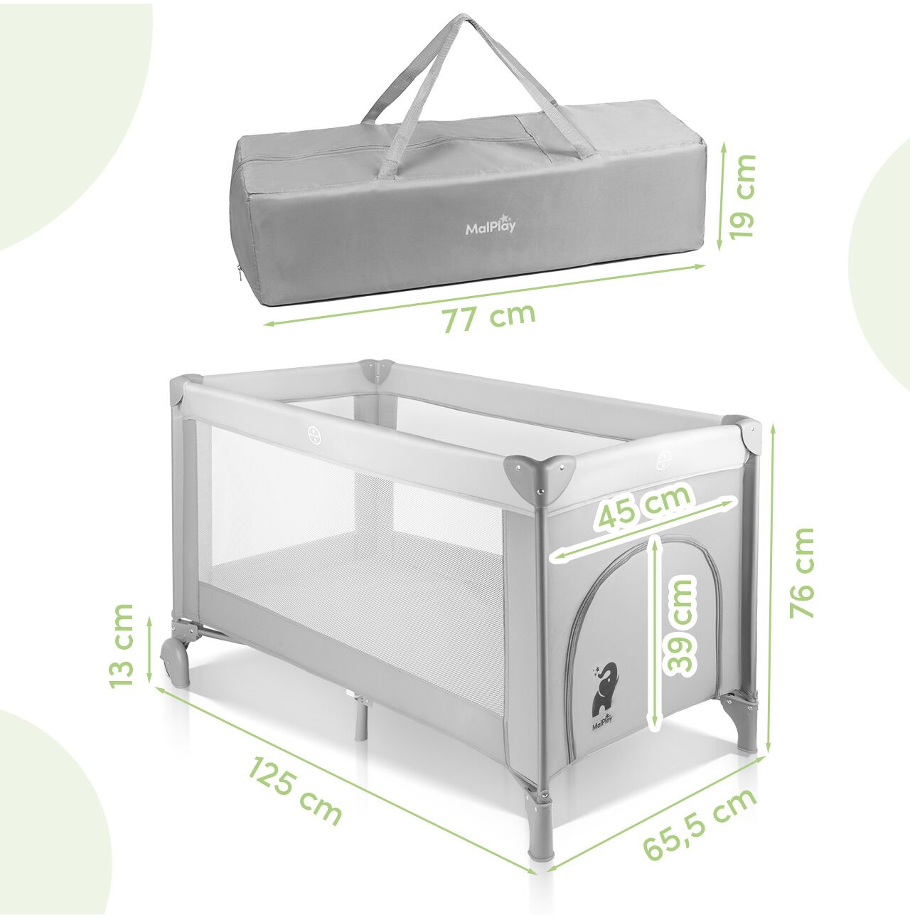 - Wymiary łóżeczka po rozłożeniu: 125 x 65,5 x 76 cm