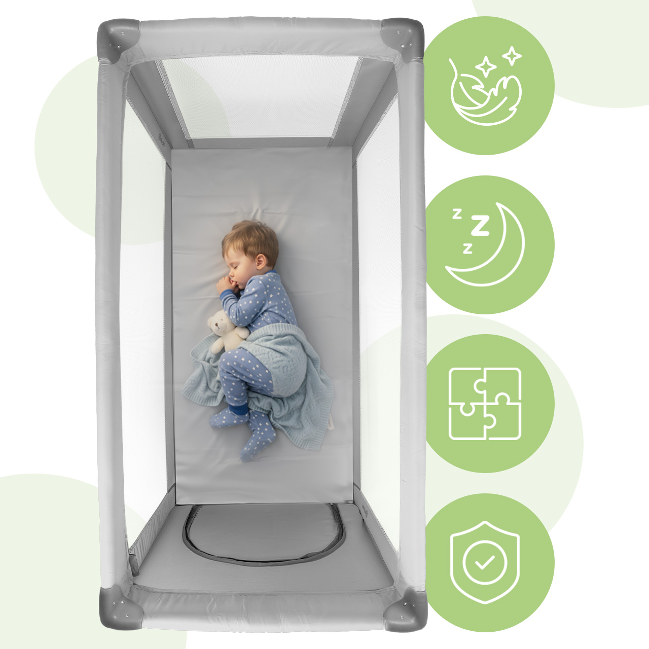 - 3 przewiewne ścianki z siateczki – doskonała wentylacja i stała kontrola nad dzieckiem