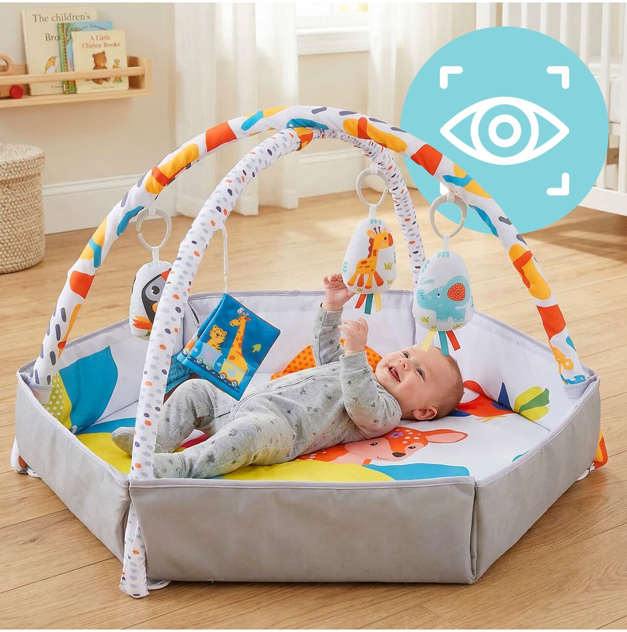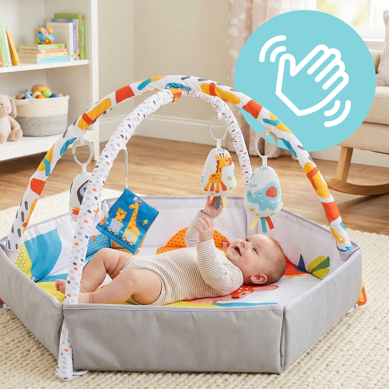 Kolorowe zawieszki zachęcają dziecko do patrzenia, wyciągania rączek i pierwszych prób chwytania. To właśnie takie elementy najmocniej wspierają rozwój koordynacji wzrokowo-ruchowej oraz naturalnej ciekawości. Maluszek nie tylko leży, ale aktywnie poznaje kolory, kształty i ruch.