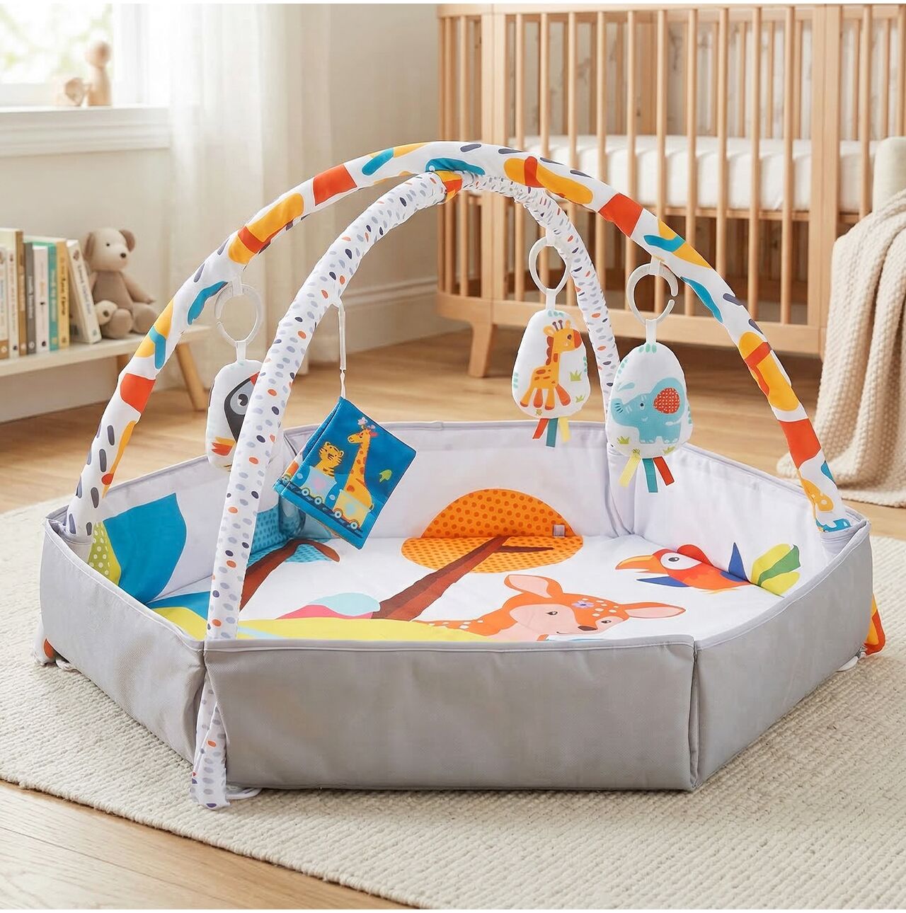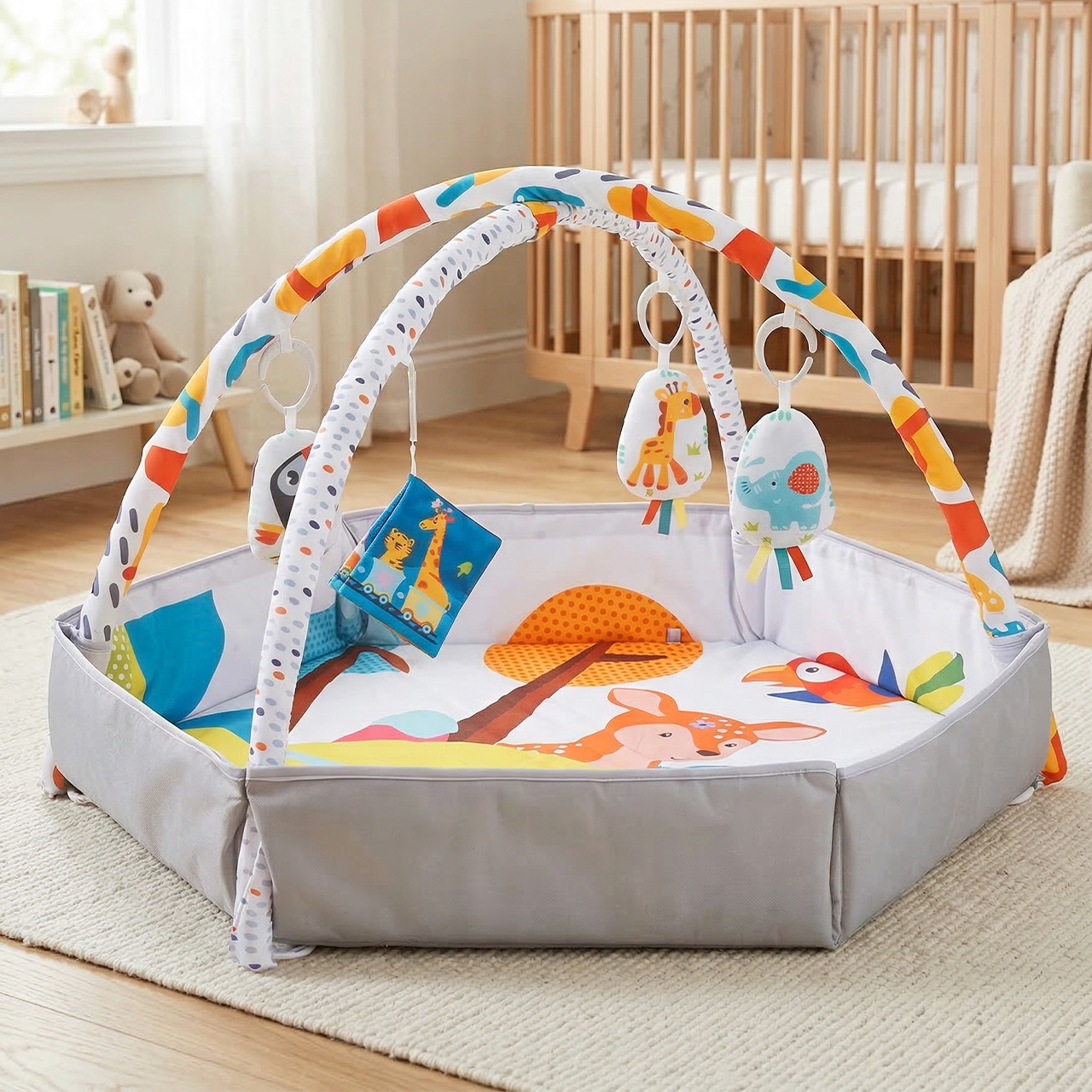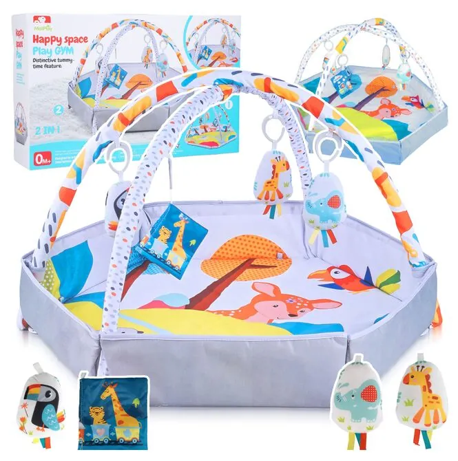 To nie jest zwykła mata, ale praktyczne rozwiązanie 2w1. Dziecko może korzystać z niej zarówno jako z klasycznej maty edukacyjnej z pałąkami, jak i z wydzielonej strefy zabawy z bokami. Dzięki temu produkt dobrze dopasowuje się do etapu rozwoju malucha i daje więcej możliwości już od pierwszych miesięcy.