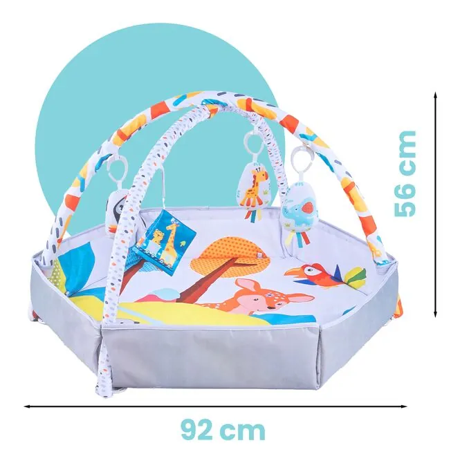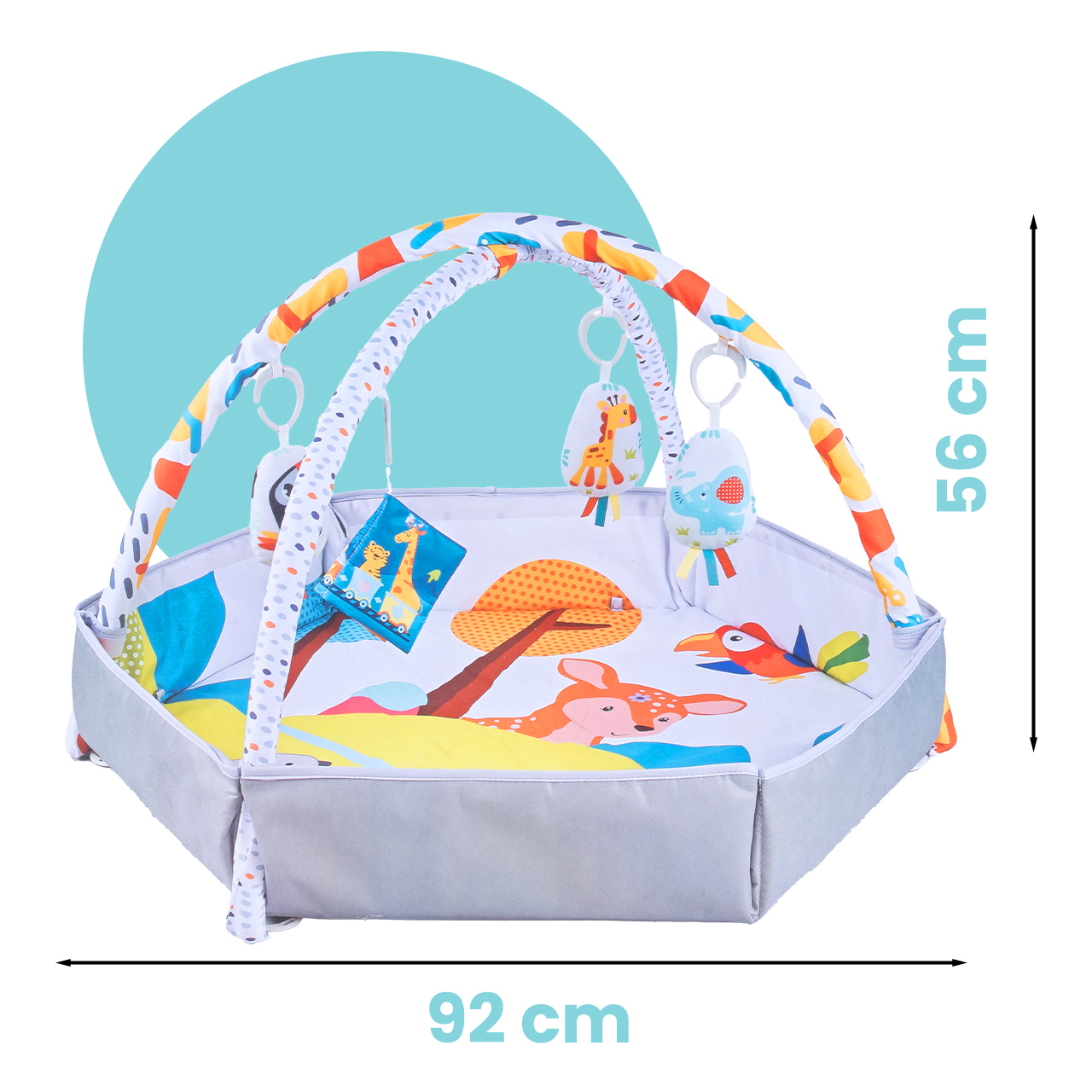 Powierzchnia około 92 x 92 cm zapewnia maluszkowi swobodę ruchów, a wysokość około 56 cm z pałąkami daje odpowiednią przestrzeń do zawieszenia zabawek. To rozmiar, który dobrze sprawdza się w codziennym użytkowaniu, nie zajmując przy tym przesadnie dużo miejsca w pokoju.