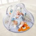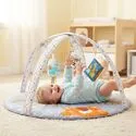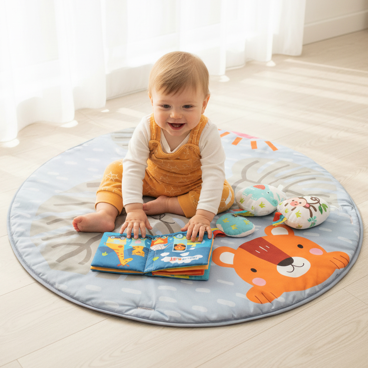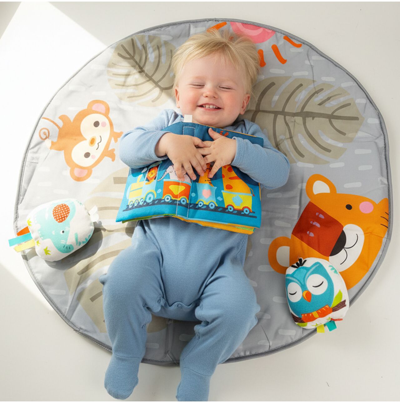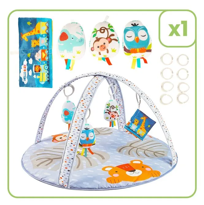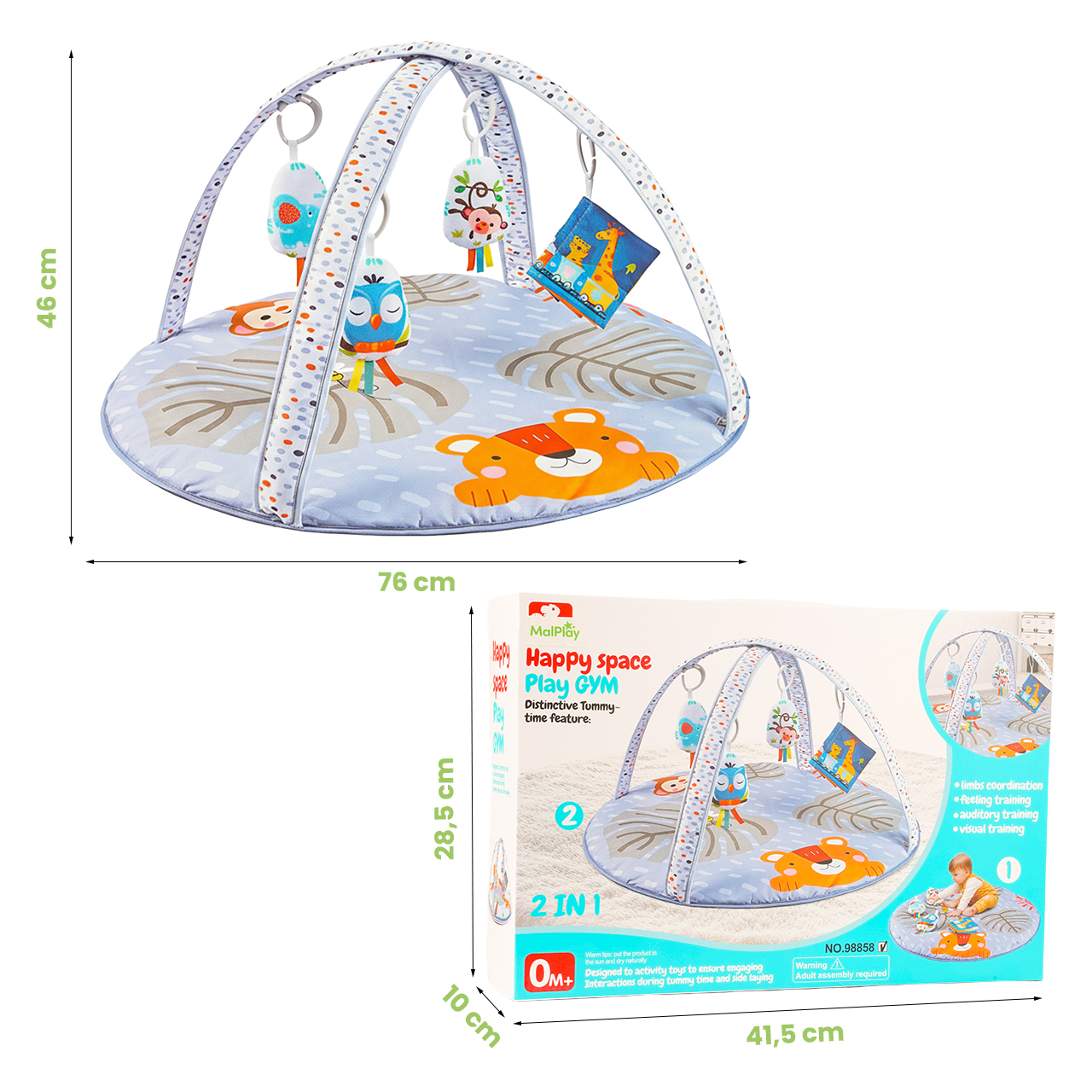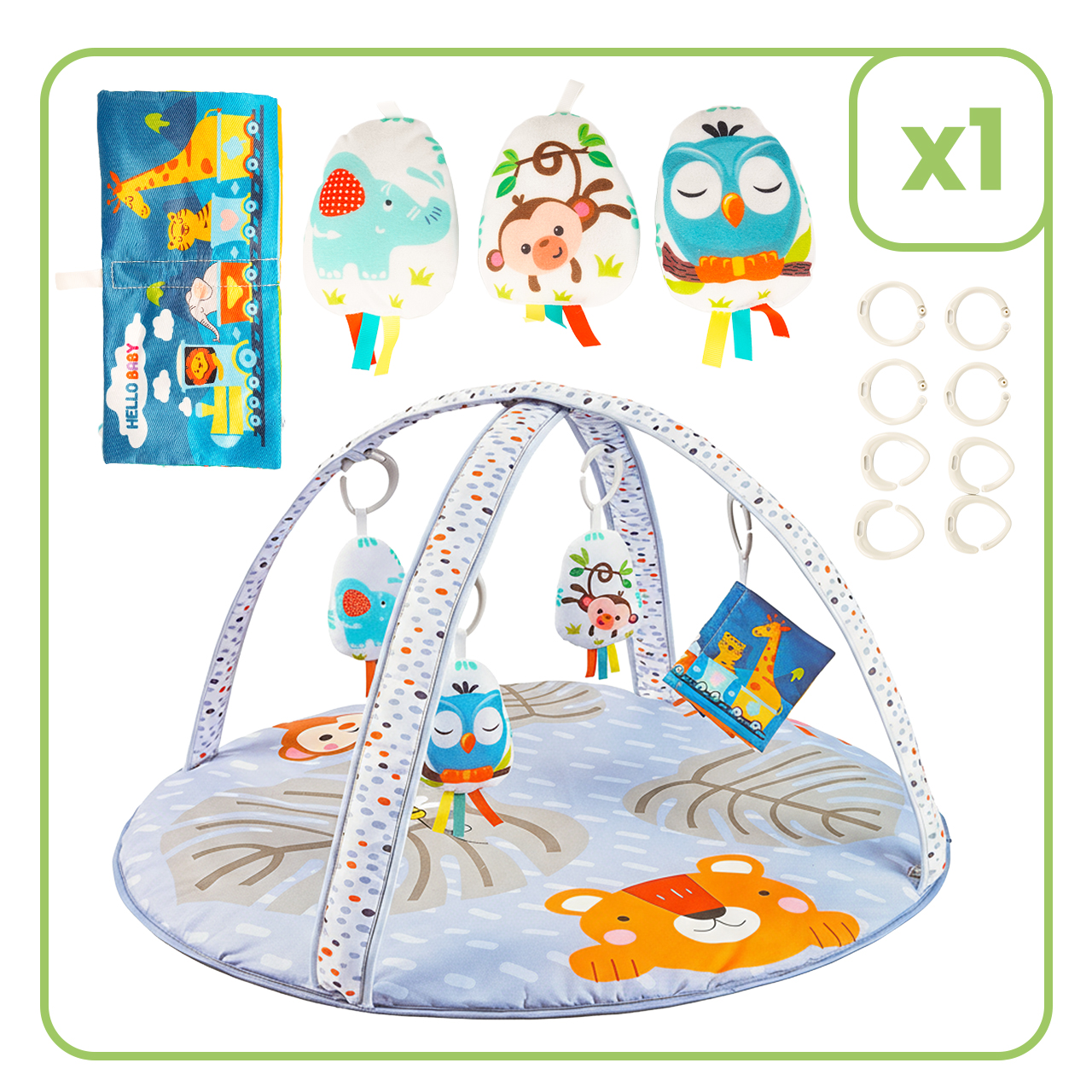Na pałąkach zawieszone są pluszowe zwierzątka i miękka książeczka. Każda zabawka ma inny wzór. Maluszek ćwiczy koordynację wzrokowo–ruchową, próbuje chwytać, przyciągać do siebie i poznaje związki przyczynowo–skutkowe („dotykam – zabawka się rusza”). Takie aktywności to ważny krok w rozwoju dłoni i paluszków.