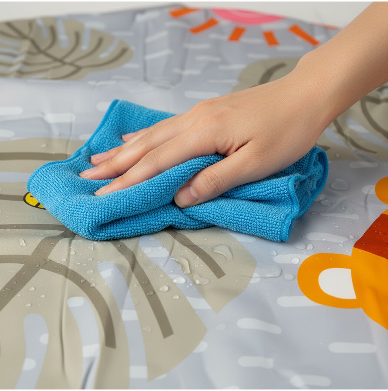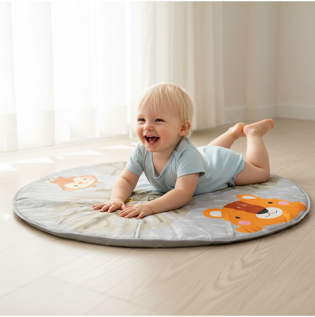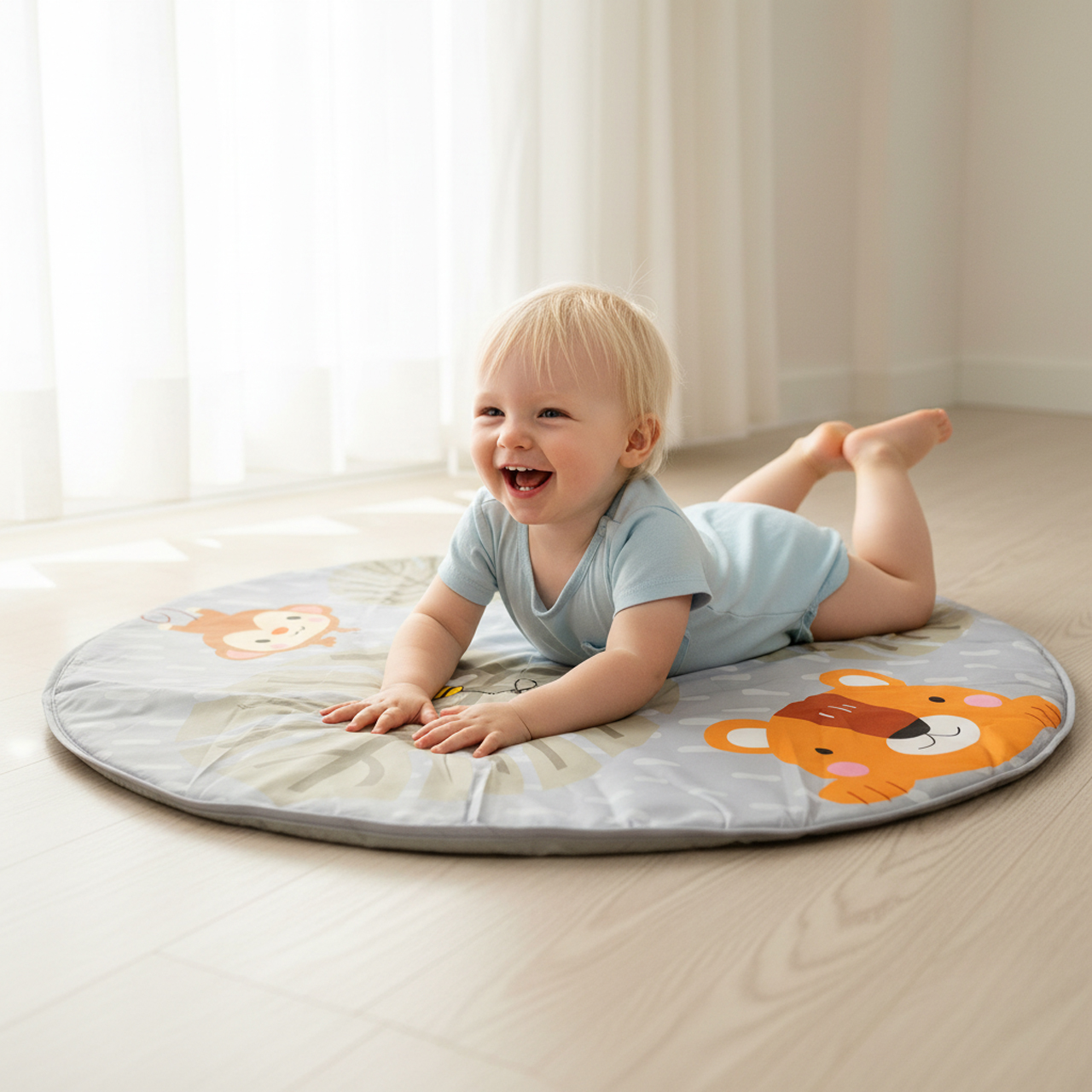 Mata edukacyjna Happy Space Play Gym Zwierzątka tworzy mięciutką, wydzieloną strefę, w której maluszek może leżeć na plecach lub brzuszku. Delikatny materiał jest przyjazny dla wrażliwej skóry niemowlęcia, a grubsze wypełnienie chroni przed chłodem podłogi. Rodzice zyskują pewność, że dziecko bawi się w bezpiecznym miejscu – bez ostrych krawędzi, twardych elementów czy drobnych części.