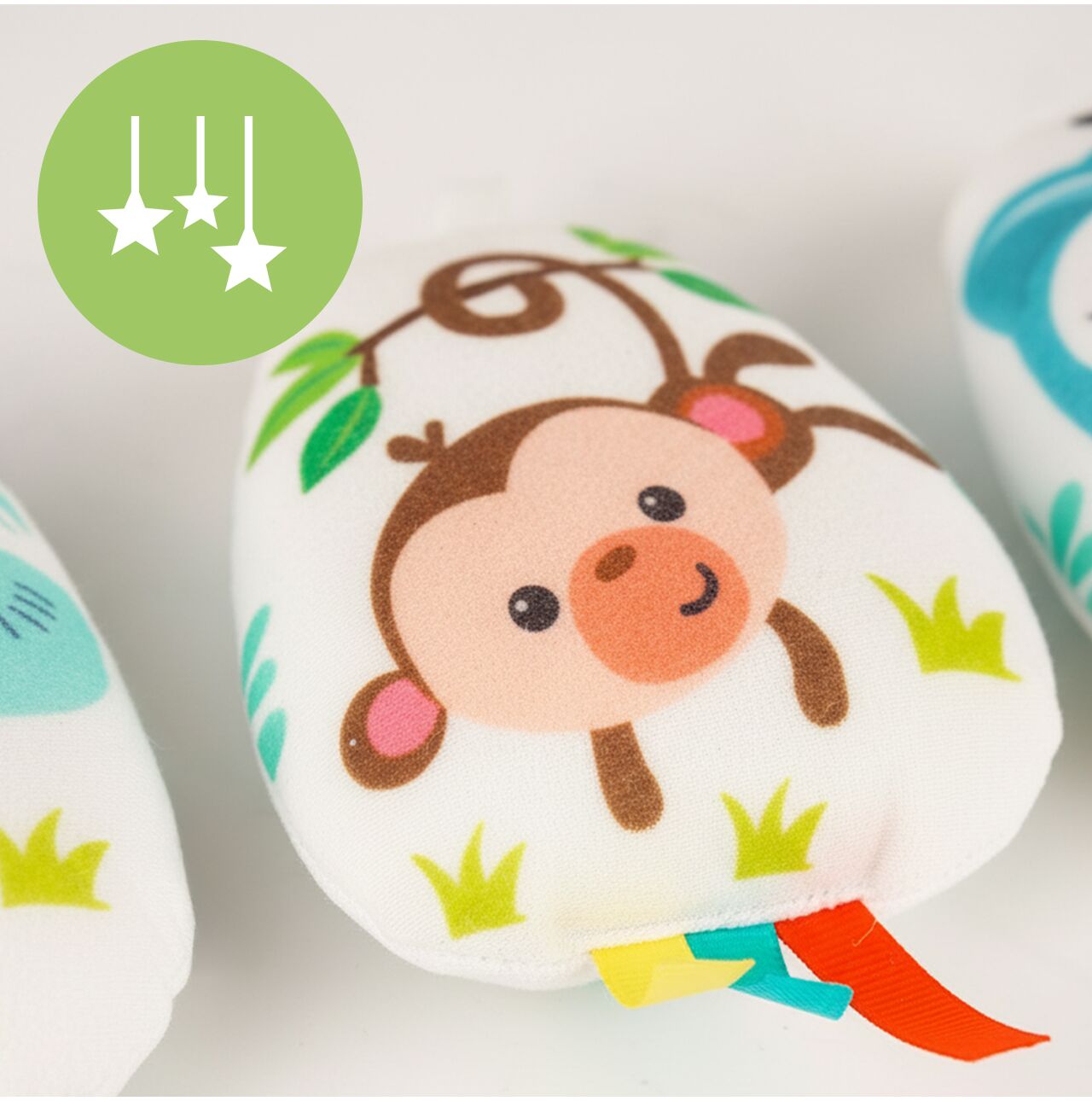 - Rozwój koordynacji i zmysłów – kontrastowe, kolorowe zwierzątka, grzechoczące i szeleszczące zabawki stymulują wzrok, słuch i dotyk dziecka.
