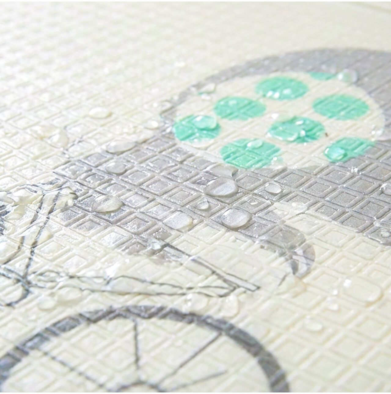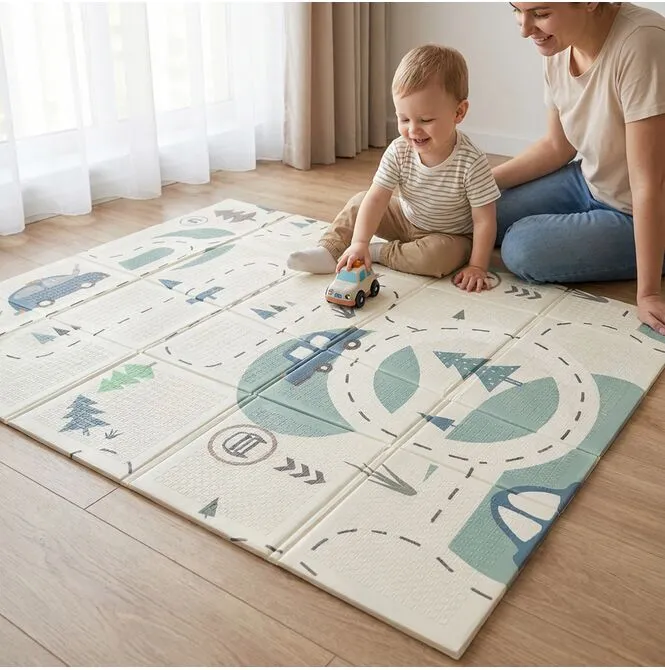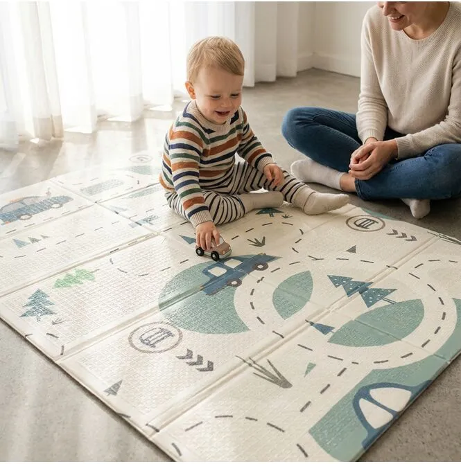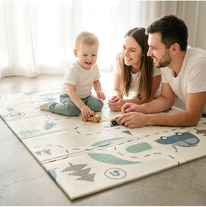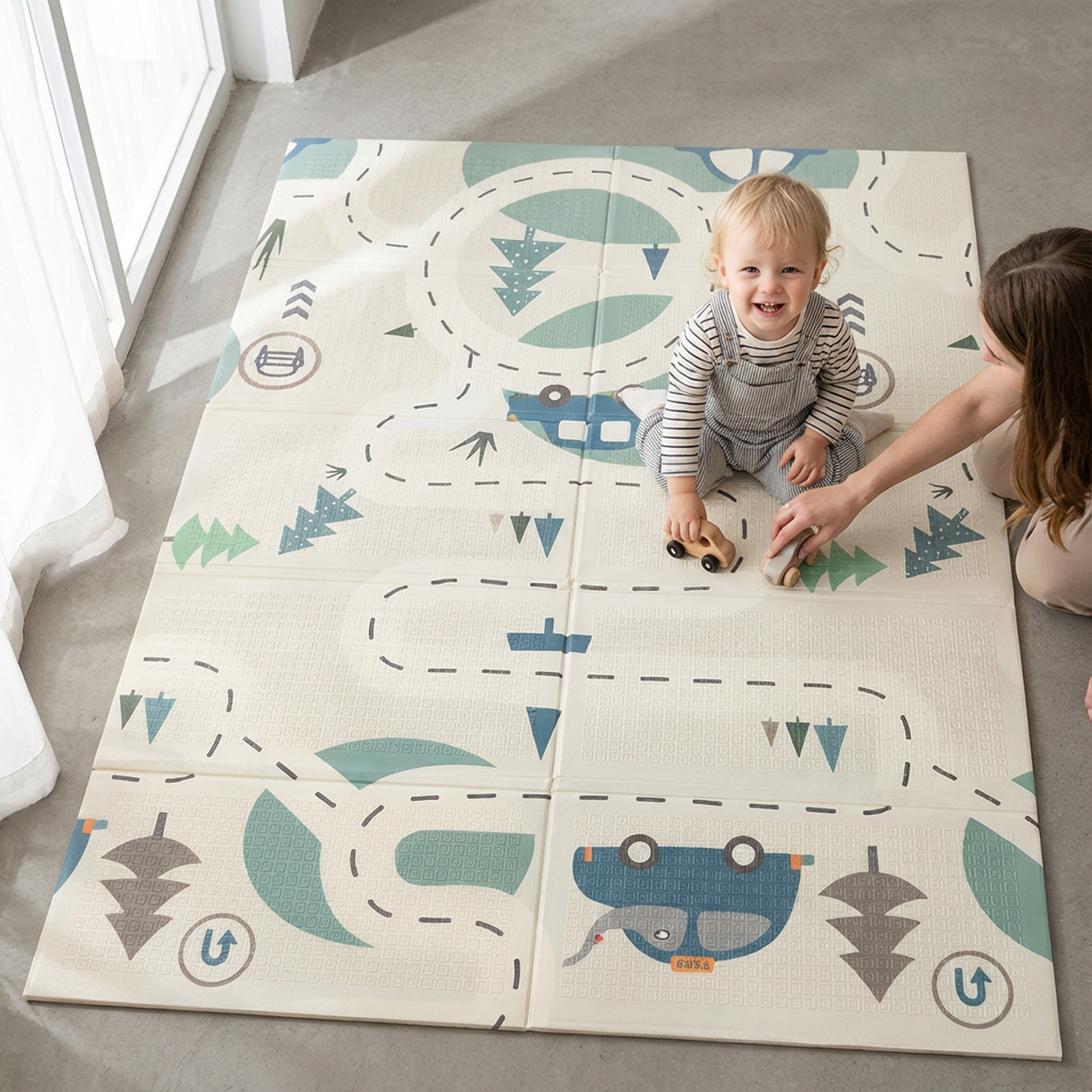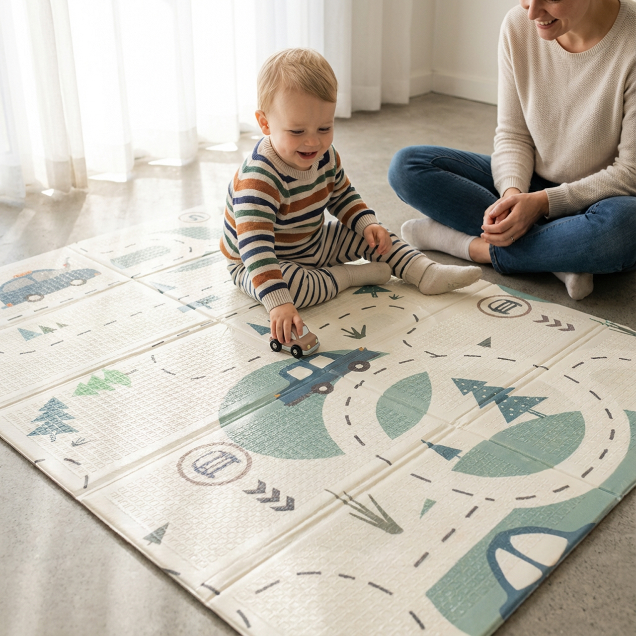 Mata stabilnie leży na większości typów podłoża — od paneli, przez płytki, po dywany — tworząc przyjazną i bezpieczną strefę zabawy oraz wypoczynku.