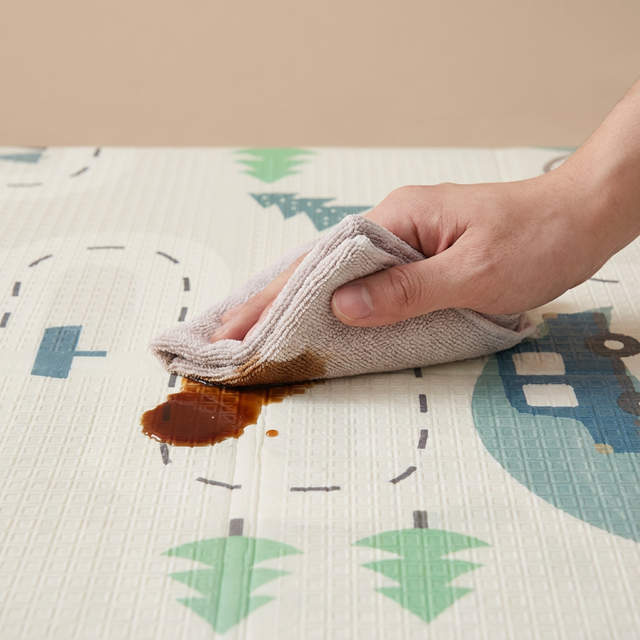 Dodatkowo powierzchnia maty jest wodoodporna, co oznacza, że rozlane napoje, ślina czy resztki jedzenia nie wnikają w strukturę materiału. Wystarczy jedno przetarcie wilgotną ściereczką, aby przywrócić jej czystość.