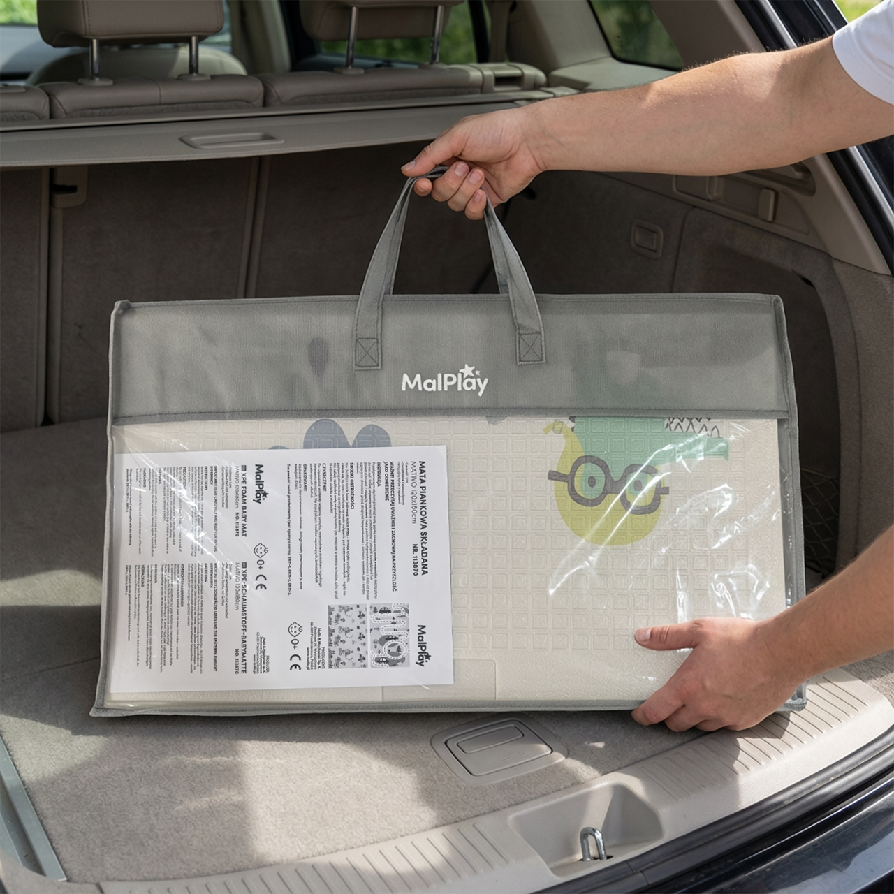 Mata Malplay została wyposażona w solidną, estetyczną torbę transportową, która znacząco zwiększa komfort codziennego użytkowania. Dzięki mocnym rączkom i lekkiej konstrukcji możesz w łatwy sposób zabrać matę do ogrodu, na taras, do znajomych czy w podróż samochodem.