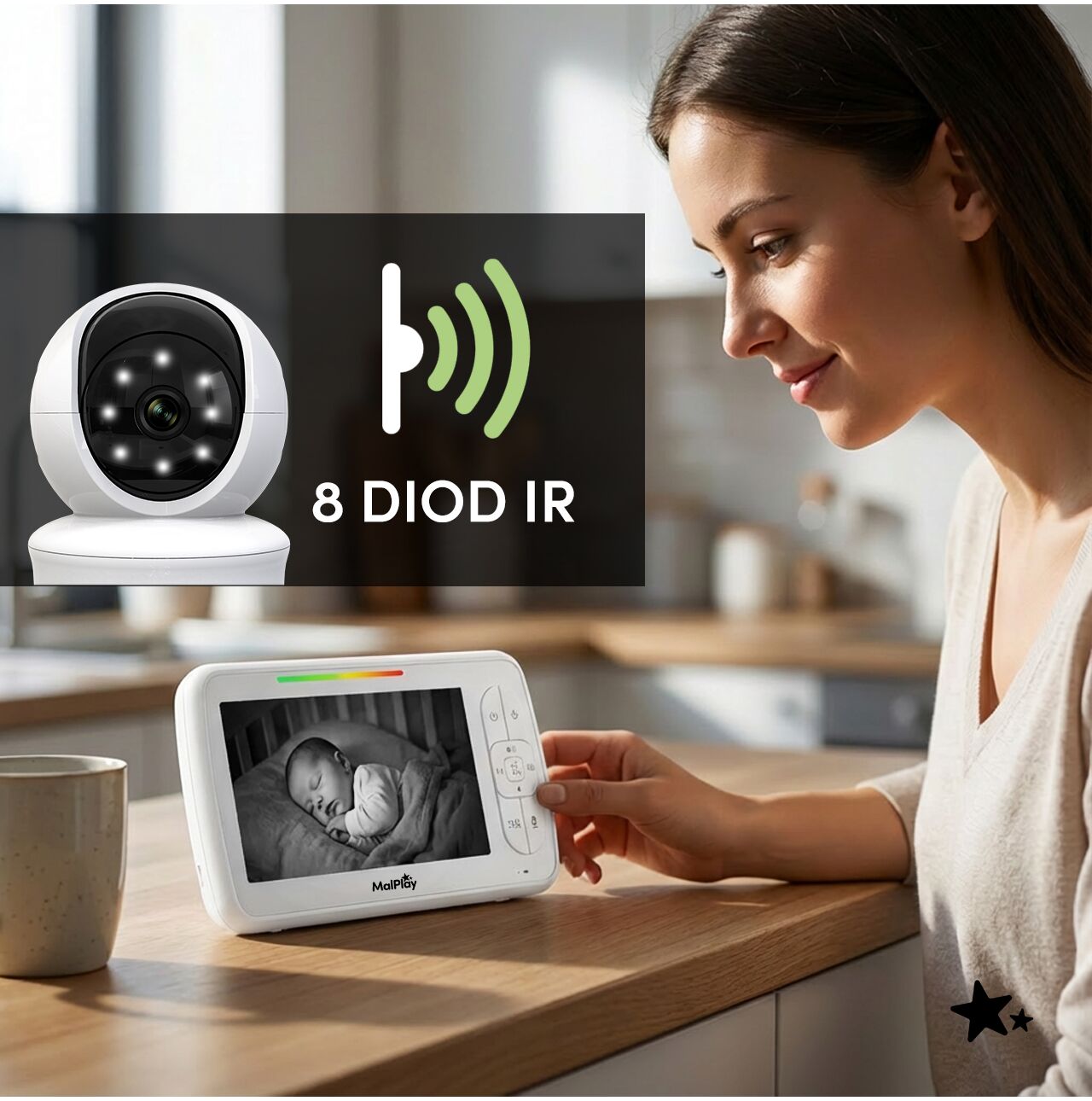 Automatyczne widzenie nocne w podczerwieni IR pozwala obserwować dziecko nawet w bardzo słabym oświetleniu, bez konieczności zapalania światła. Kamera korzysta z 8 diod IR i wspiera się czujnikiem światła, dzięki czemu przełączanie na tryb nocny jest wygodne i intuicyjne. To praktyczne rozwiązanie na nocne pobudki, drzemki i stały nadzór bez chodzenia do pokoju co chwilę.