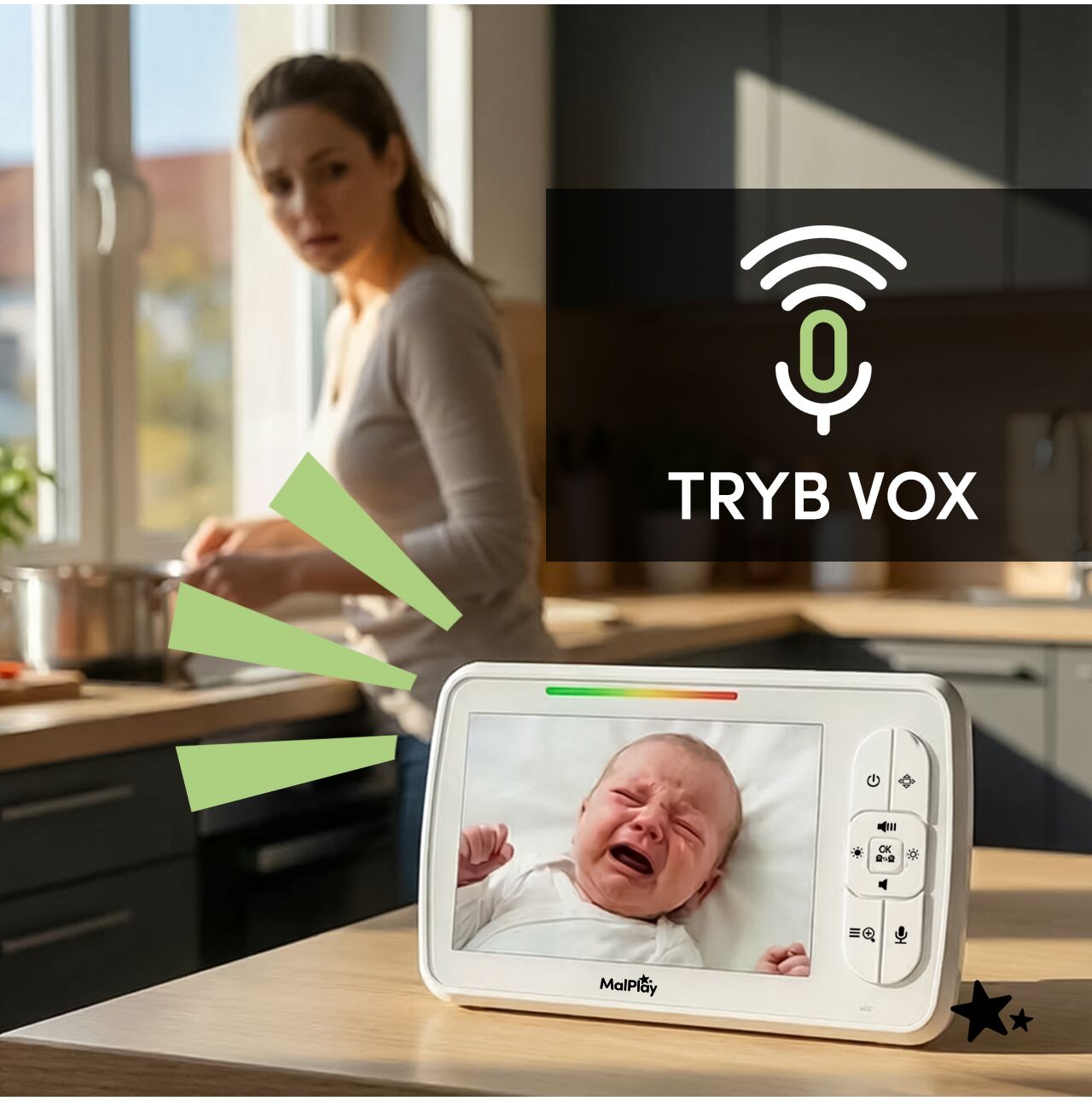 Dodatkowo tryb VOX (z regulacją czułości) sprawia, że niania może reagować na dźwięki z pokoju dziecka i uruchamiać podgląd wtedy, gdy jest to potrzebne.