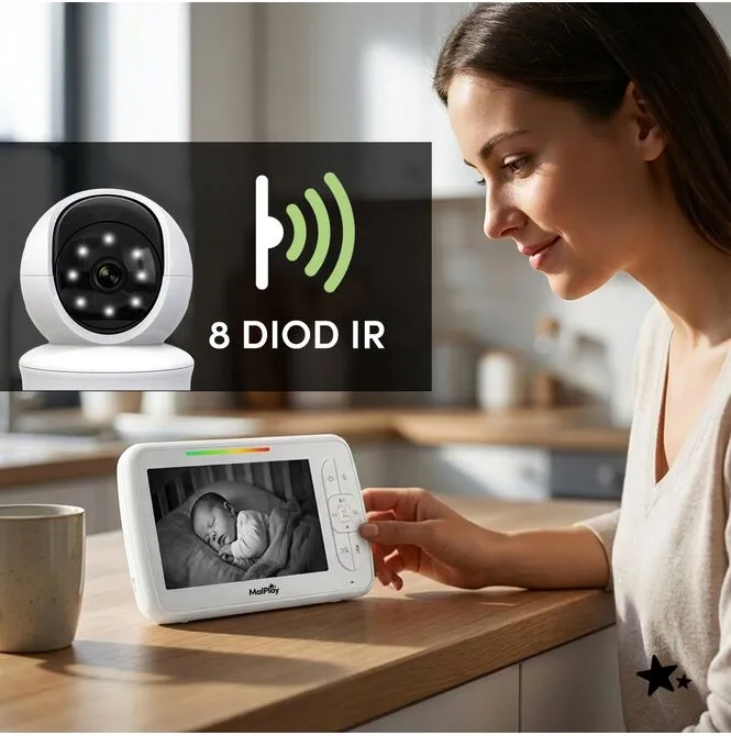 - Widzenie nocne IR (8 diod podczerwieni) – monitoring w ciemności bez budzenia dziecka