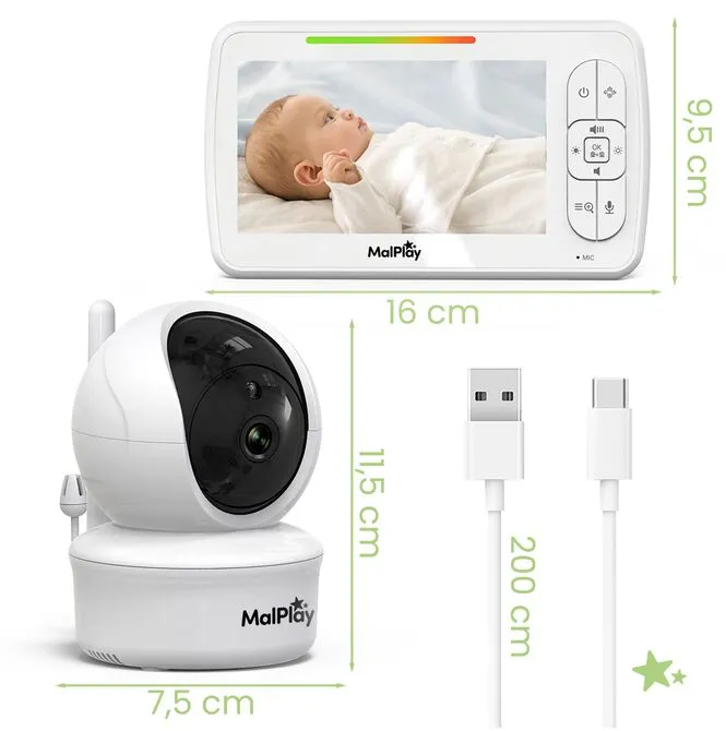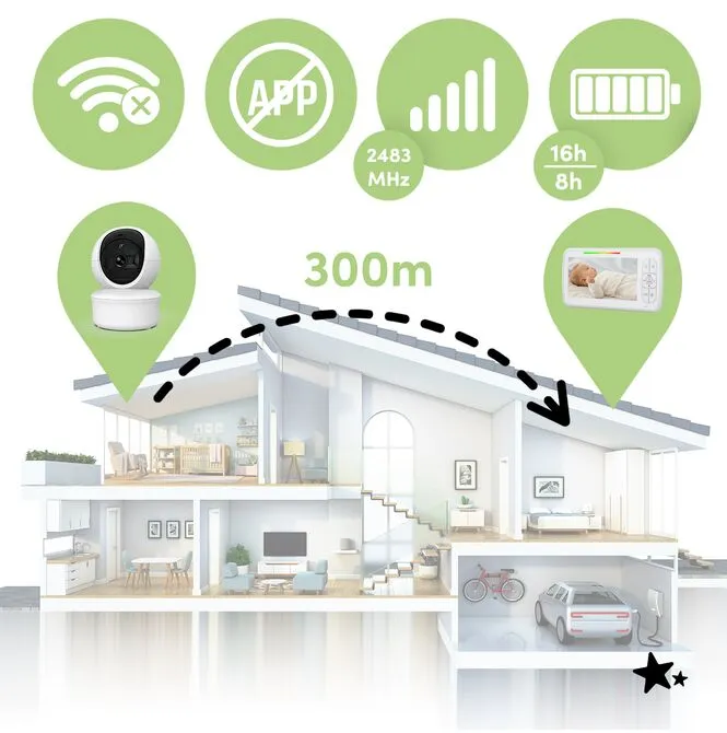 - Niania wideo z kamerą i dużym monitorem 5,0” HD – wyraźny obraz dziecka w czasie rzeczywistym, bez potrzeby korzystania z Wi-Fi