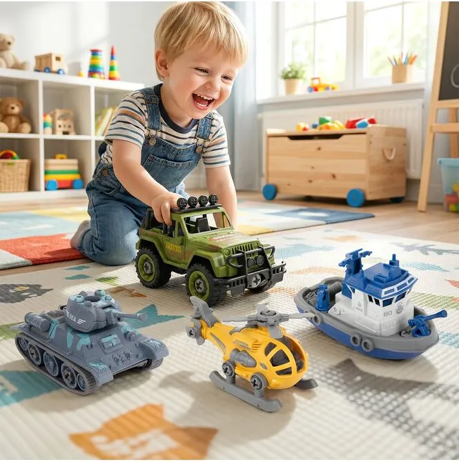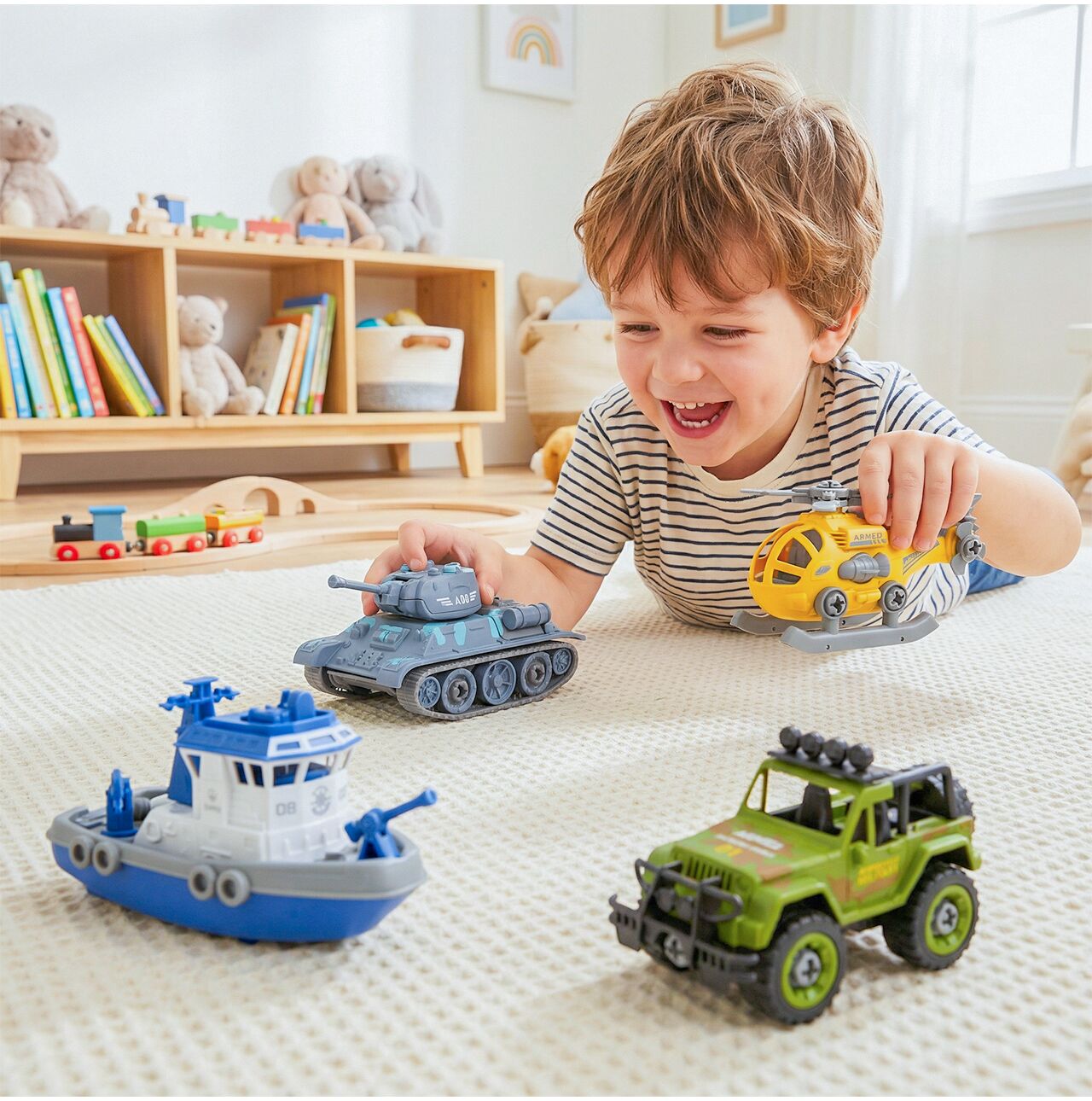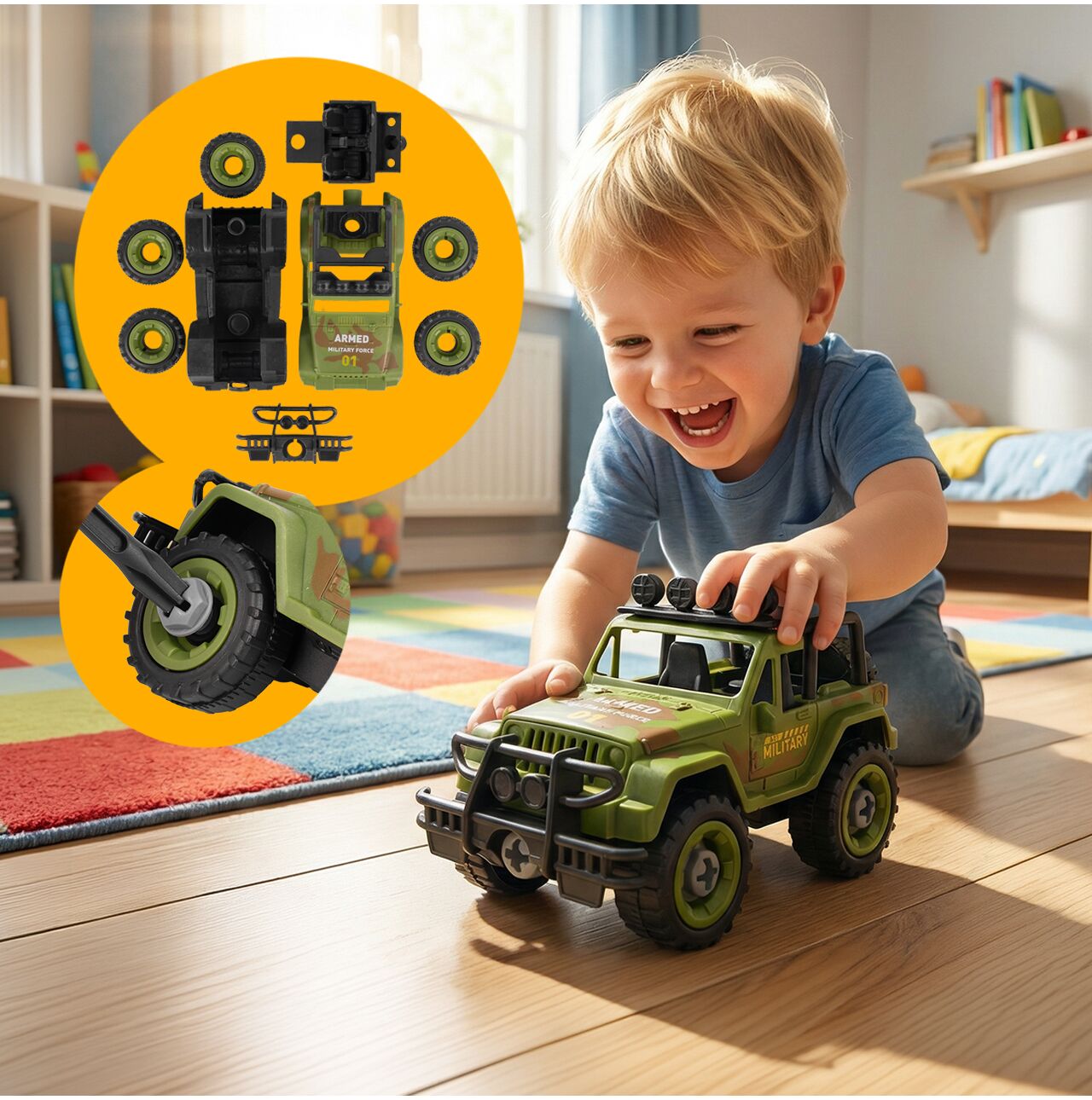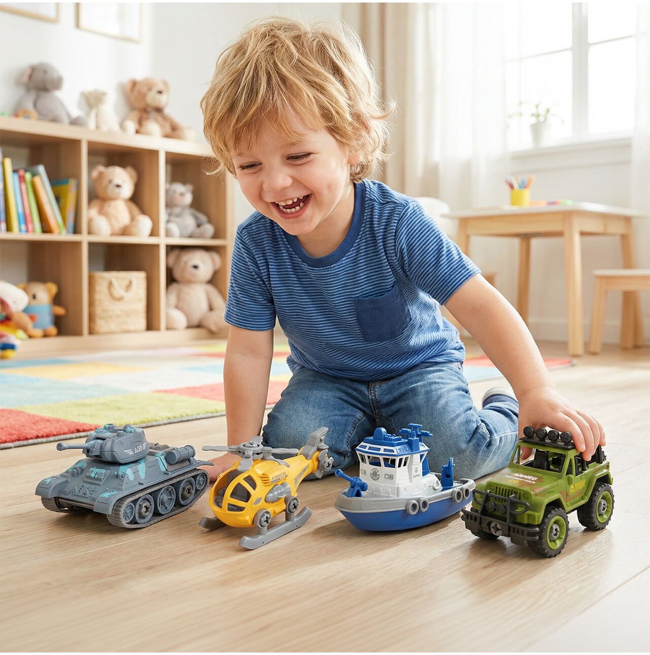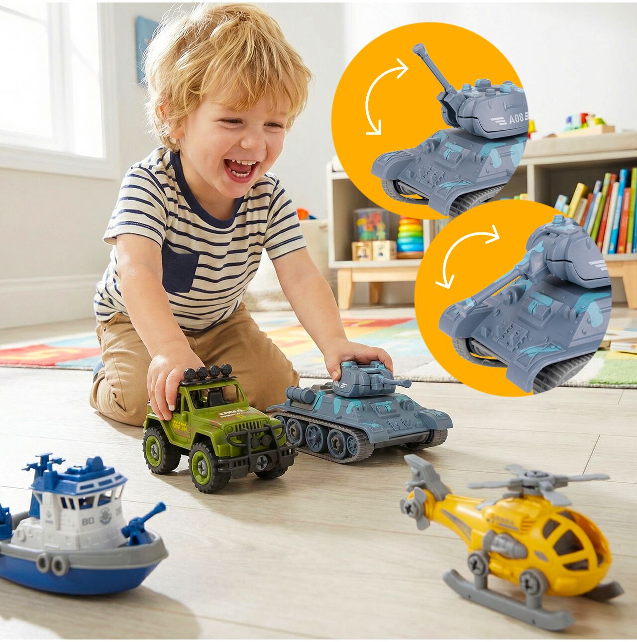 Ten zestaw pozwala bezpiecznie skręcać i rozkręcać pojazdy tyle razy, ile dziecko chce. Śruby są duże i dopasowane do małych dłoni, dzięki czemu zabawa nie frustruje.