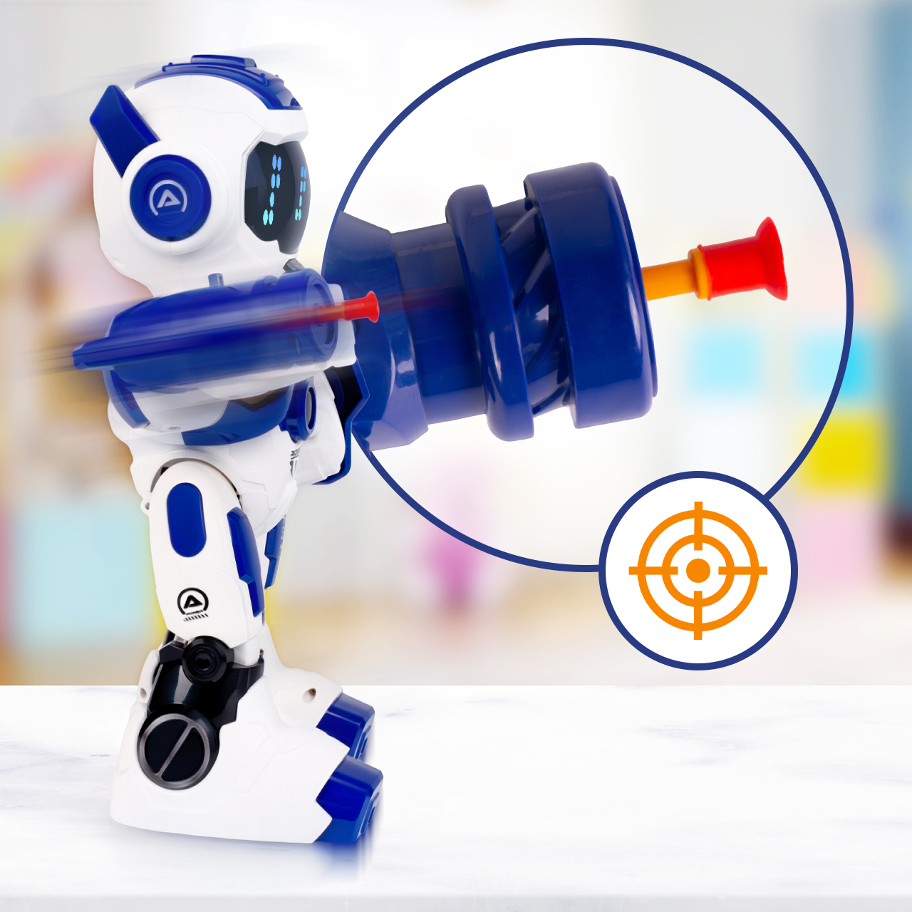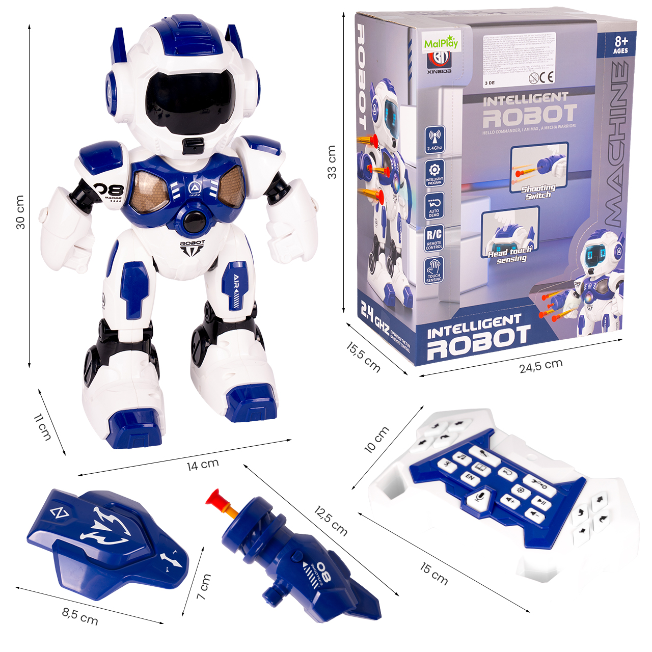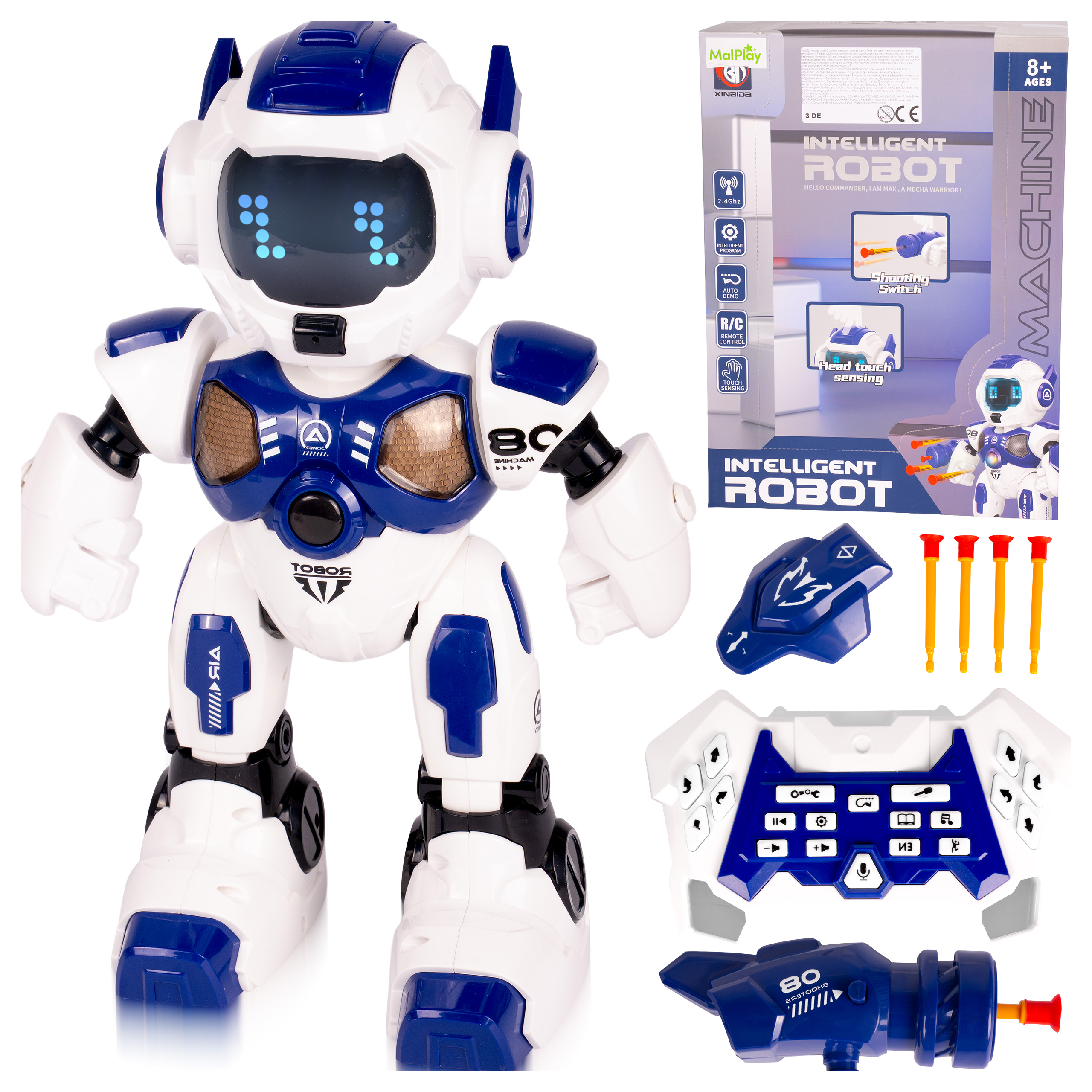 - Funkcje: jazda/chodzenie przód–tył, obrót, ruch ramion, strzał z wyrzutni, Program, Auto Demo, Touch Sensing (głowa), efekty LED i dźwięki