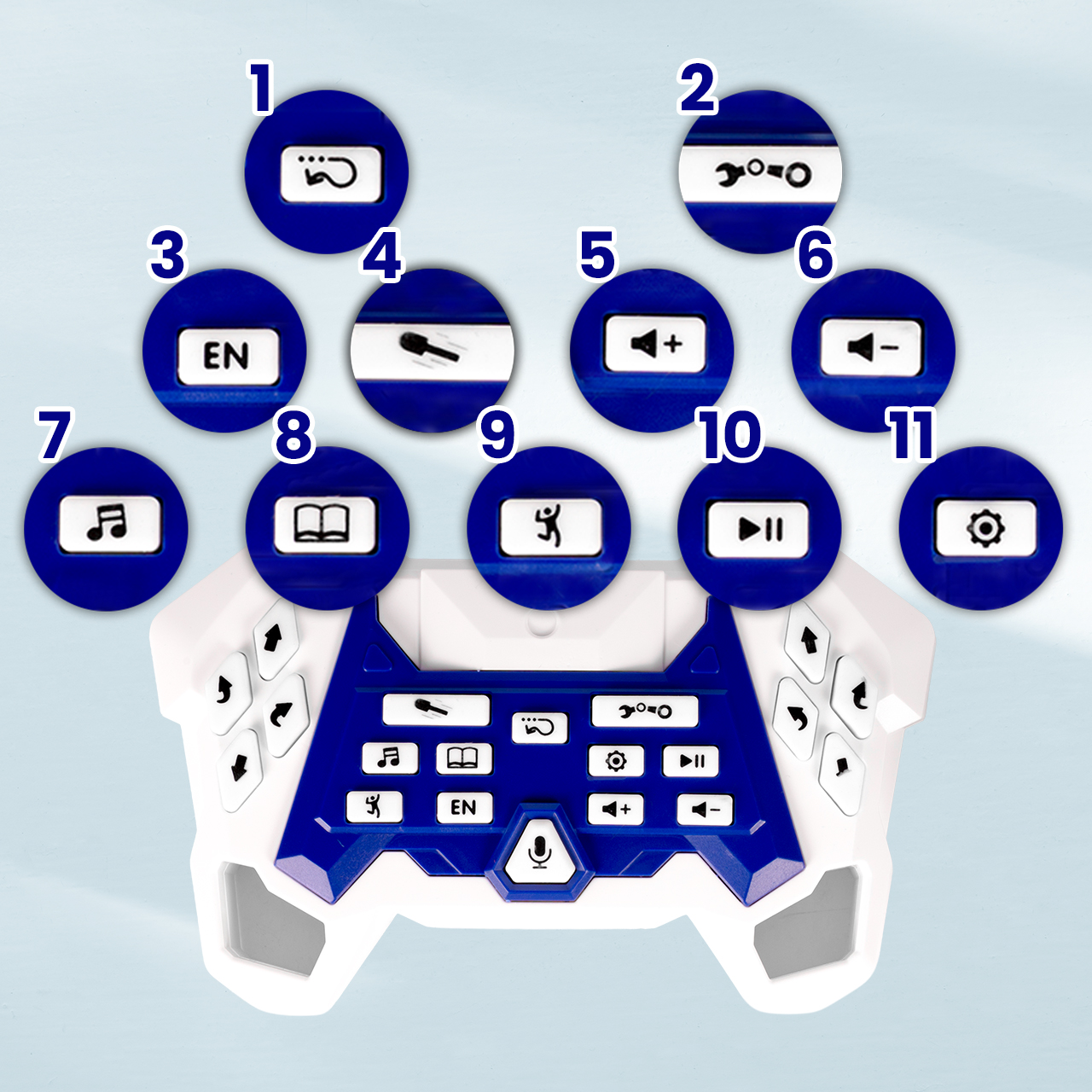 Pilot w technologii 2.4 GHz zapewnia szybkie reakcje i stabilny zasięg. Dziecko steruje ruchem, obrotami i akcjami specjalnymi intuicyjnymi przyciskami – bez mylenia kanałów, nawet gdy bawi się kilkoro dzieci z kilkoma robotami w jednym pokoju. Przyciski multimedialne na pilocie pozwalają włączać muzykę, pauzować, regulować głośność czy zmieniać tryby.