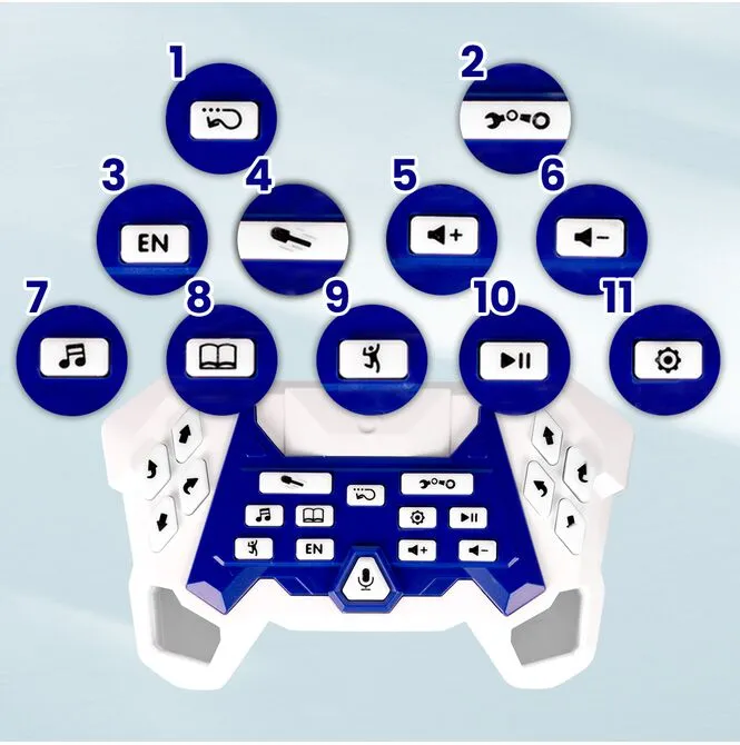 Pilot w technologii 2.4 GHz zapewnia szybkie reakcje i stabilny zasięg. Dziecko steruje ruchem, obrotami i akcjami specjalnymi intuicyjnymi przyciskami – bez mylenia kanałów, nawet gdy bawi się kilkoro dzieci z kilkoma robotami w jednym pokoju. Przyciski multimedialne na pilocie pozwalają włączać muzykę, pauzować, regulować głośność czy zmieniać tryby.