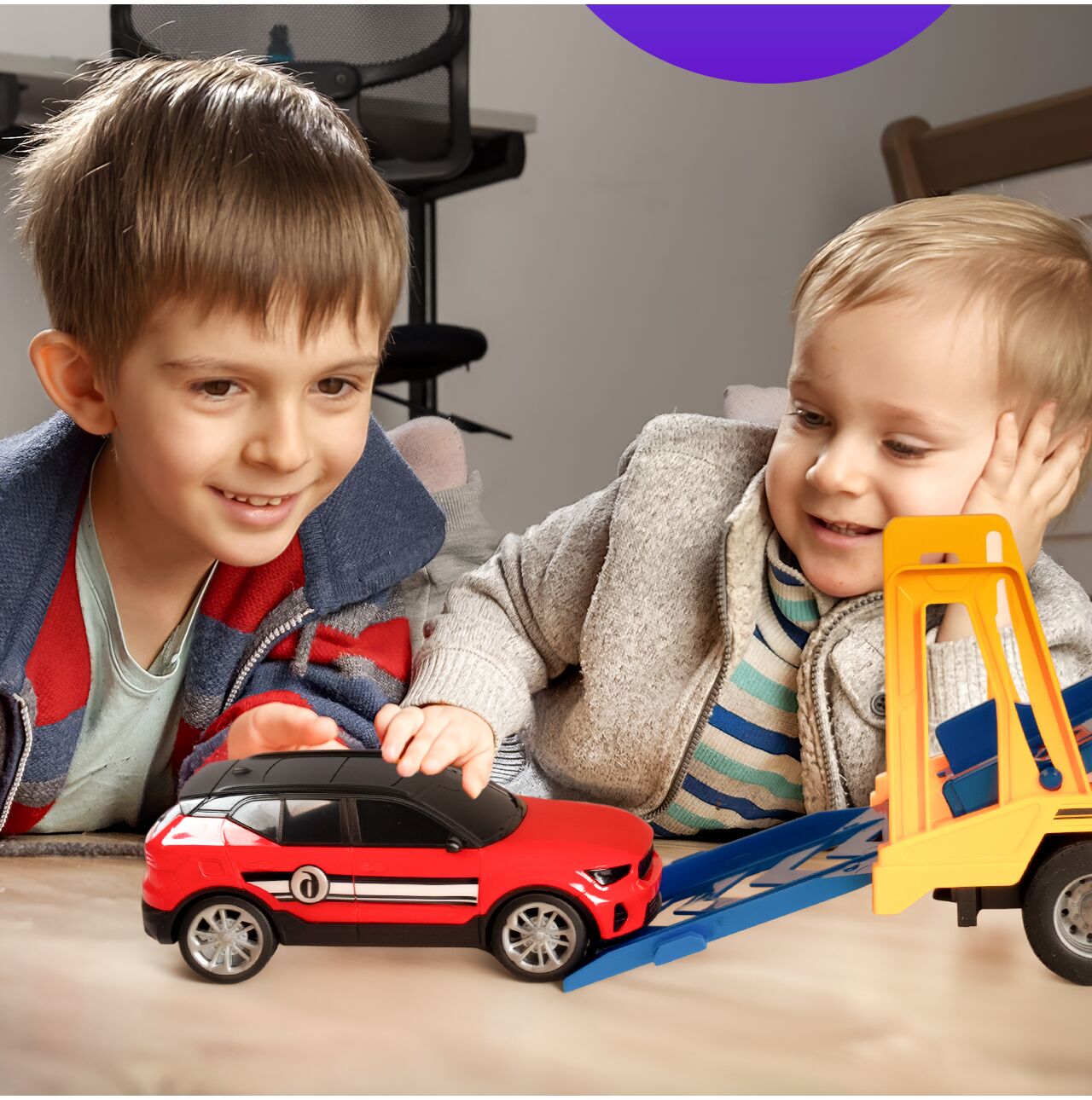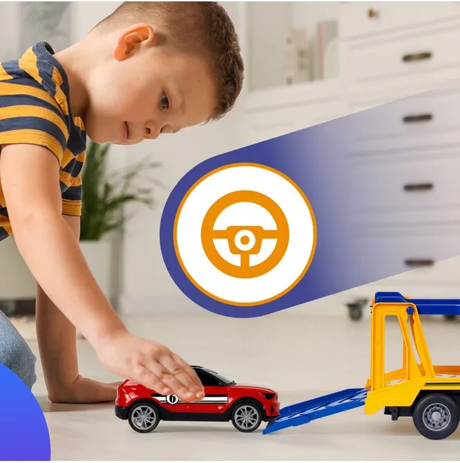 W pudełku masz wszystko do startu: lawetę z efektami i auto sportowe. Bawcie się w pomoc drogową, transport nowych aut do salonu, dojazd na tor wyścigowy albo serwis – łącz z innymi autkami dziecka, torami czy garażem, by tworzyć całe miasto.