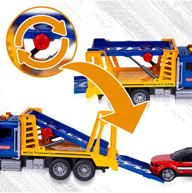 Praktyczne pokrętło pozwala płynnie podnieść lub opuścić platformę. Auto wjeżdża po rampie, zabezpieczamy ładunek i ruszamy w trasę. Mechanizm jest intuicyjny i odporny na dziecięce pomysły.
