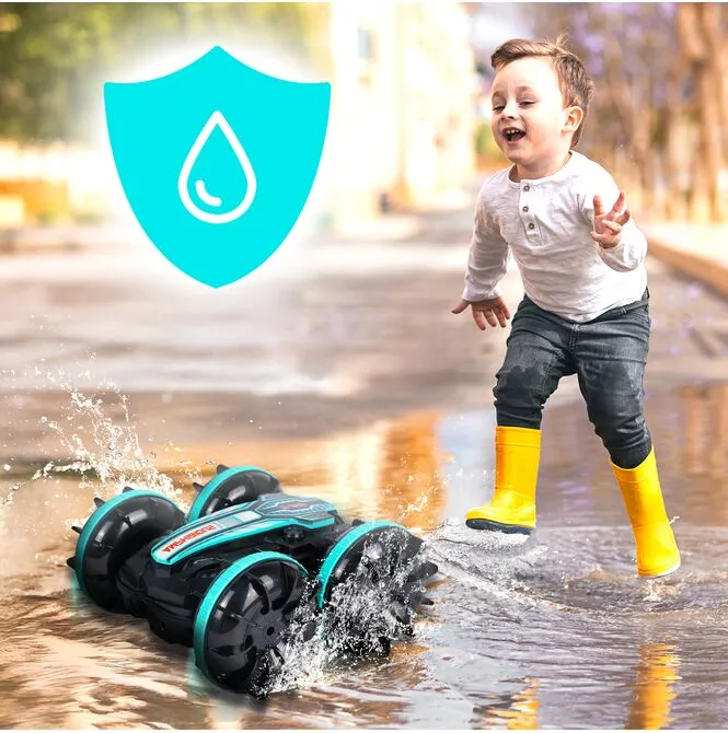 Uszczelniona konstrukcja oraz koła z łopatkami pozwalają na dynamiczną jazdę po mokrym podłożu, trawie czy śniegu. Efektowne rozpryski wody i pewna trakcja gwarantują emocje niezależnie od pogody.