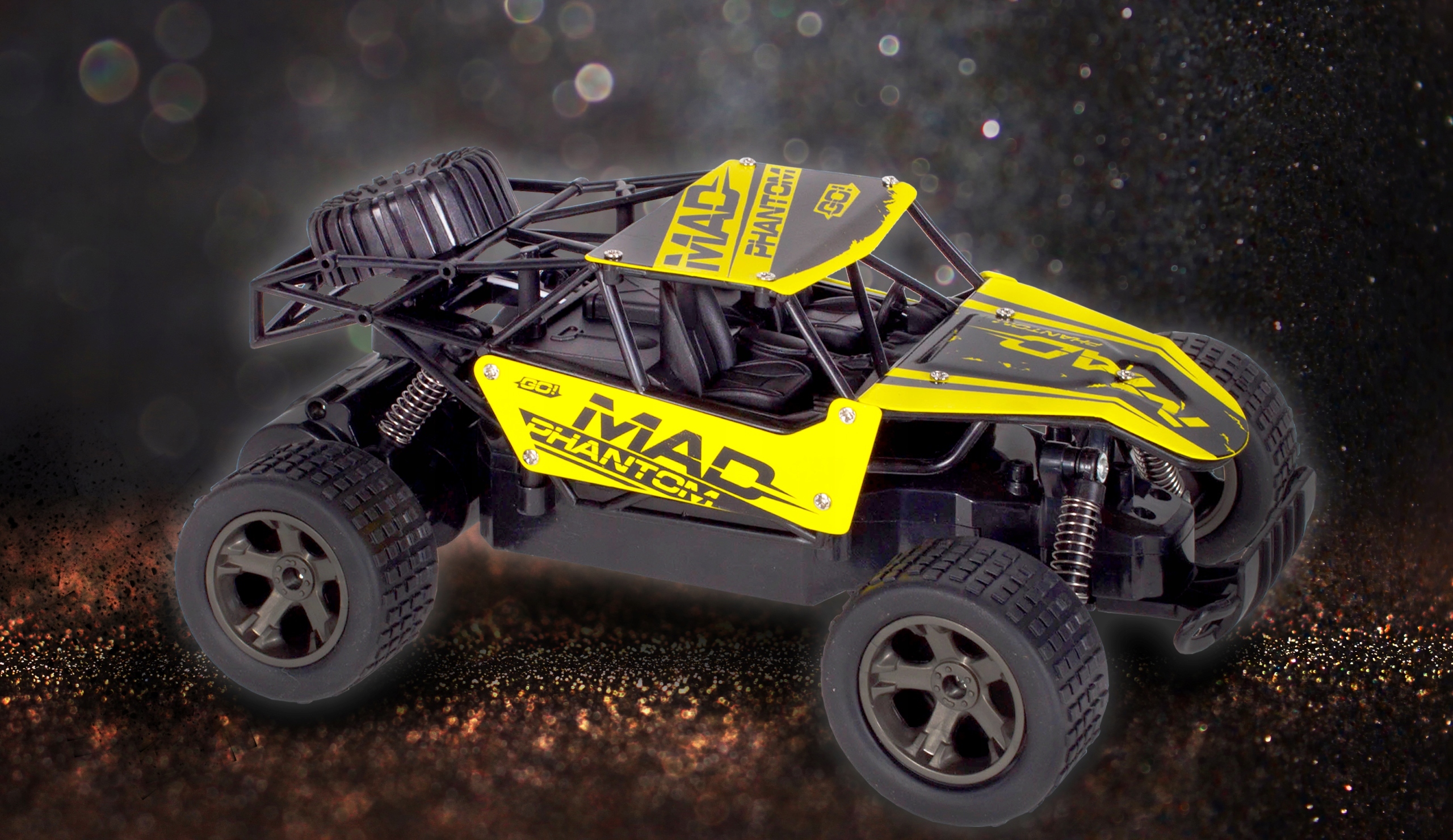 Dzięki szerokim bieżnikowanym oponom oraz amortyzacji idealnie poradzi sobie w piaszczystym terenie. Dołączony do zestawu pilot posiada możliwość przełączenia na tryb prawo lub lewo ręczny