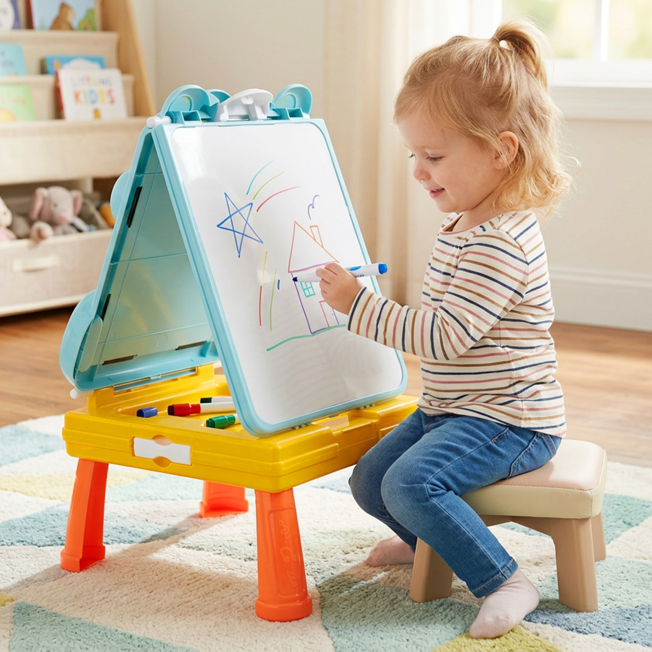 Dużą zaletą jest forma 2w1 — produkt może służyć jako niski stolik do zabawy albo tablica ustawiona pod wygodnym kątem. Do tego dochodzą plansze i pionki, które zamieniają zwykłe rysowanie w jeszcze ciekawszą zabawę. Dzięki temu jedno pudełko daje dziecku kilka różnych aktywności.