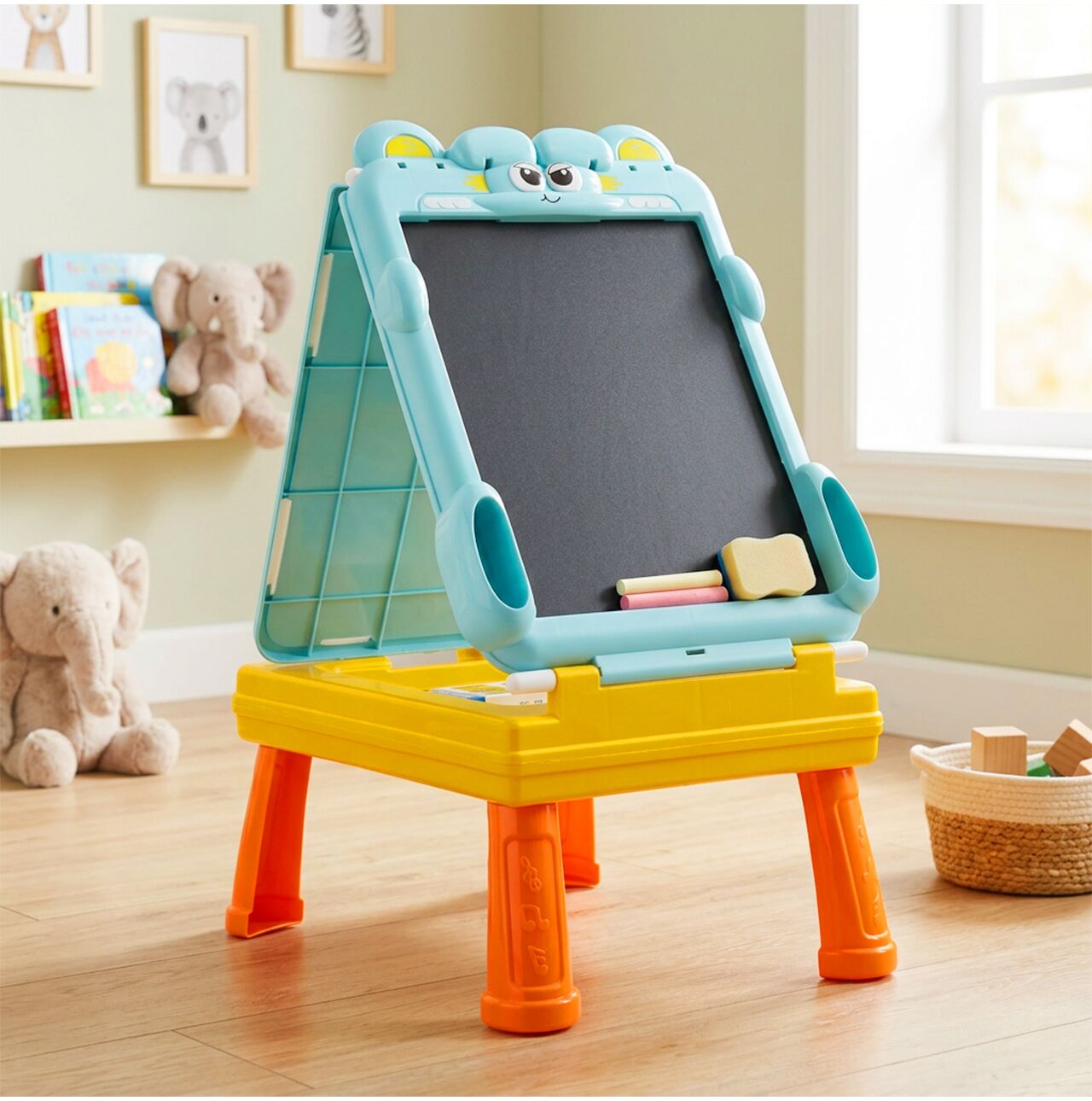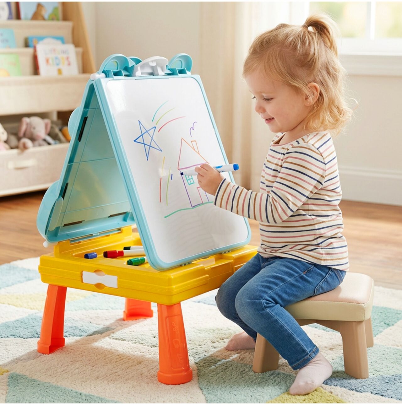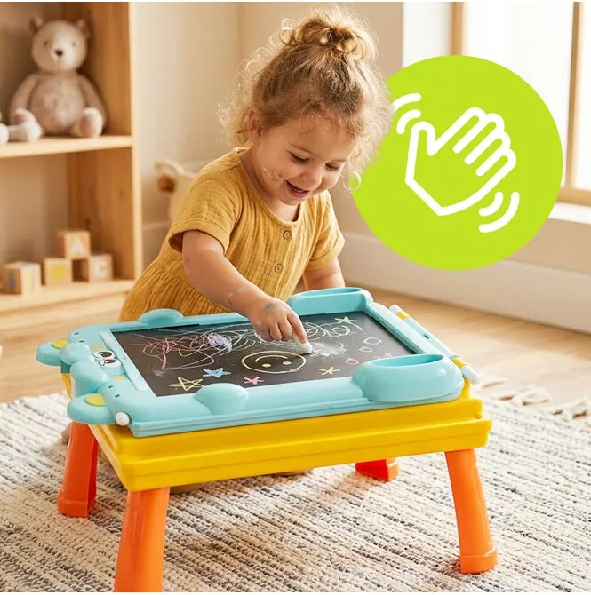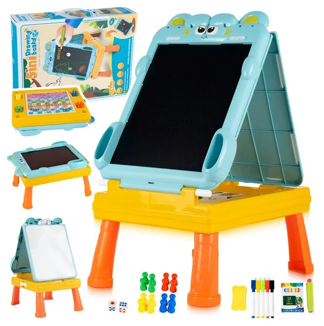 Dużą zaletą jest forma 2w1 — produkt może służyć jako niski stolik do zabawy albo tablica ustawiona pod wygodnym kątem. Do tego dochodzą plansze i pionki, które zamieniają zwykłe rysowanie w jeszcze ciekawszą zabawę. Dzięki temu jedno pudełko daje dziecku kilka różnych aktywności.