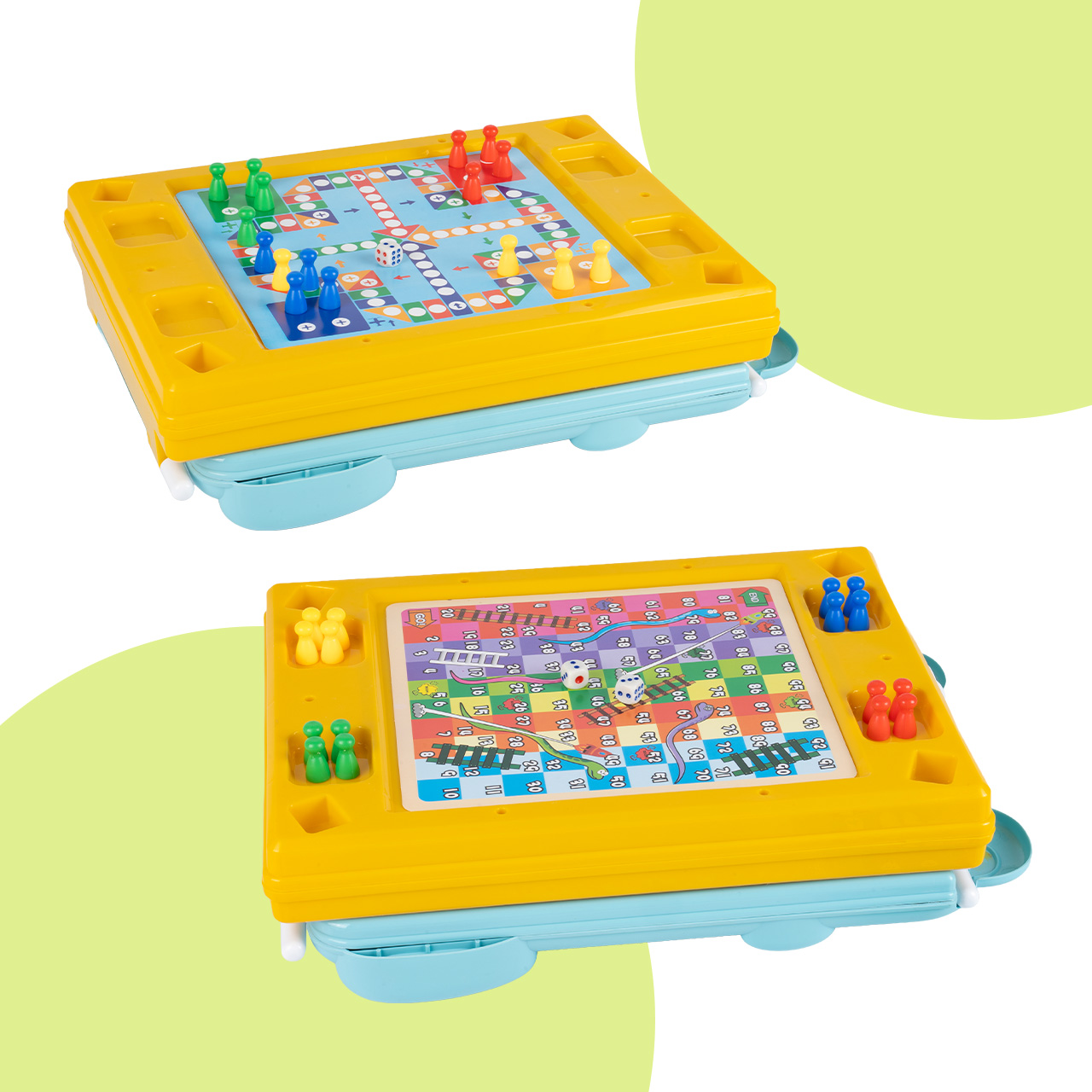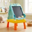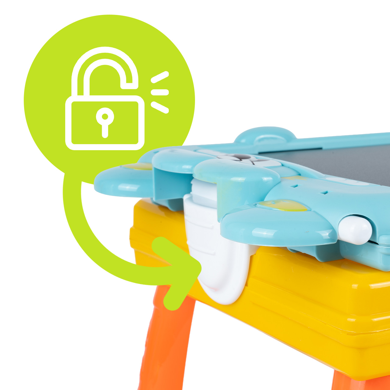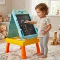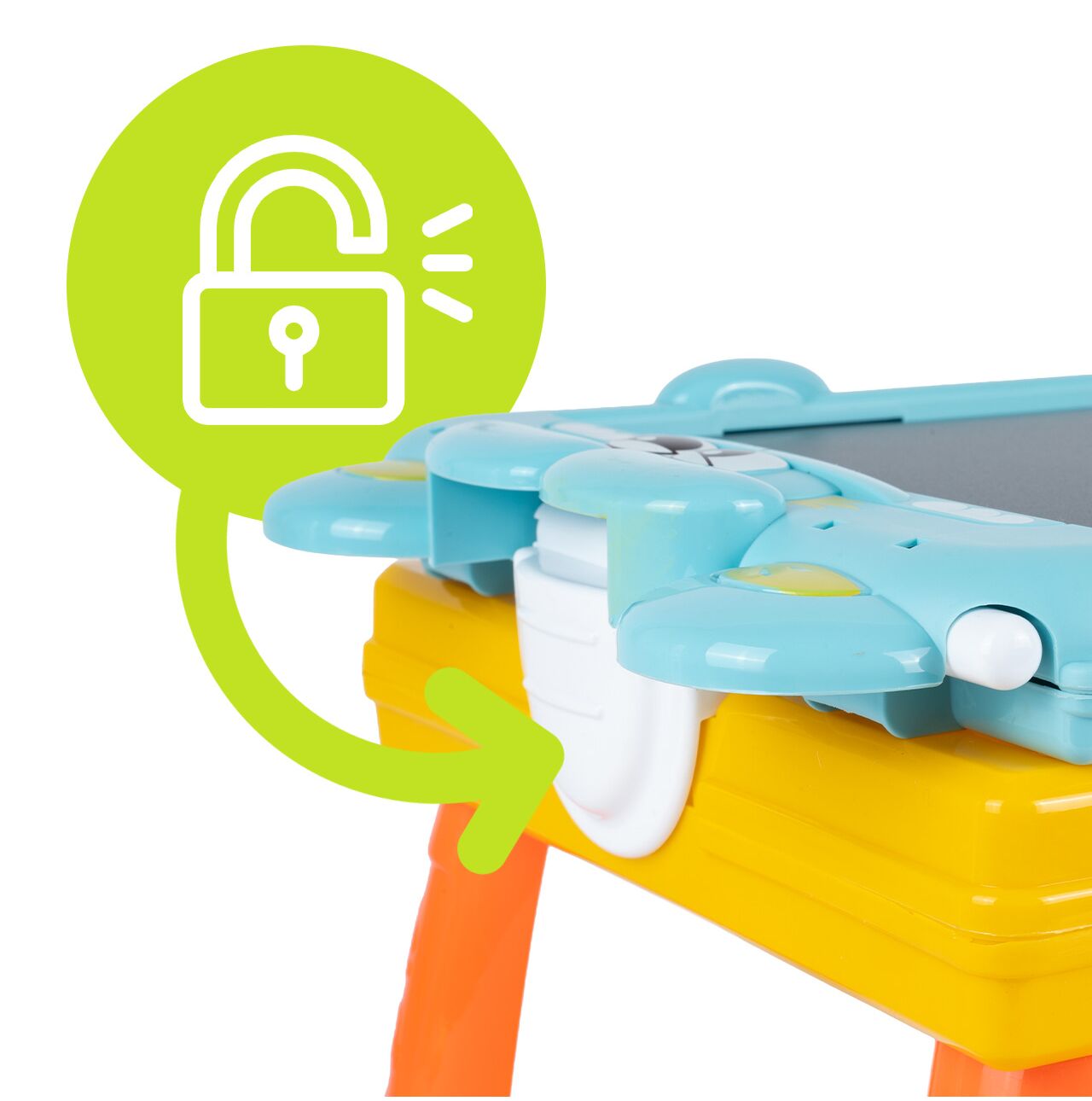 Dużą zaletą jest forma 2w1 — produkt może służyć jako niski stolik do zabawy albo tablica ustawiona pod wygodnym kątem. Do tego dochodzą plansze i pionki, które zamieniają zwykłe rysowanie w jeszcze ciekawszą zabawę. Dzięki temu jedno pudełko daje dziecku kilka różnych aktywności.