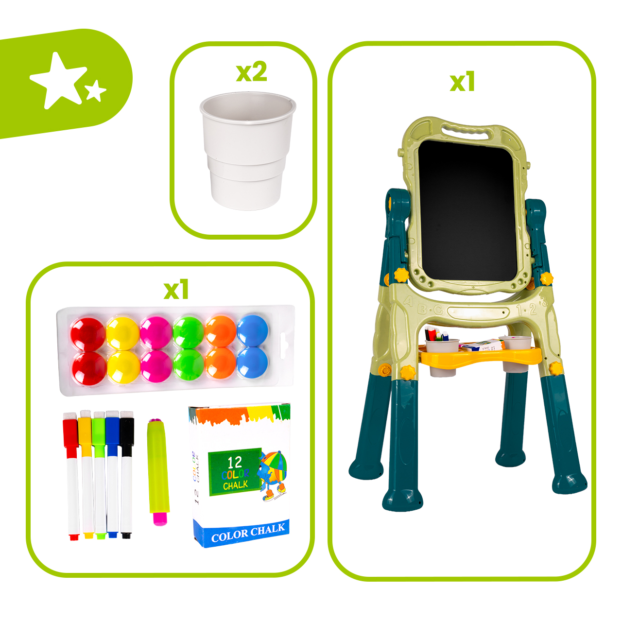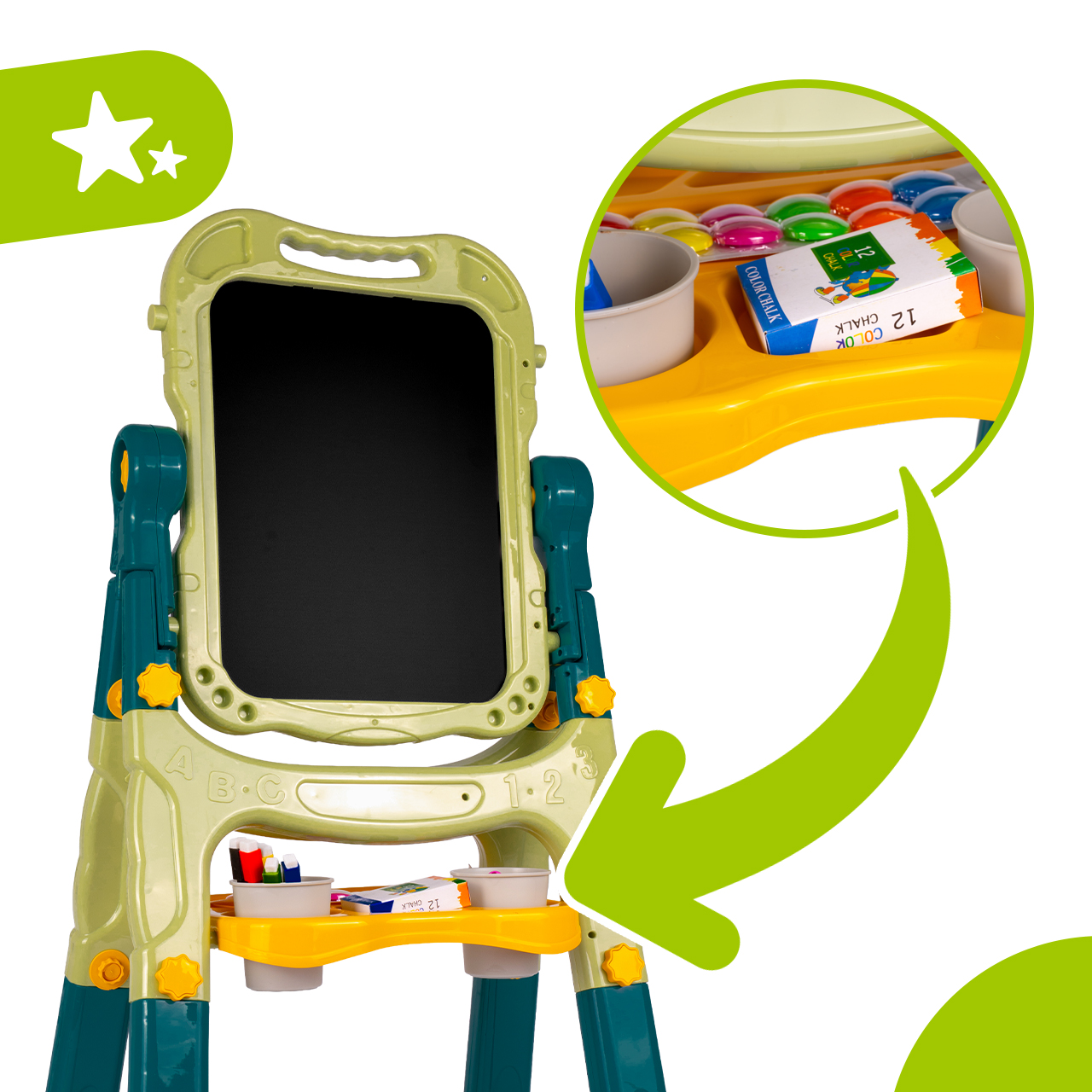 Szeroka półka pomieści kredy, markery, gąbkę i kredo-uchwyt. Dwa kubeczki zapobiegają gubieniu przyborów i ułatwiają utrzymanie porządku po skończonej zabawie.