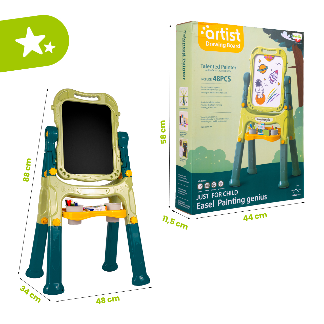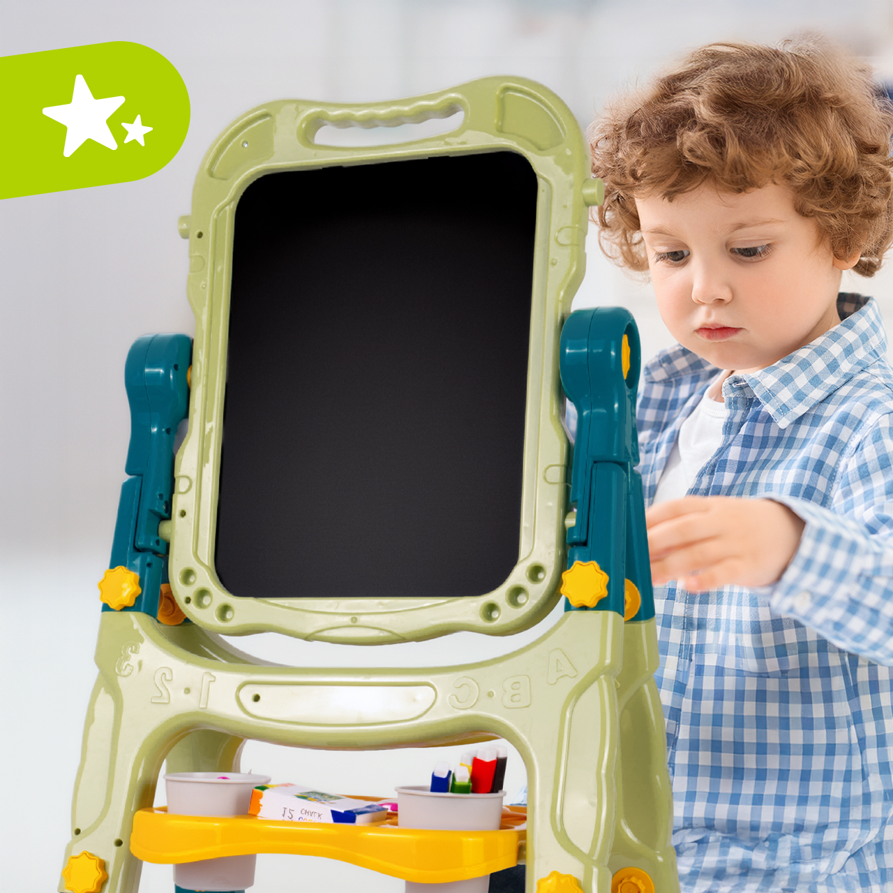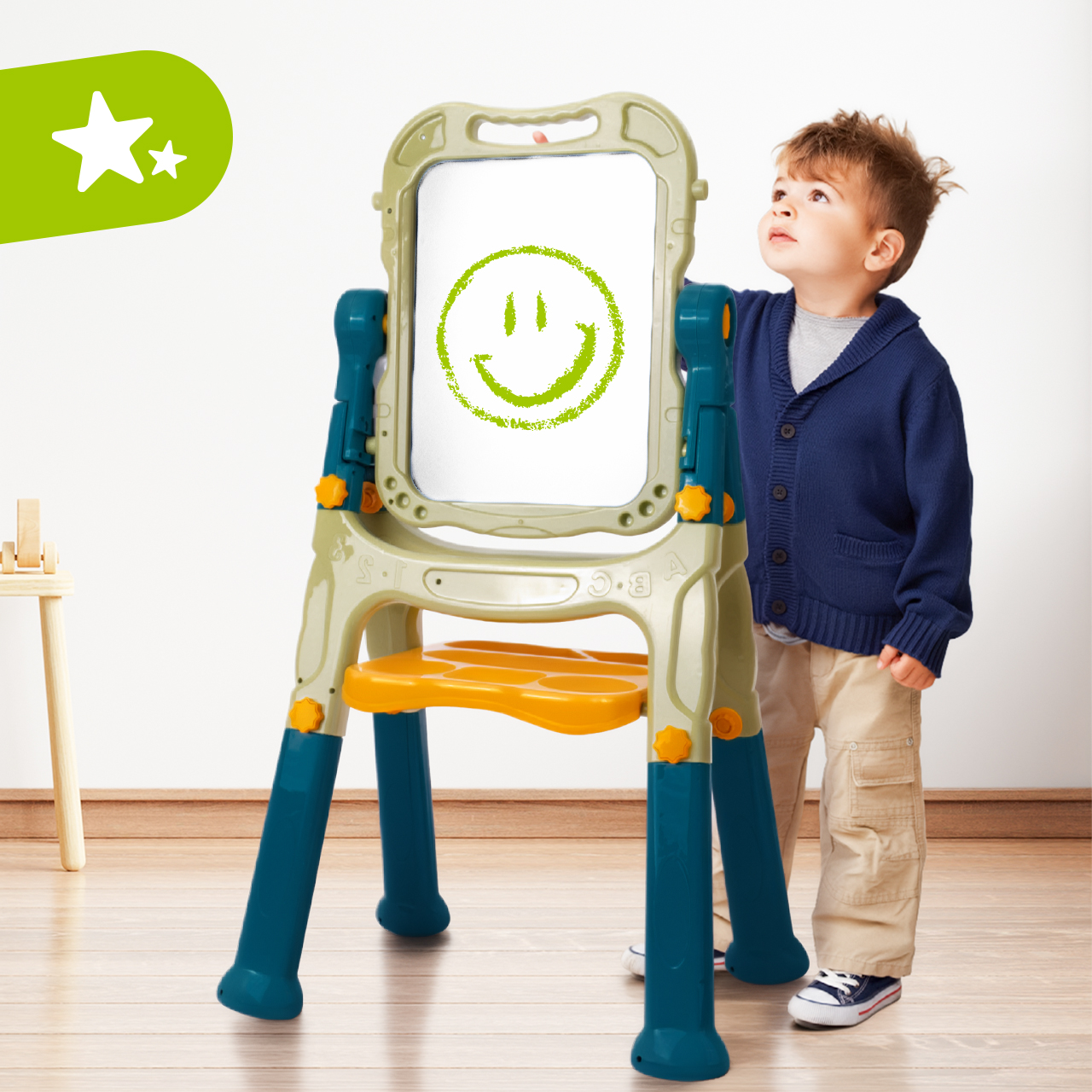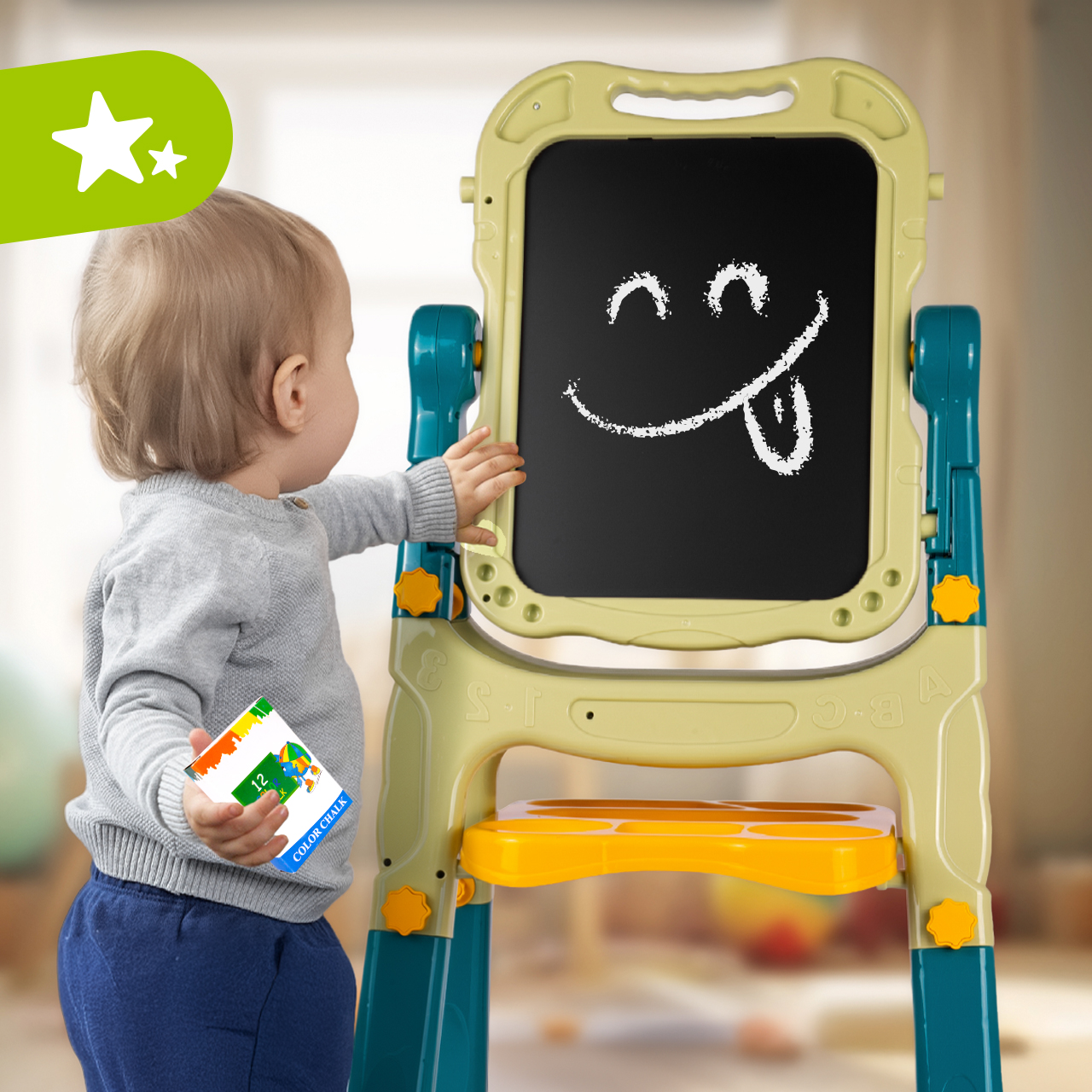 Tablica stymuluje motorykę małą, koordynację ręka-oko, ćwiczy chwyt pisarski i rozwija kreatywność. Rysowanie i pisanie wspiera naukę liter, cyfr, kolorów oraz pierwsze działania matematyczne. Dziecko uczy się planowania przestrzennego, wyrażania emocji obrazem i pracą w skupieniu. Magnesy pomagają w nauce przez elementy manipulacyjne, a wspólne rysowanie rozwija komunikację i współpracę.