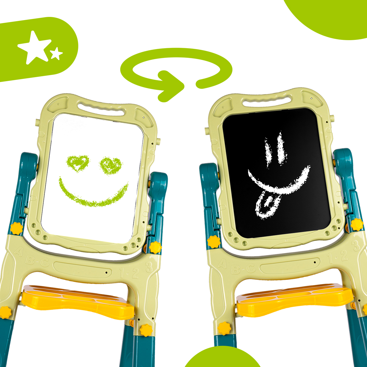 Strona kredowa zachęca do śmiałych szkiców, a suchościeralna magnetyczna jest idealna do kolorowych rysunków markerami i układania obrazków z magnesów. Jednym ruchem odwracasz tablicę i zmieniasz technikę.