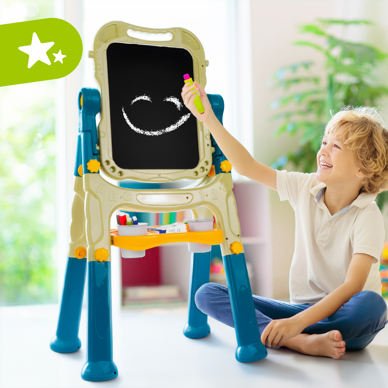 Gąbka błyskawicznie czyści stronę kredową, a markery mają ścieraki w nakrętkach – nowa zabawa zaczyna się w sekundę. Powierzchnie są gładkie i łatwo utrzymać je w czystości.