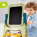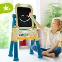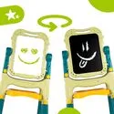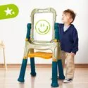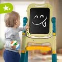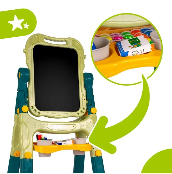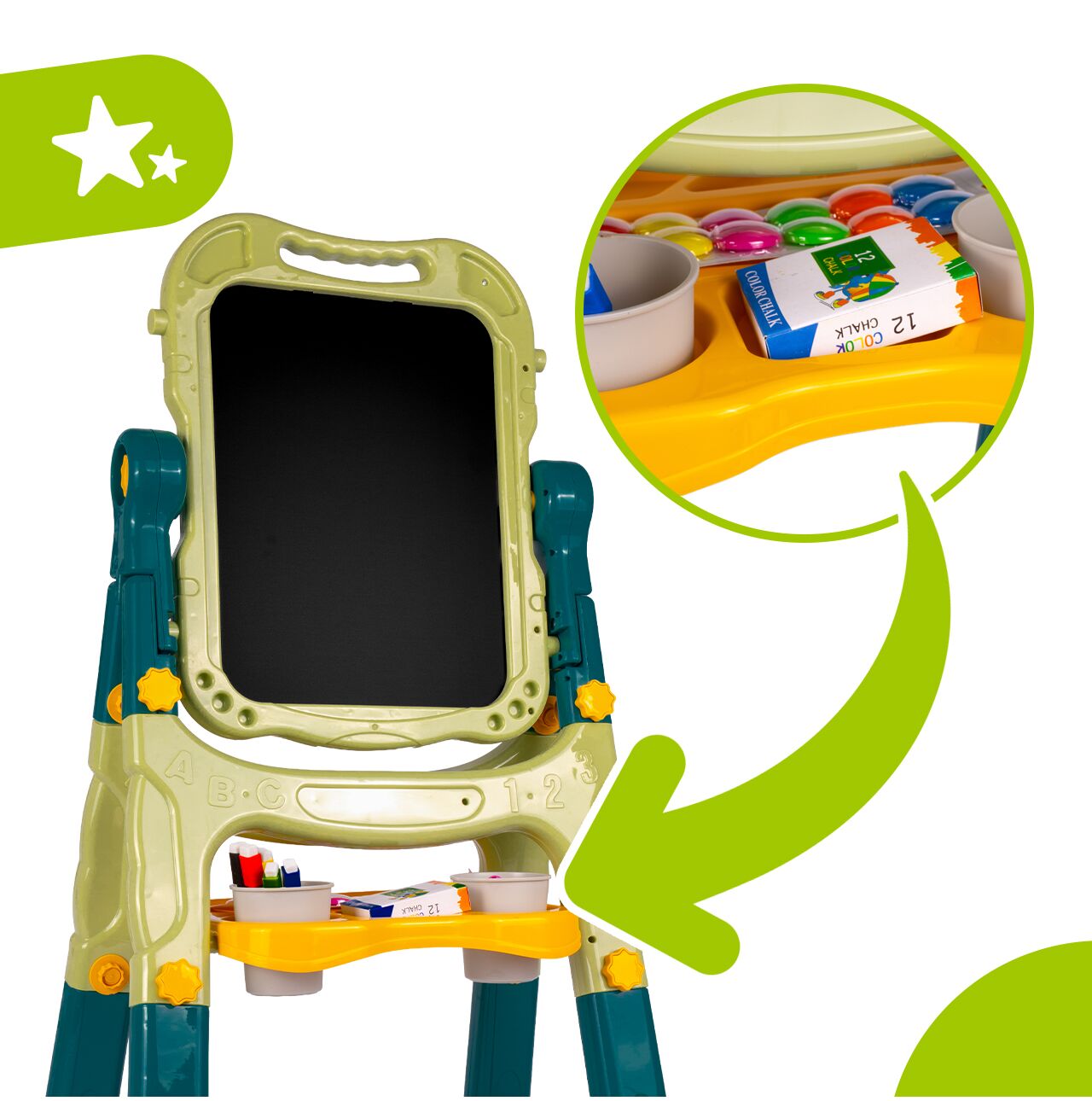 Szeroka półka pomieści kredy, markery, gąbkę i kredo-uchwyt. Dwa kubeczki zapobiegają gubieniu przyborów i ułatwiają utrzymanie porządku po skończonej zabawie.