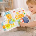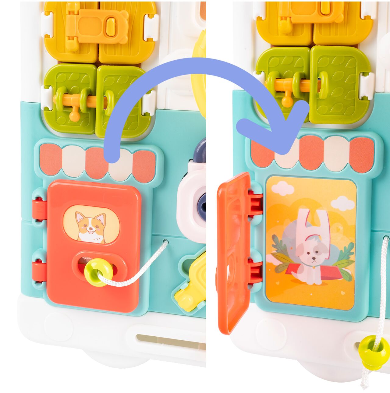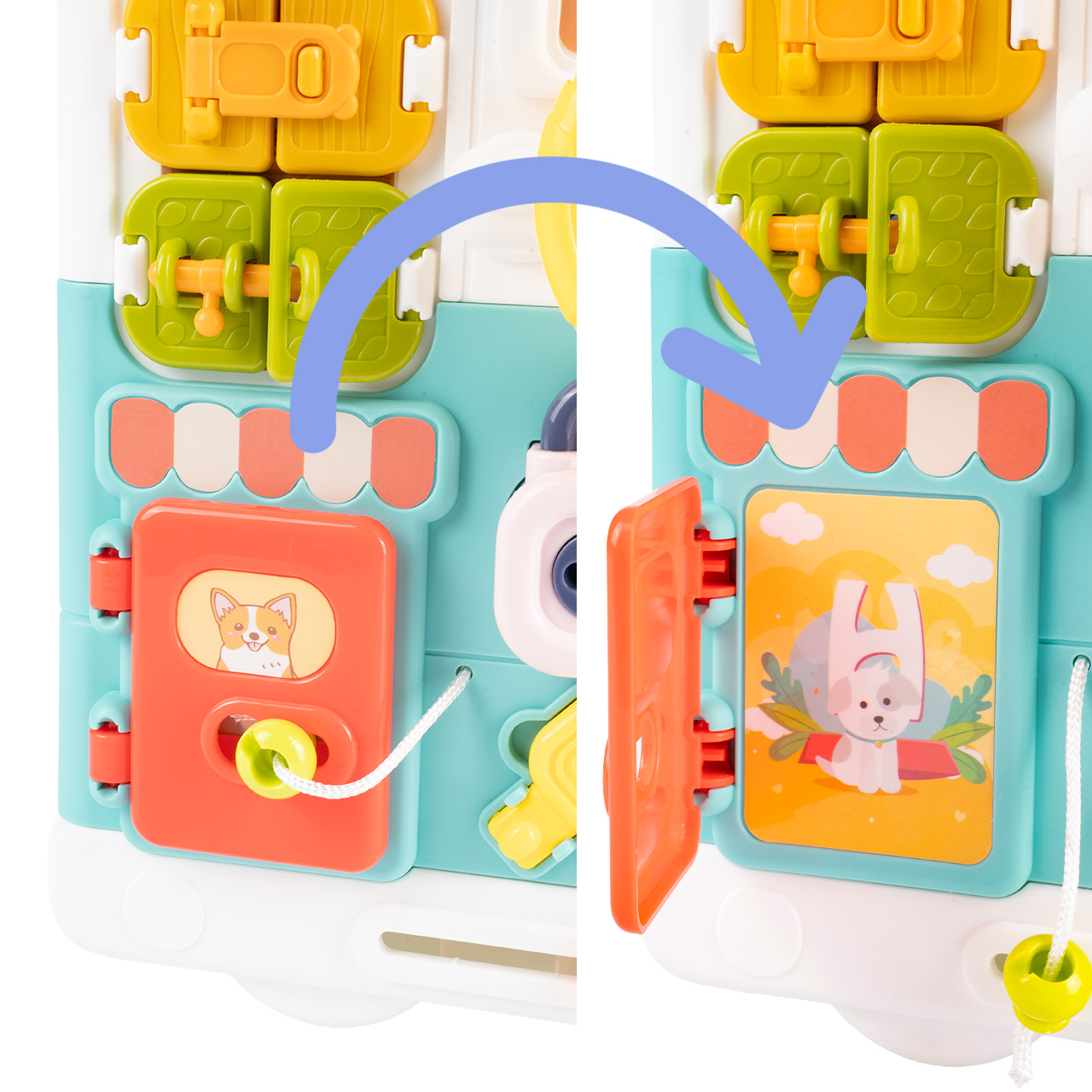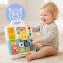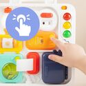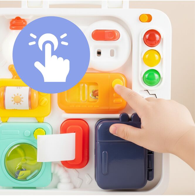 Tablica po rozłożeniu zamienia się w rozbudowane centrum aktywności z wieloma elementami do przesuwania, otwierania, obracania i wciskania. Dzięki temu dziecko może poznawać różne mechanizmy i ćwiczyć koncentrację podczas zabawy.