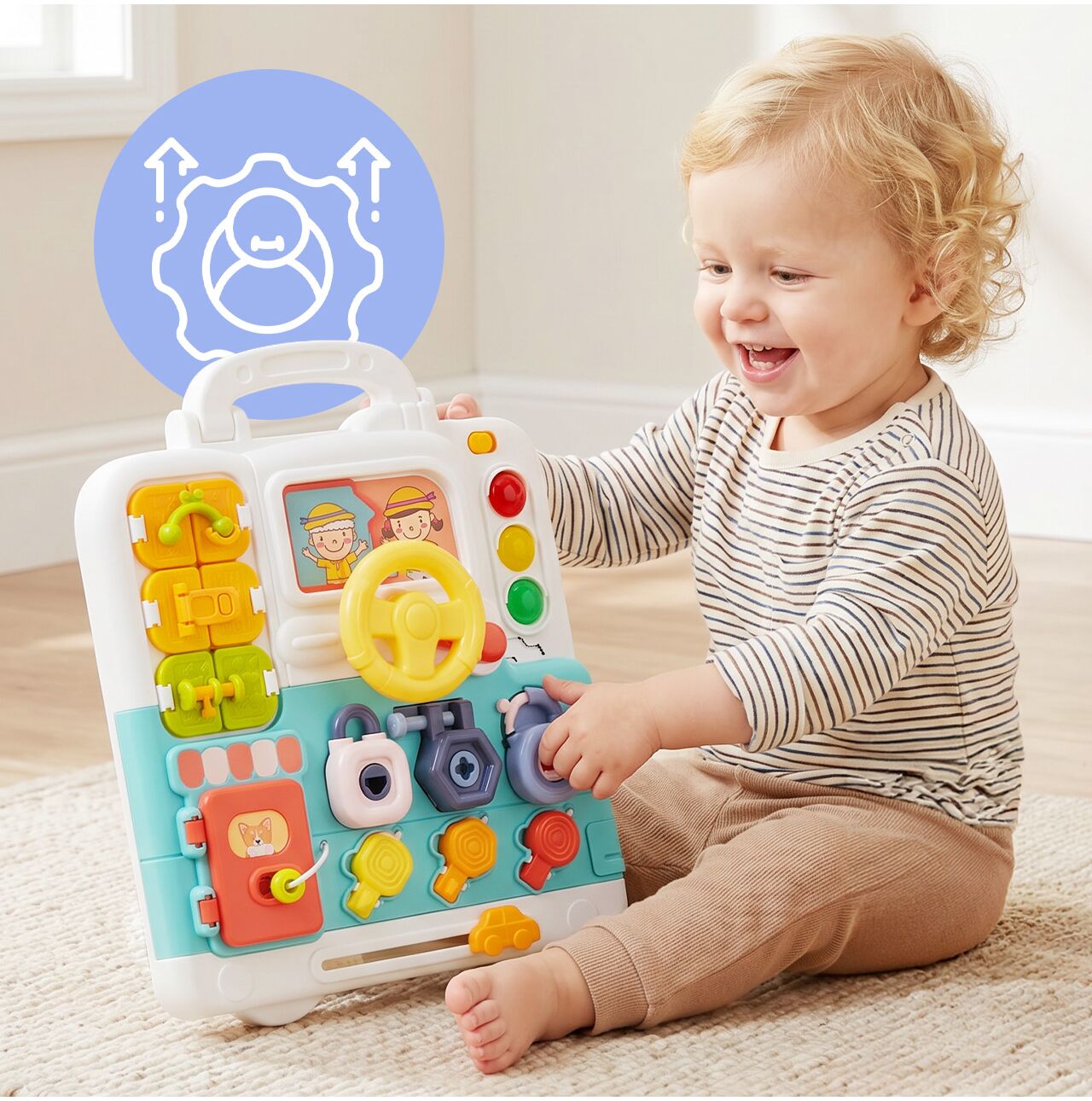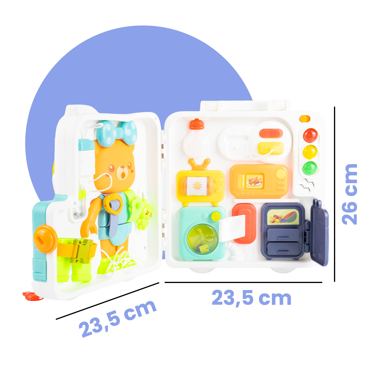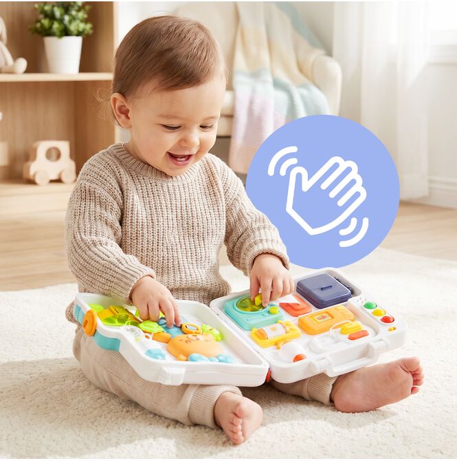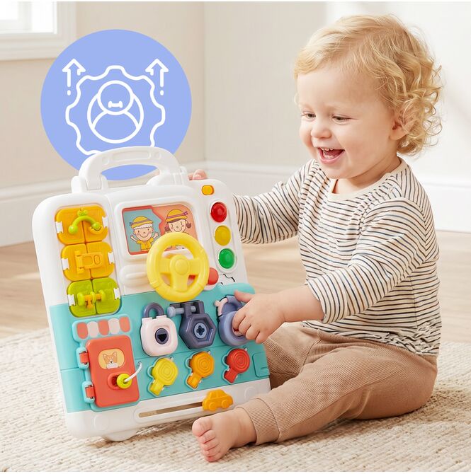 Kompaktowy rozmiar i forma walizeczki z uchwytem sprawiają, że zabawkę łatwo zabrać ze sobą w podróż, do samochodu czy do dziadków. To praktyczna tablica manipulacyjna, która zapewnia rozwijającą zabawę także poza domem.