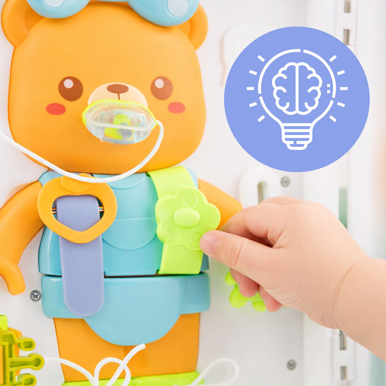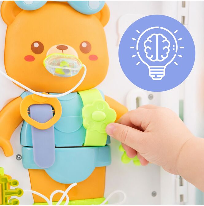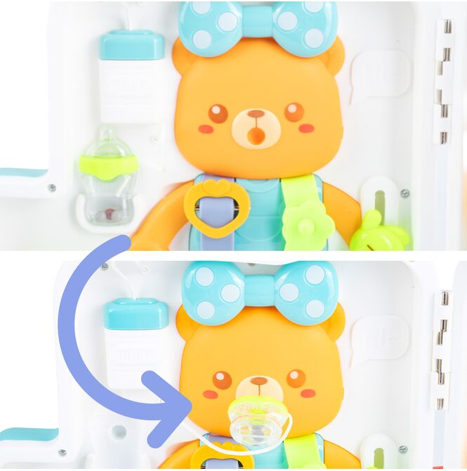 Miś wyposażony jest w akcesoria do odgrywania codziennych sytuacji, takie jak butelka i smoczek na sznurku. Dziecko może ćwiczyć chwytanie, dopasowywanie i samodzielne wykonywanie prostych czynności pielęgnacyjnych.