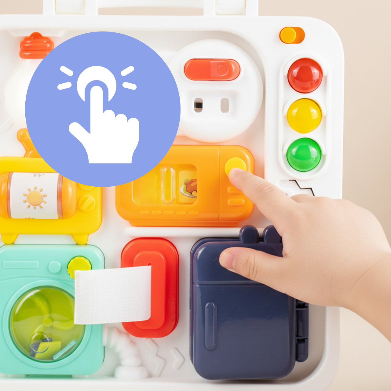 Na prawej stronie znajdują się elementy inspirowane domowymi urządzeniami, takie jak gniazdko, przełącznik, mini pralka, lodówka czy mikrofalówka. Maluch może poznawać codzienne sprzęty w bezpiecznej formie zabawy.