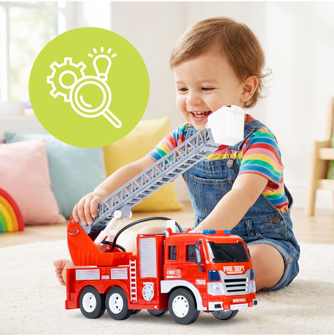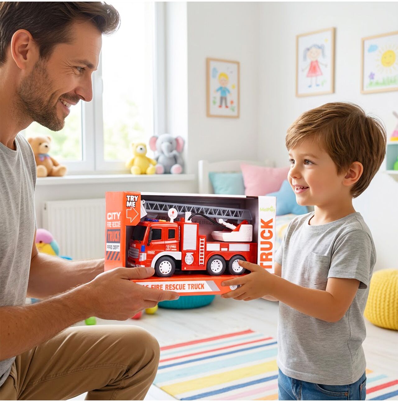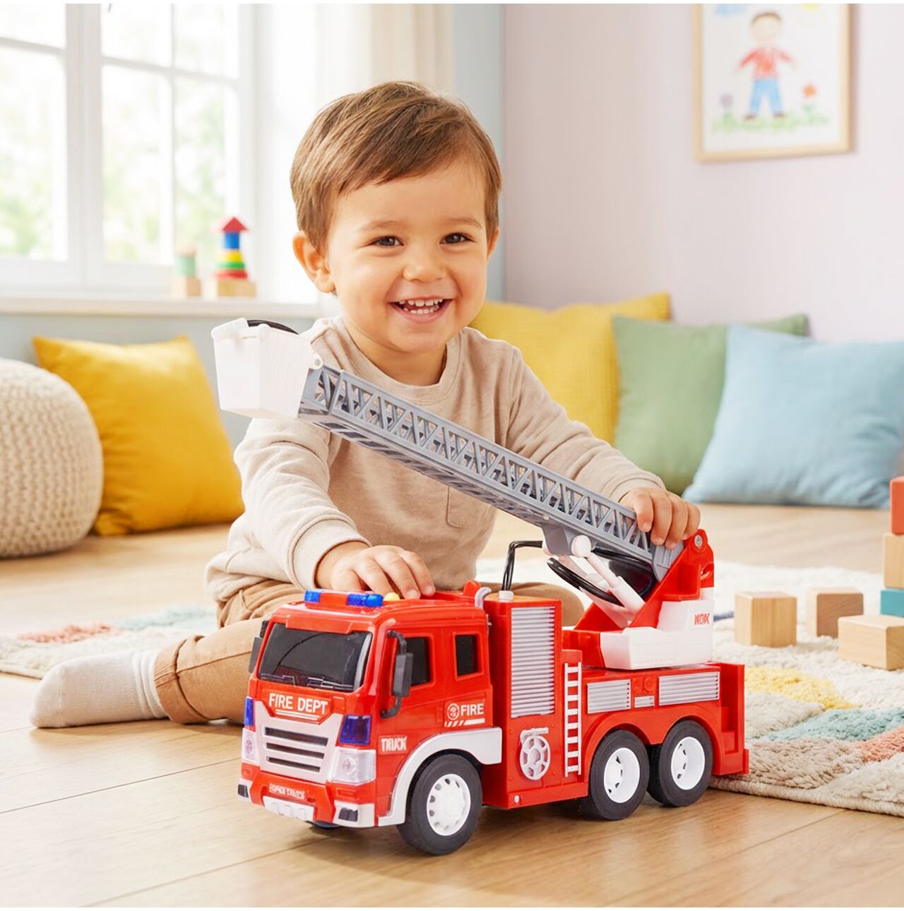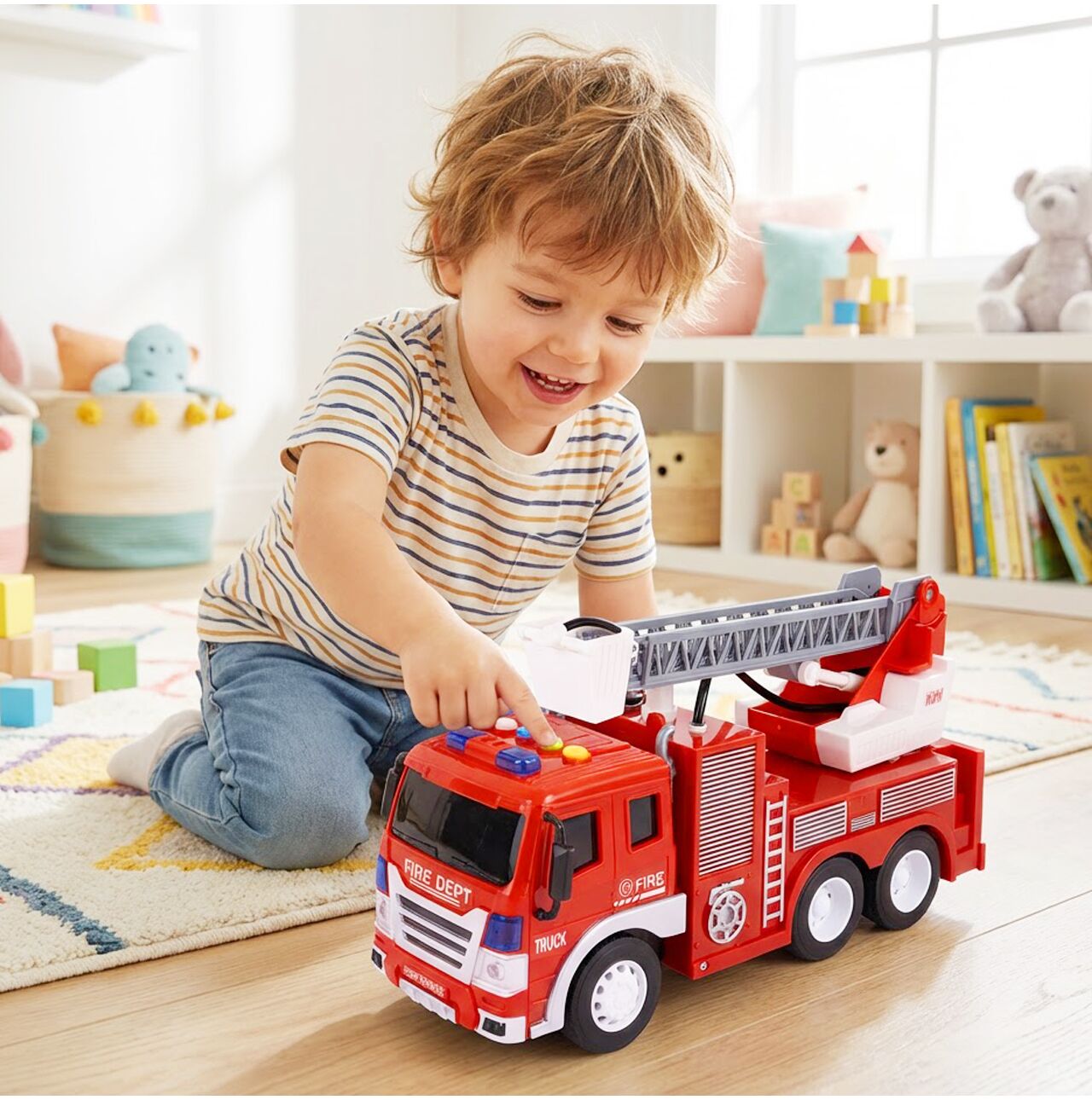 Podnoszona i regulowana drabina z koszem sprawia, że dziecko może odgrywać prawdziwe scenariusze ratownicze. Gaszenie pożaru, ewakuacja misia z szafy, ratunek z wysokości – możliwości są nieograniczone.