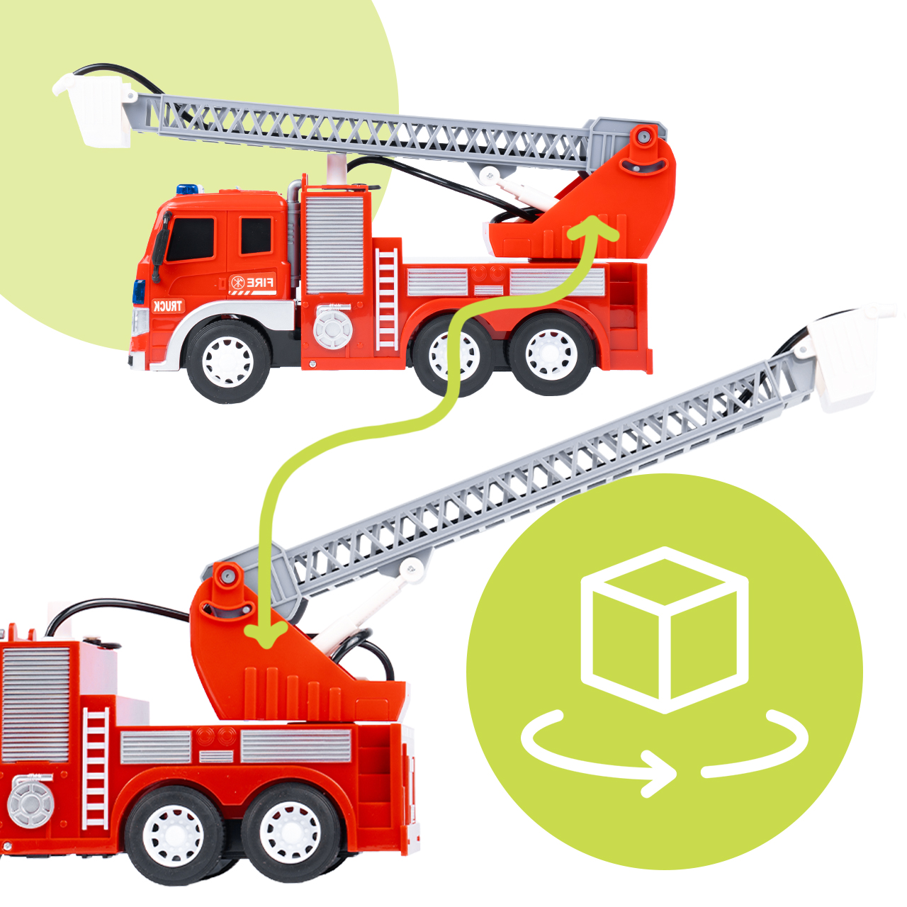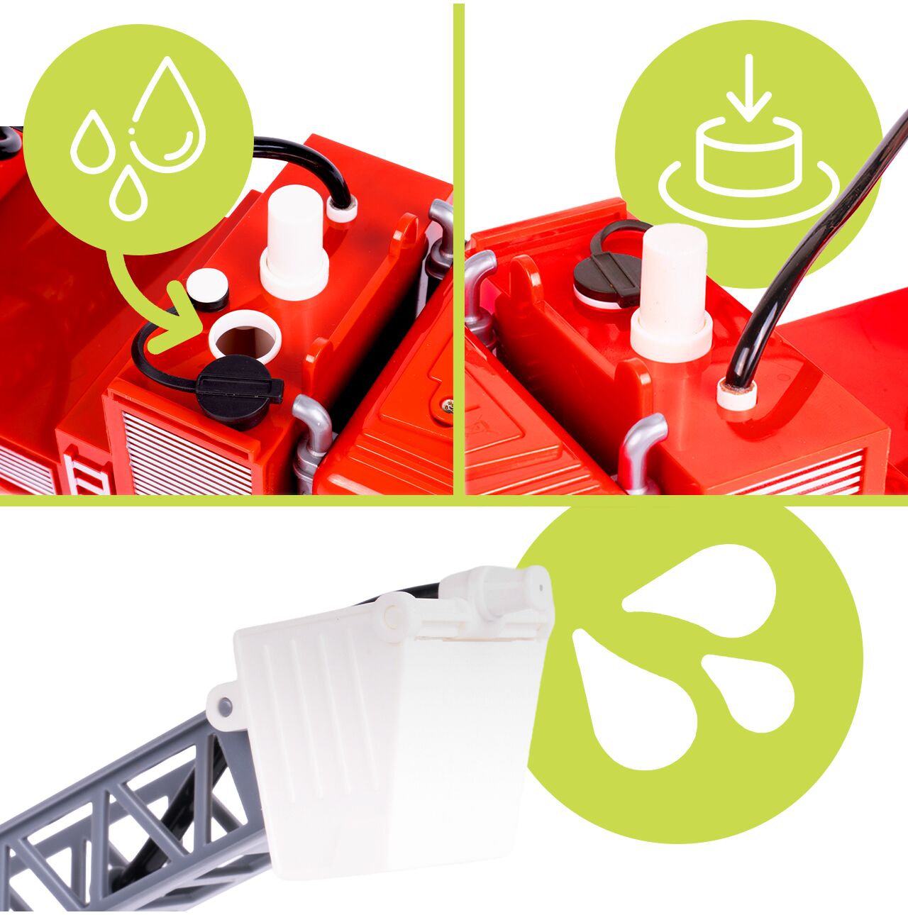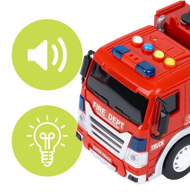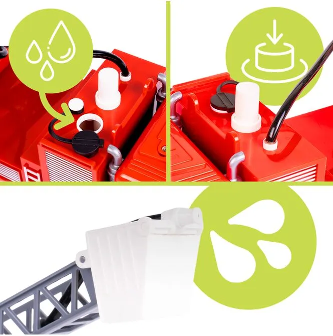 To coś, co naprawdę wyróżnia ten model. Wóz posiada specjalny zbiornik na wodę – wystarczy odkręcić korek, nalać wodę do środka, a następnie nacisnąć pompkę, aby uruchomić funkcję spryskiwania. Z dyszy wydobywa się strumień wody, dzięki czemu dziecko może naprawdę „gasić pożar”, a nie tylko udawać akcję ratunkową.