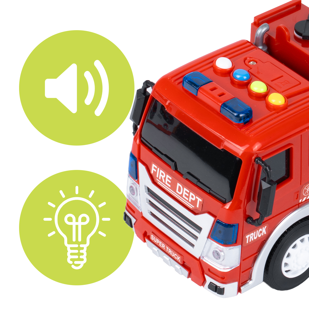 Na dachu znajdują się przyciski aktywujące efekty świetlne i dźwiękowe – sygnały alarmowe jak w prawdziwej straży pożarnej.
