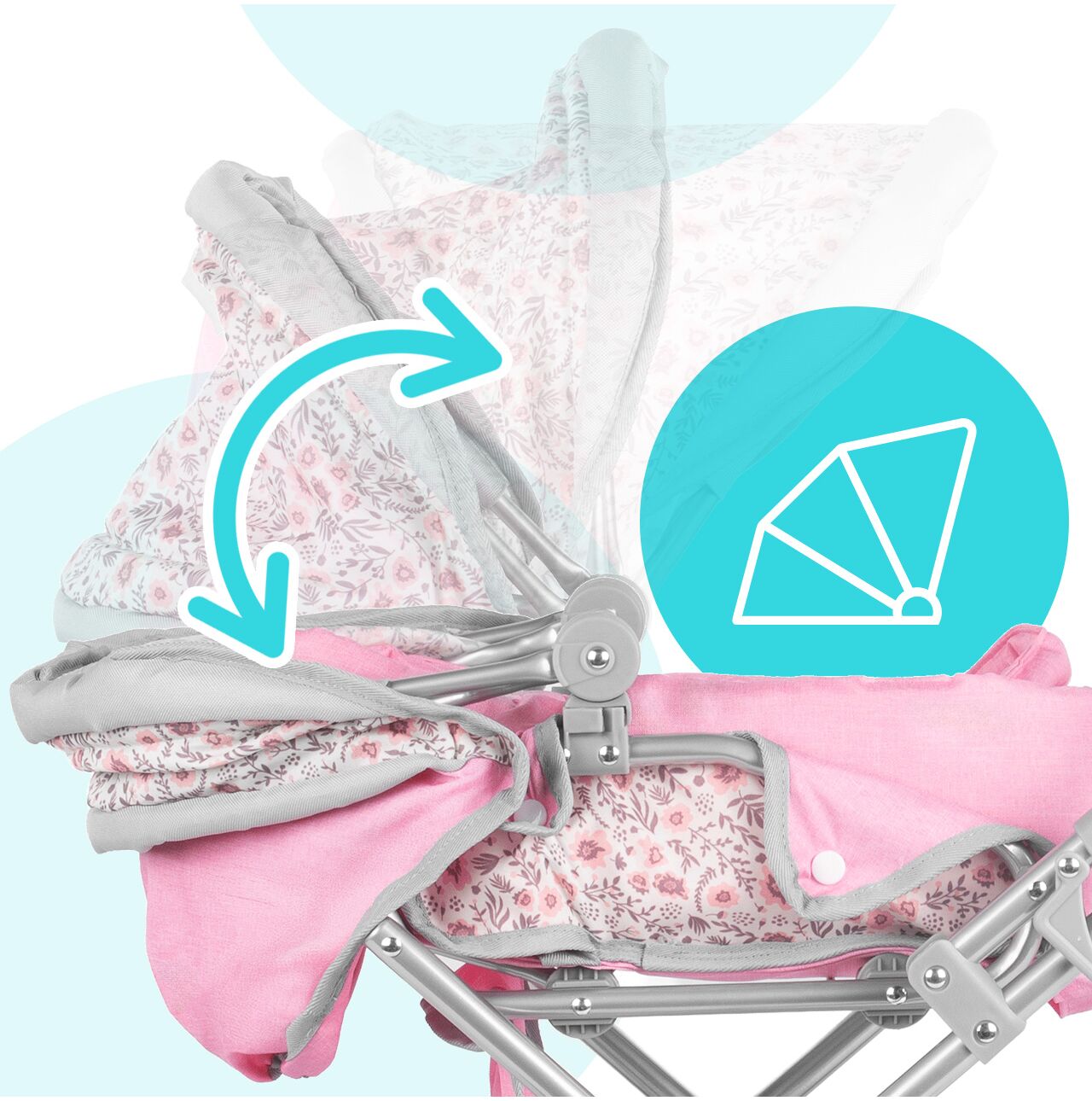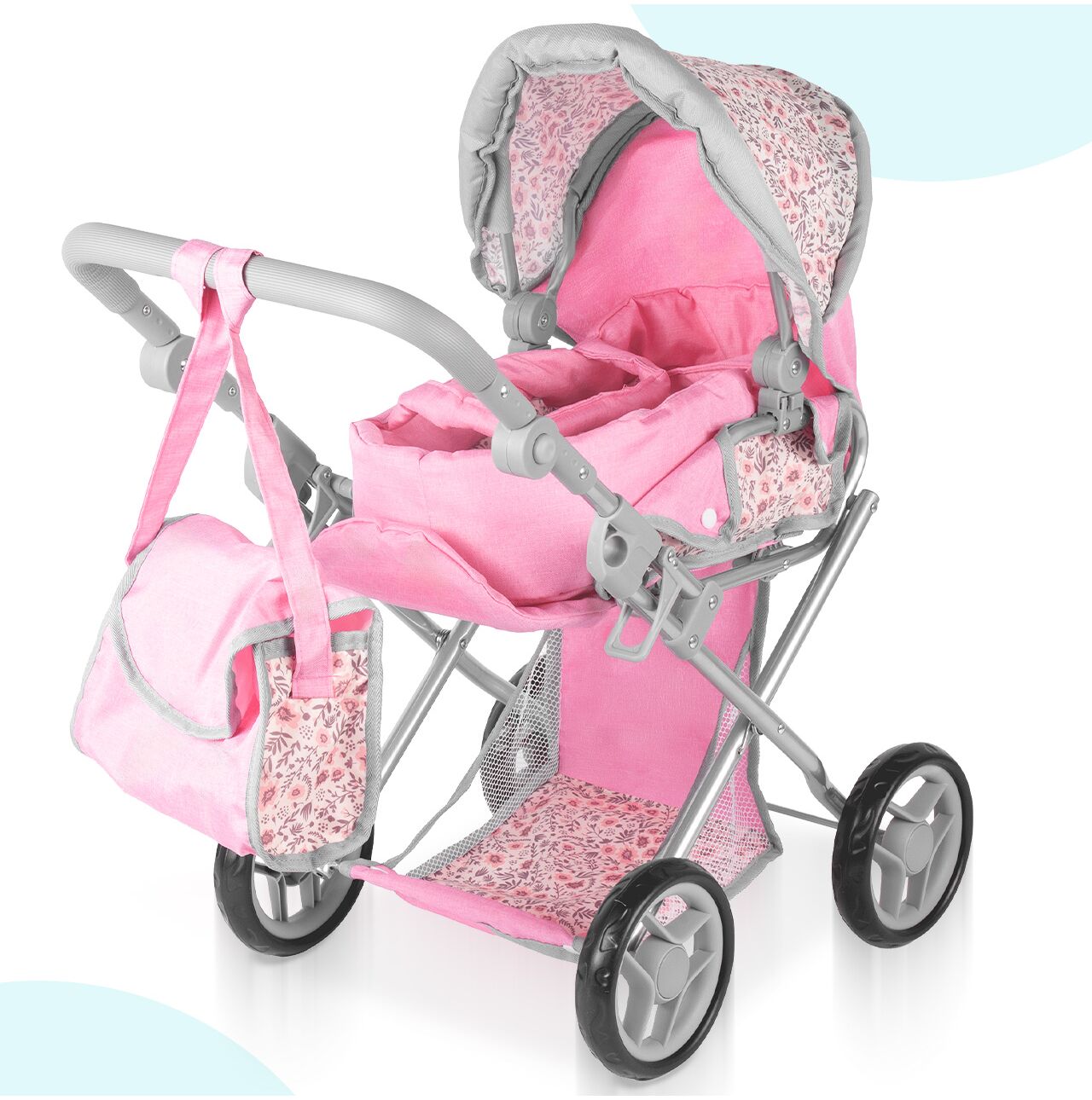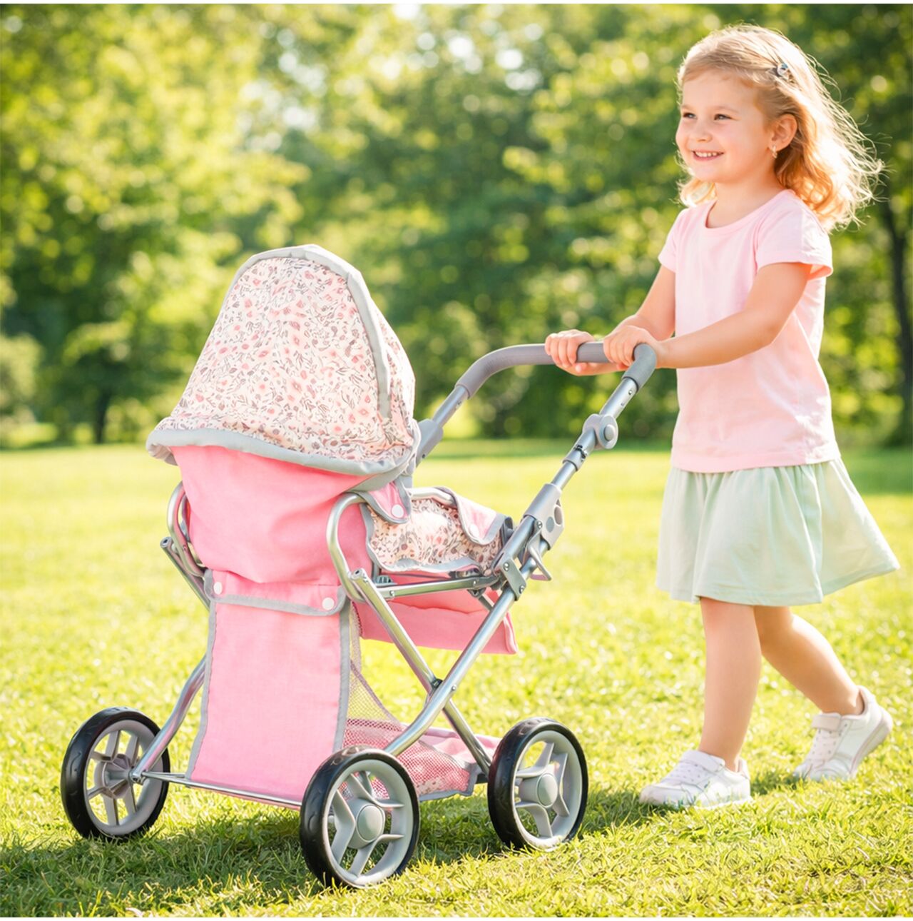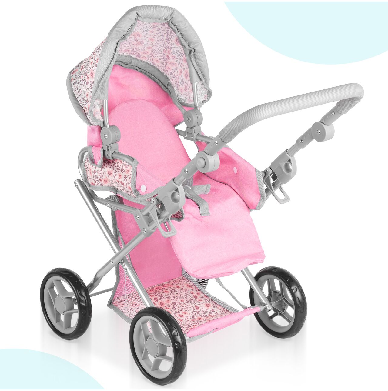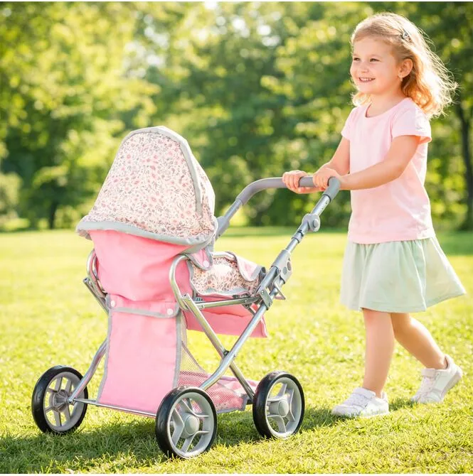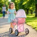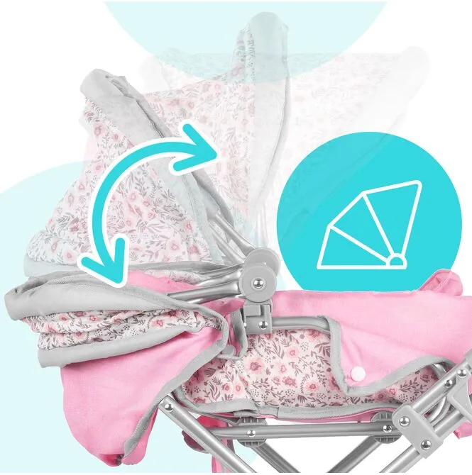 Daszek w wózku Pink Flowers można ustawiać pod różnym kątem, dzięki czemu łatwo dopasować go do scenariusza zabawy: raz osłania lalkę podczas spaceru, innym razem jest bardziej odsunięty, gdy dziecko chce mieć lepszy dostęp do środka. To prosty detal, który mocno podbija realizm, a zabawa płynnie przechodzi między drzemką w gondoli, a aktywnym spacerem.