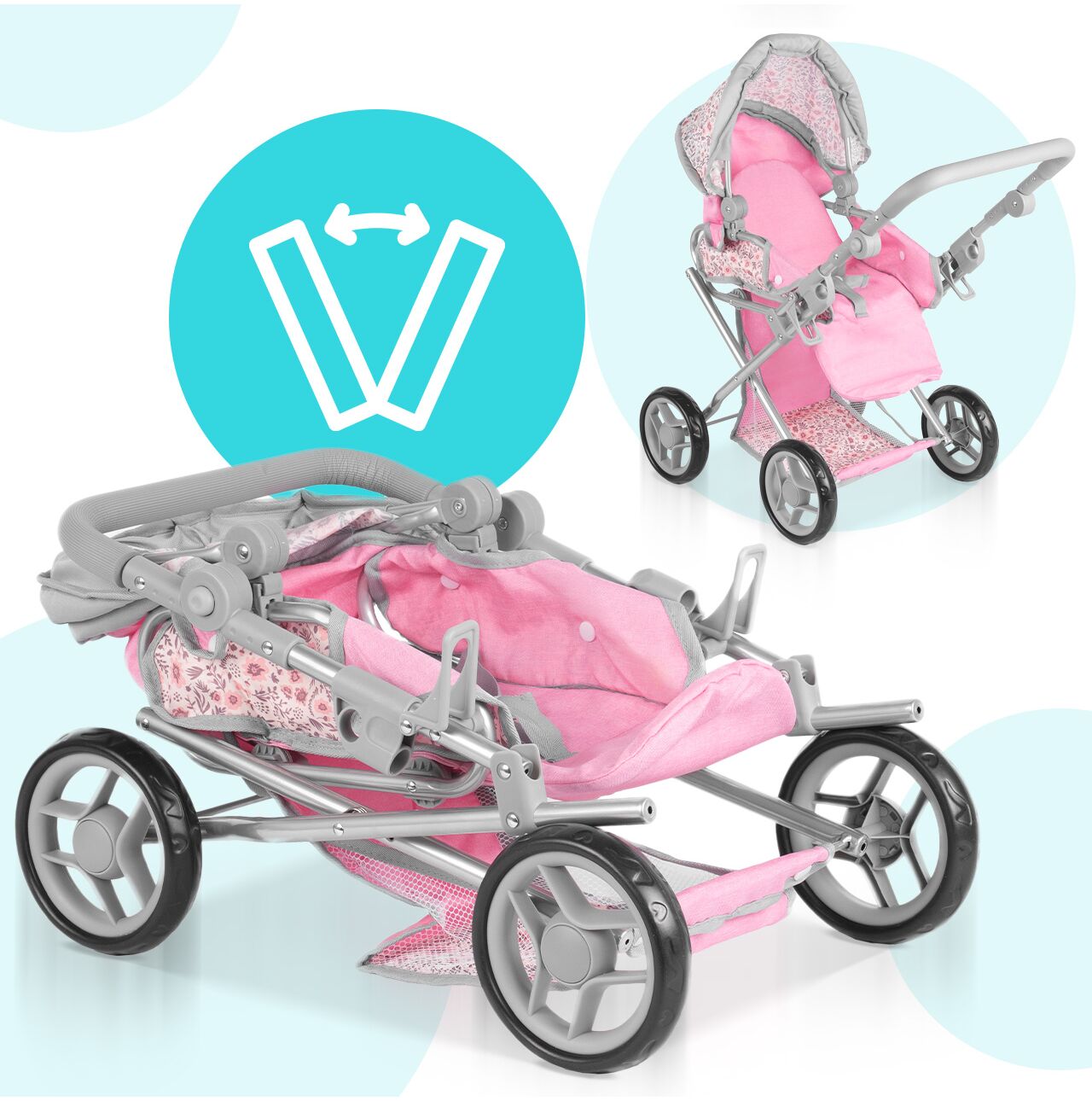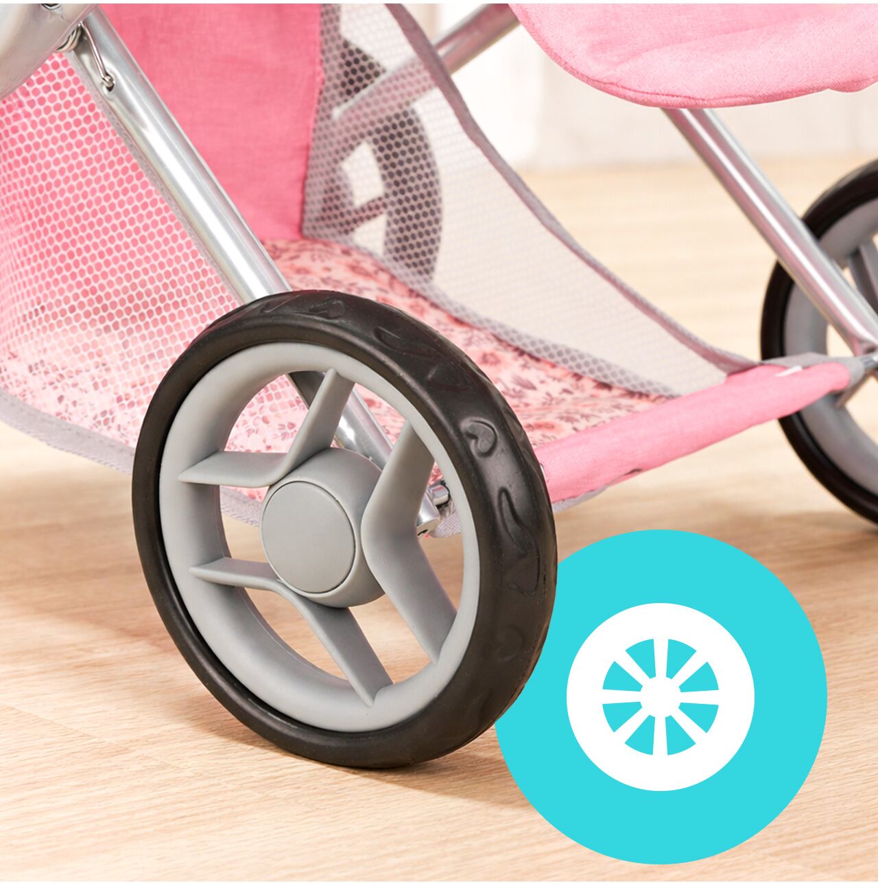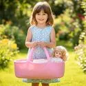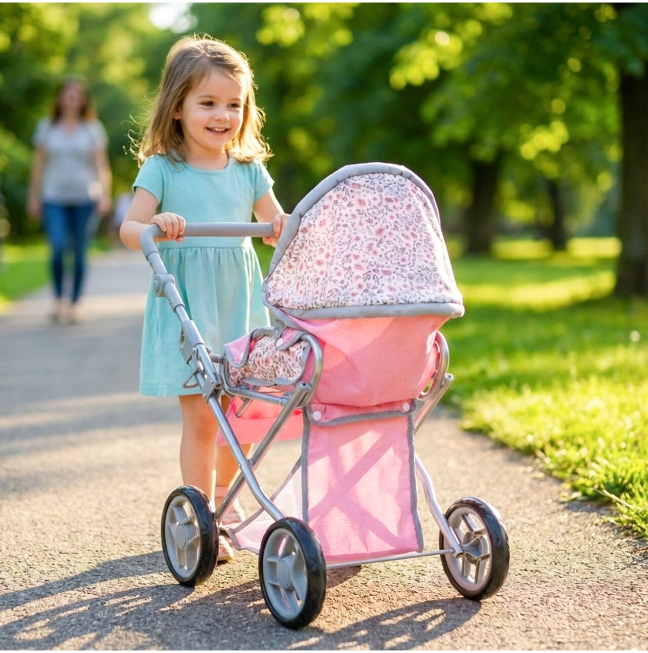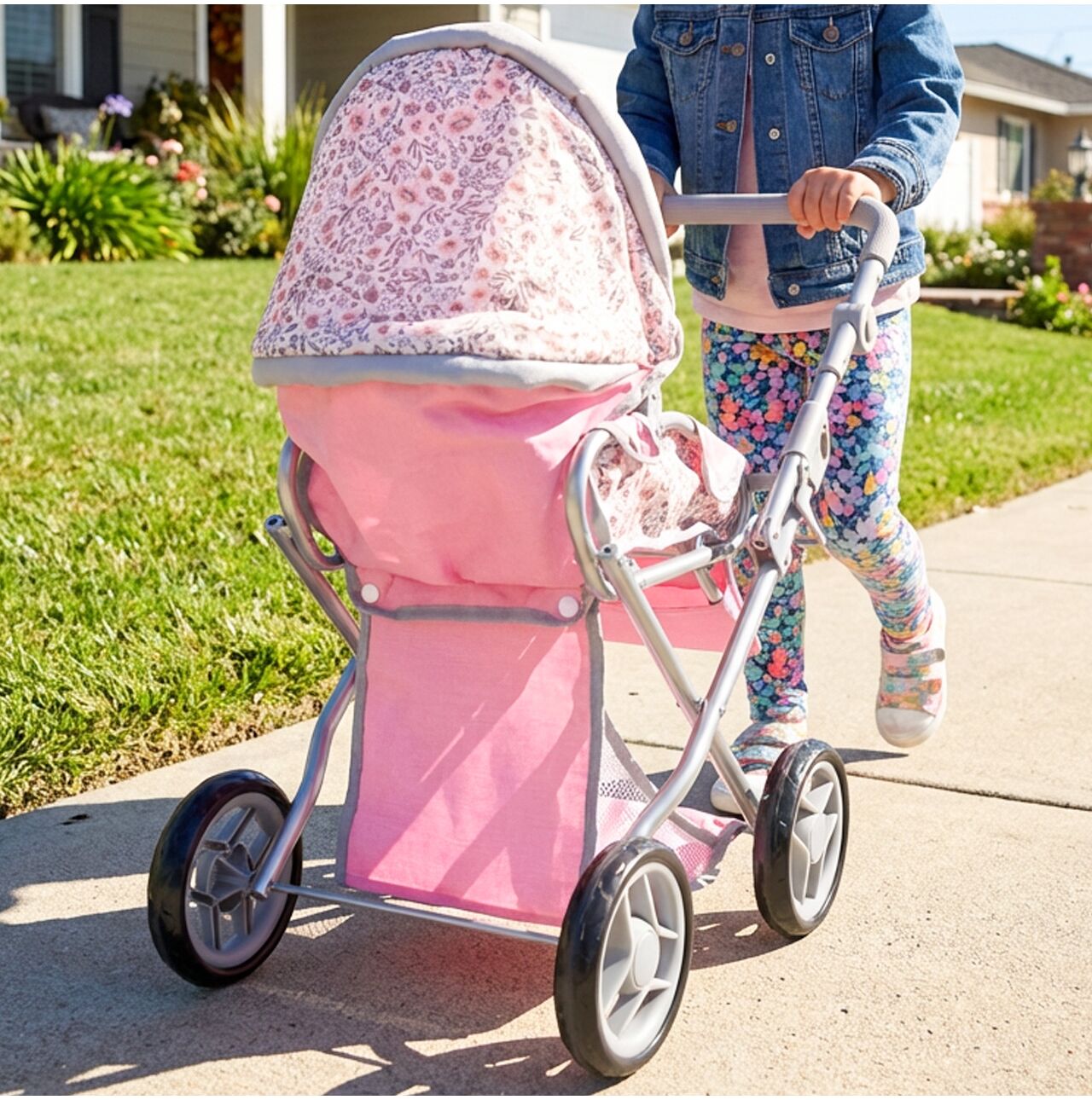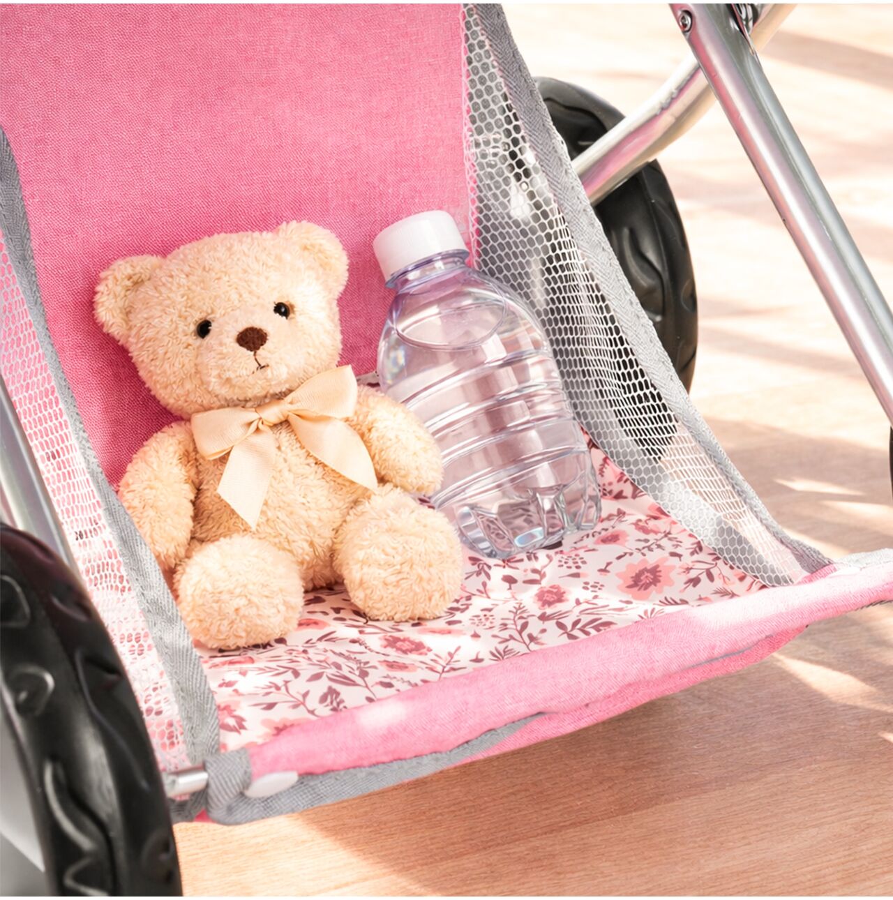 Daszek w wózku Pink Flowers można ustawiać pod różnym kątem, dzięki czemu łatwo dopasować go do scenariusza zabawy: raz osłania lalkę podczas spaceru, innym razem jest bardziej odsunięty, gdy dziecko chce mieć lepszy dostęp do środka. To prosty detal, który mocno podbija realizm, a zabawa płynnie przechodzi między drzemką w gondoli, a aktywnym spacerem.