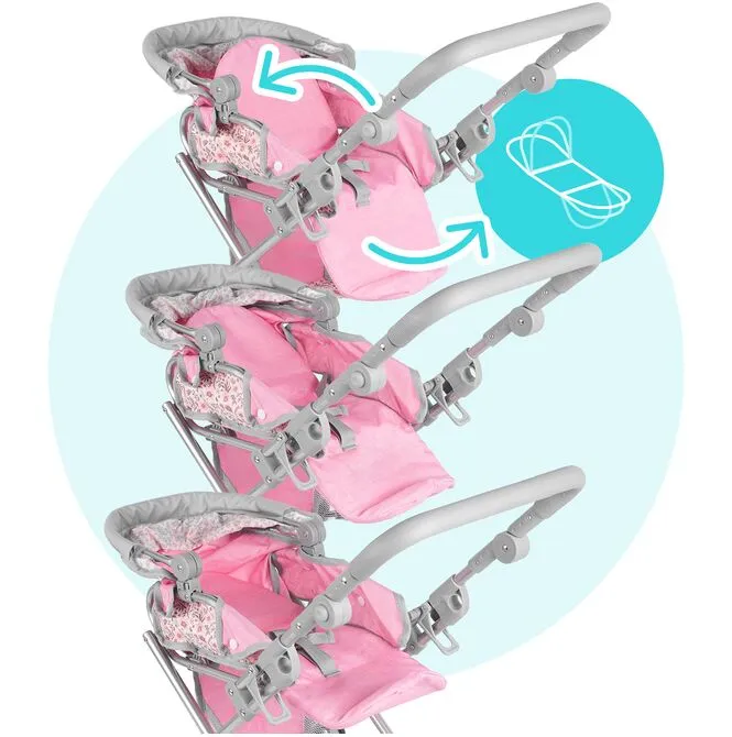 Pink Flowers 3w1 jest po to, żeby zabawa nie urywała się w pół zdania. To wózek, który przestawia się pod pomysł dziecka, a nie odwrotnie.