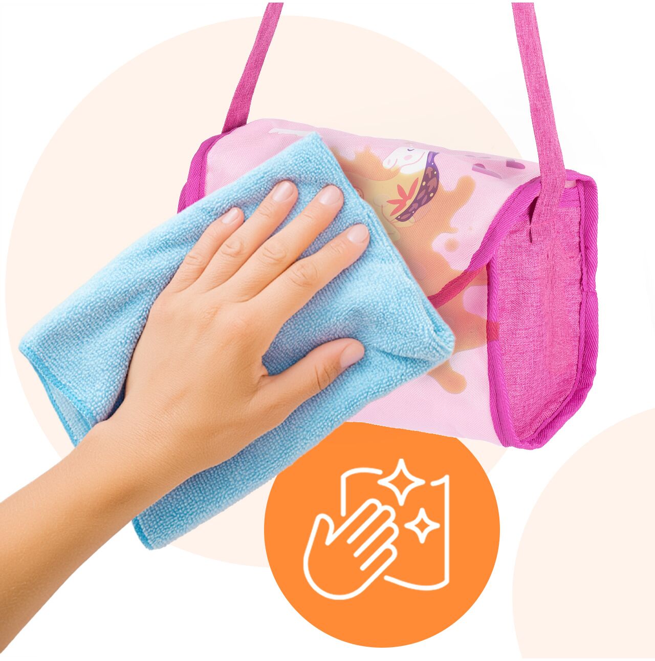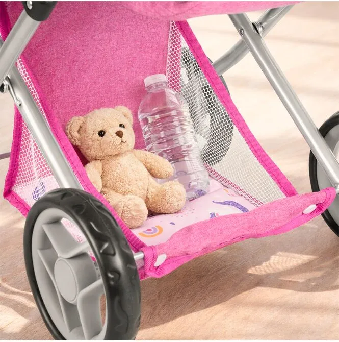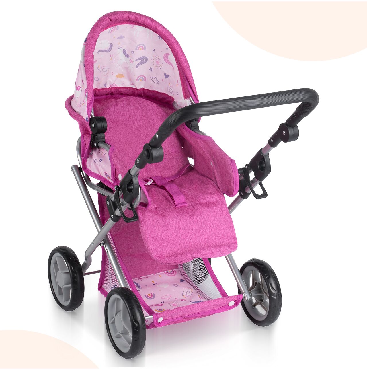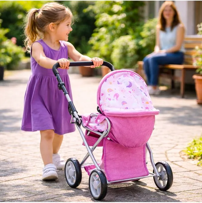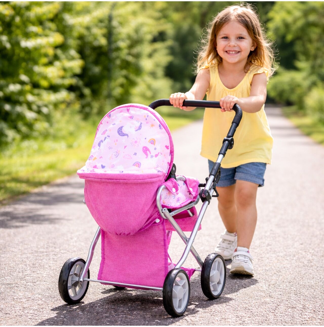 Daszek w wózku Unicorns można ustawiać pod różnym kątem, dzięki czemu łatwo dopasować go do scenariusza zabawy: raz osłania lalkę podczas spaceru, innym razem jest bardziej odsunięty, gdy dziecko chce mieć lepszy dostęp do środka. To prosty detal, który mocno podbija realizm, a zabawa płynnie przechodzi między drzemką w gondoli, a aktywnym spacerem.