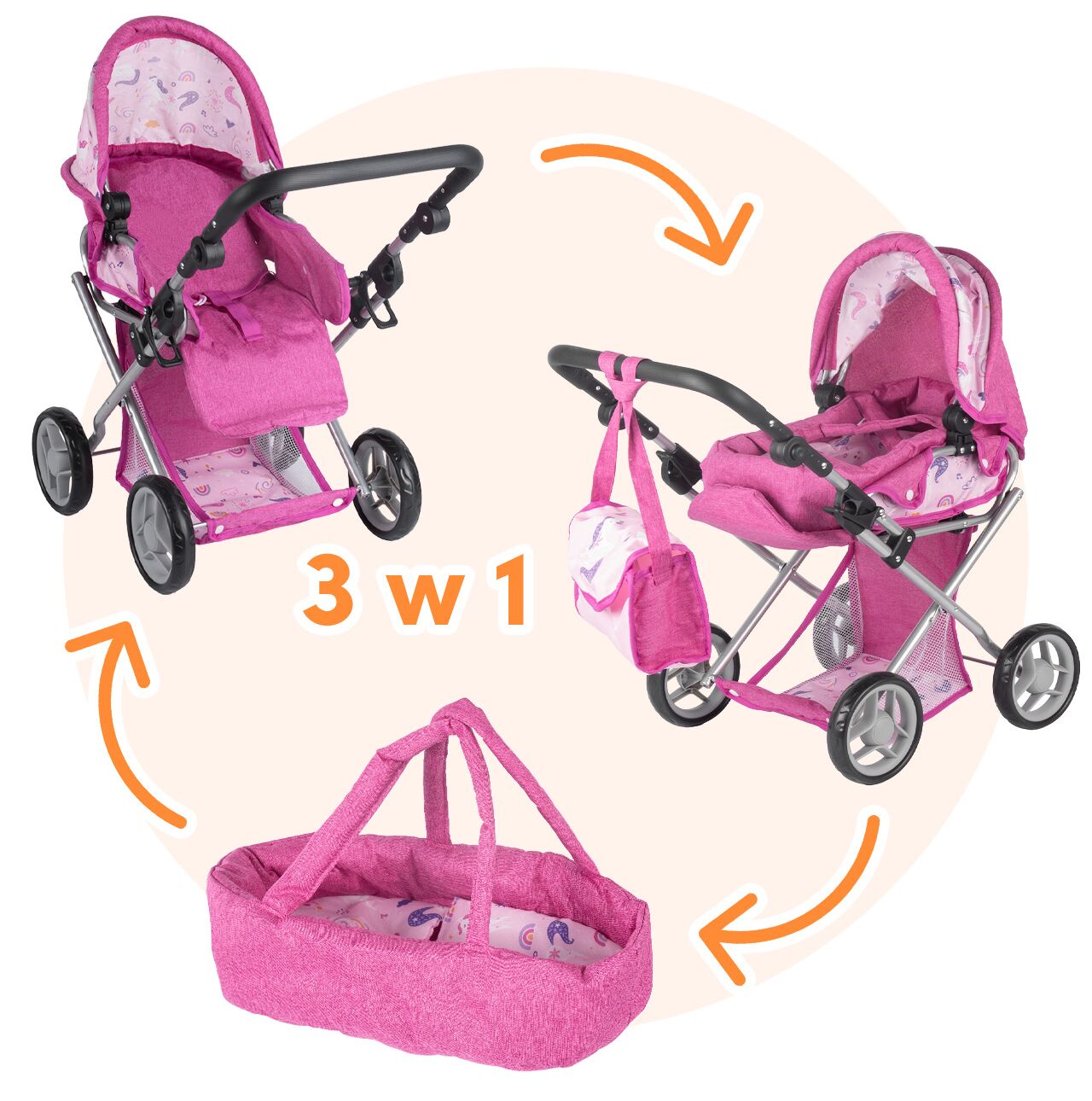 - wózek 3w1 dla lalek: gondola + spacerówka + nosidełko